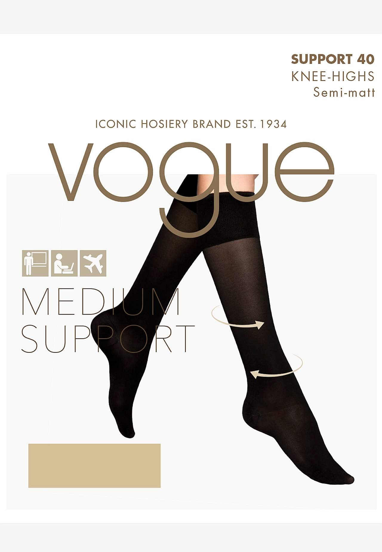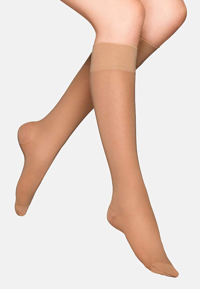 Mukavat polvisukat keskikiinteällä tuella. Kompressio pitää jalat kevyen tuntuisina koko päivän. Yhtä mukavat kotona kuin matkallakin. Mukava leveä joustinnauha ylhäällä. Vahvistettu kärki ja kantapää. Normaali istuvuus. Puolihimmeä viimeistely. 40 denier.