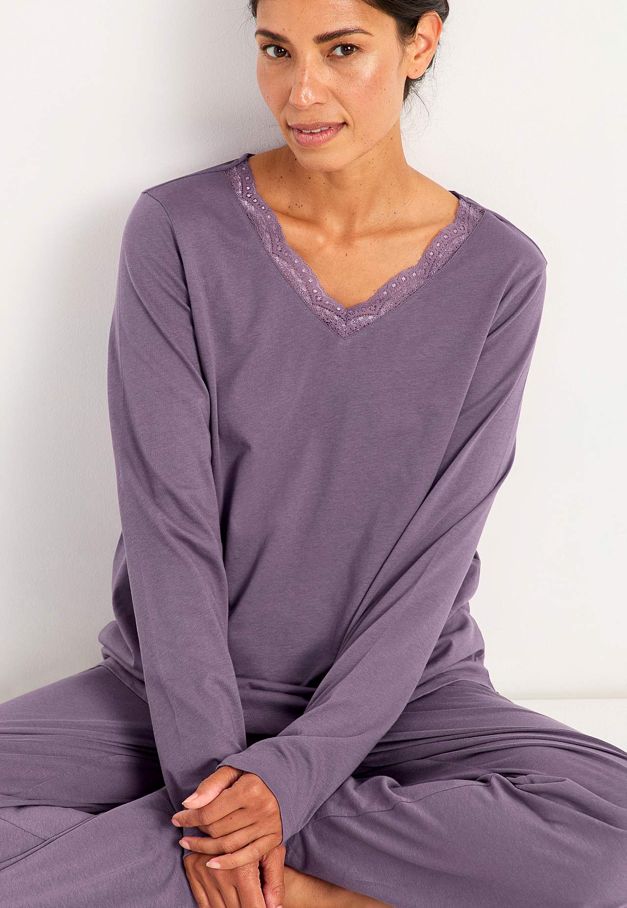 Normaali istuvuus. Yläosa: Yksivärinen pyjamapaita v-pääntiellä ja pehmeällä pitsireunalla. Pituus olkapäältä koon mukaan noin 67-75 cm.