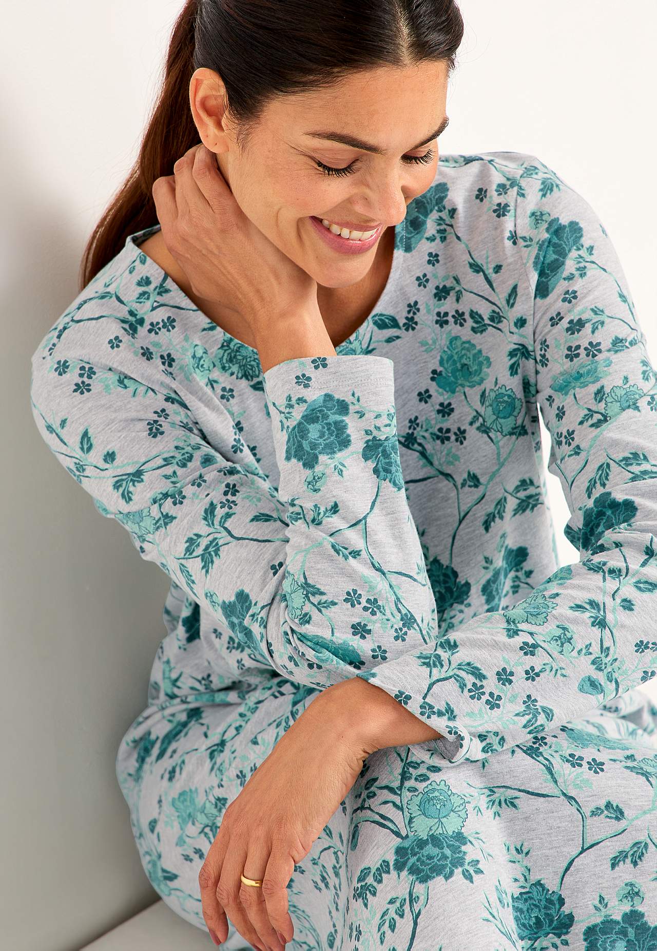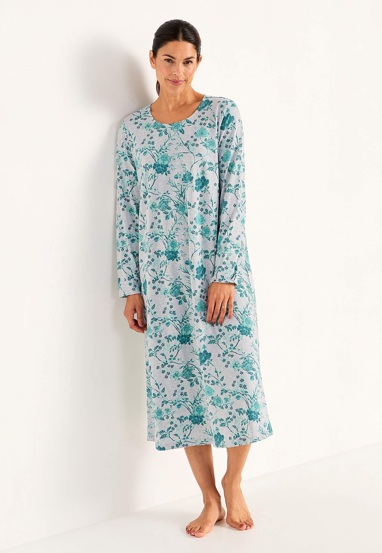 Pehmeä yömekko luomupuuvillasta. Suora istuvuus. Pyöreä pääntie. Pitkät hihat. Suora helma. Pitkä malli painetulla kukkakuviolla. Pituus olalta n. 119 cm kaikissa kooissa.