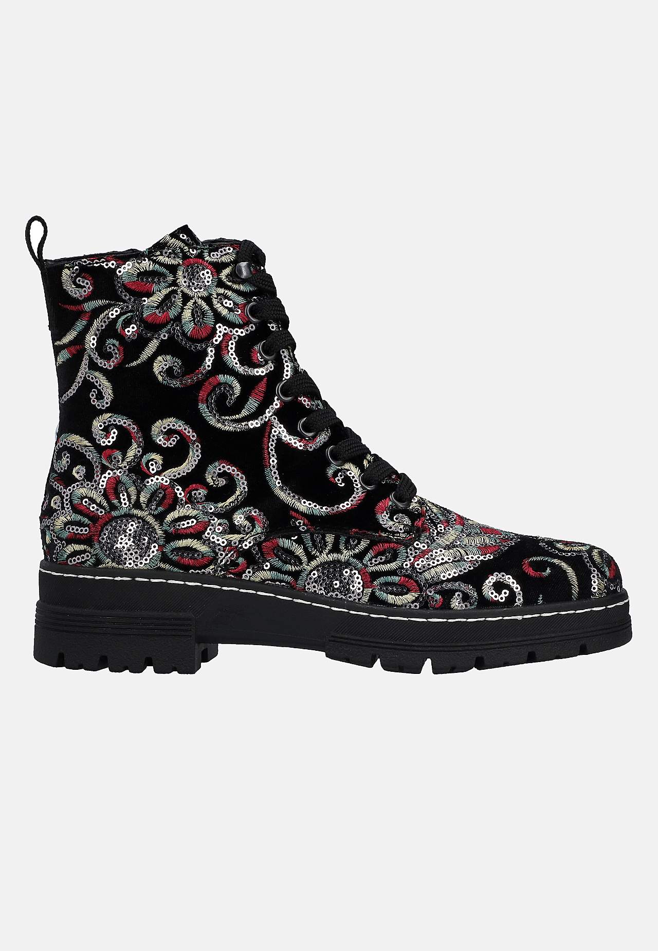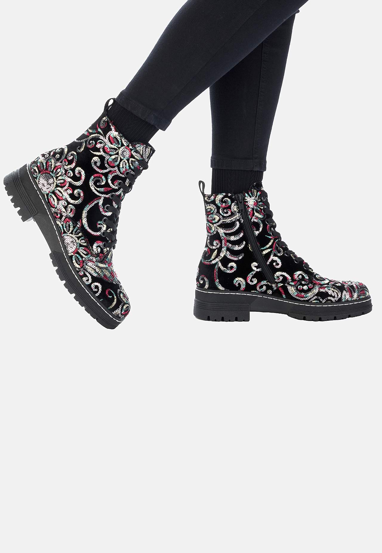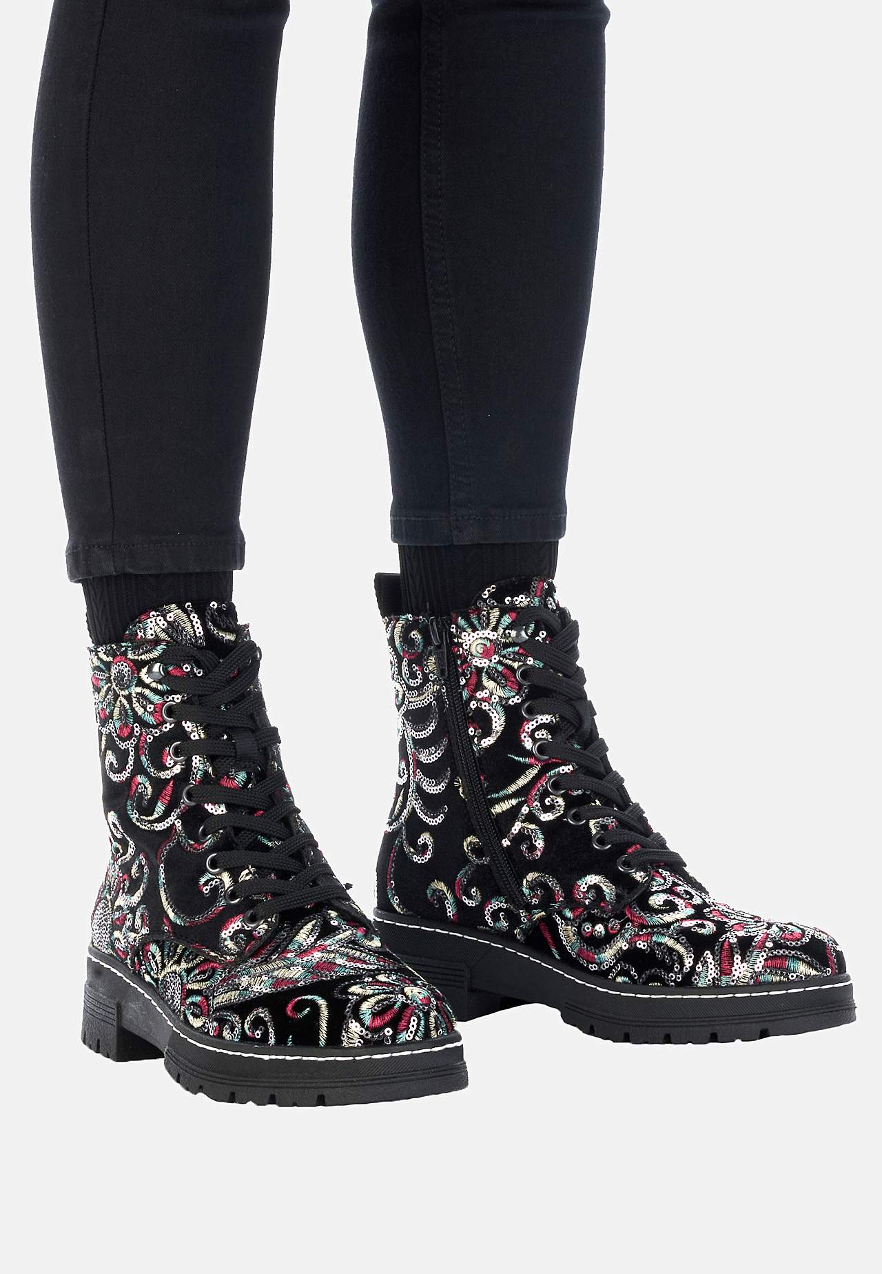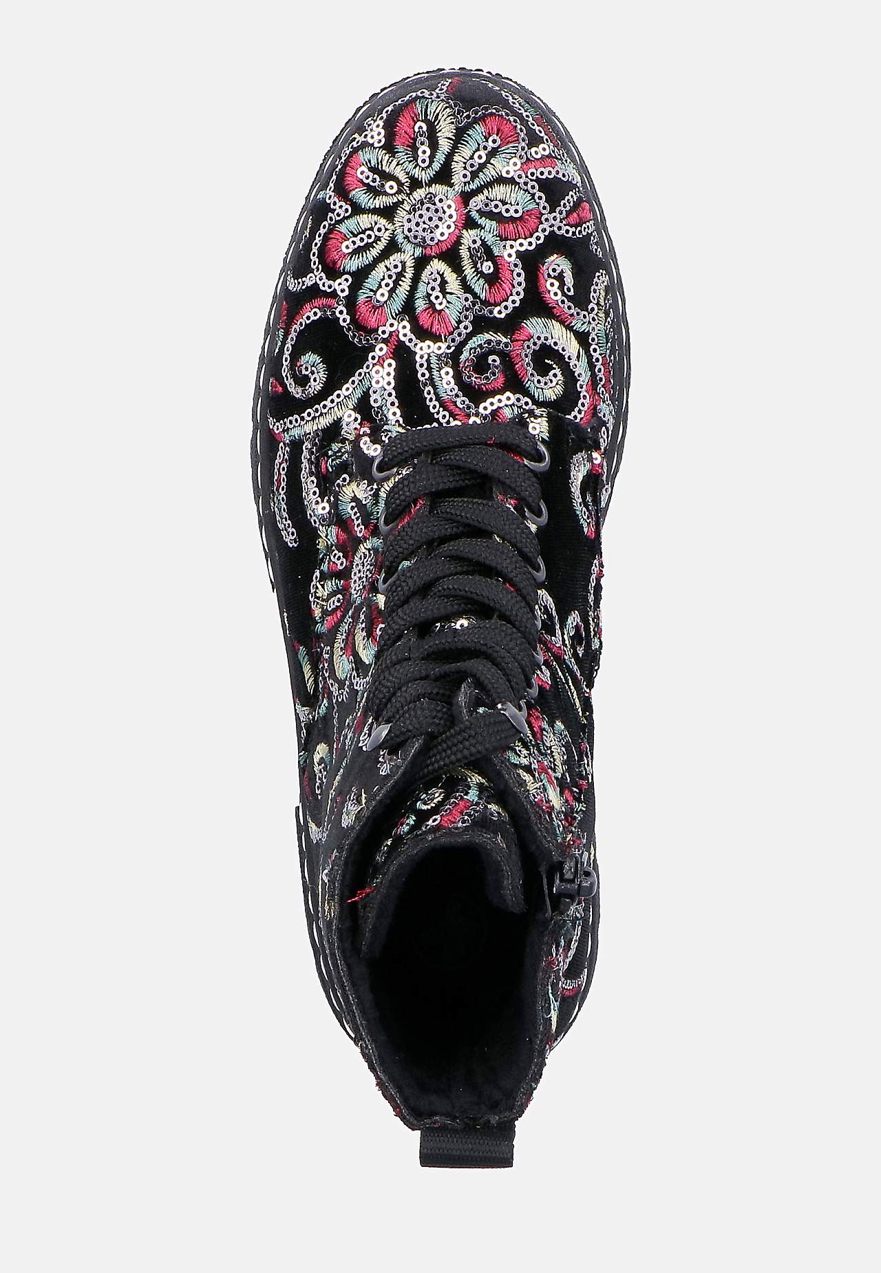 Varsikenkä sametista paljeteilla ja kukkakuvioinen kirjonta. Säädettävä varrenleveys nyörityksellä. Vetoketju sisäpuolella helppoa pukemista ja riisumista varten. Vetolenkki takana. Ohut, pehmeä fleecevuori. Irrotettava sisäpohja. Ulkopohja hyvällä pidolla. Antistress: Katso alta. RiekerTEX: Katso alta. Päällinen tekstiili... Lue lisää