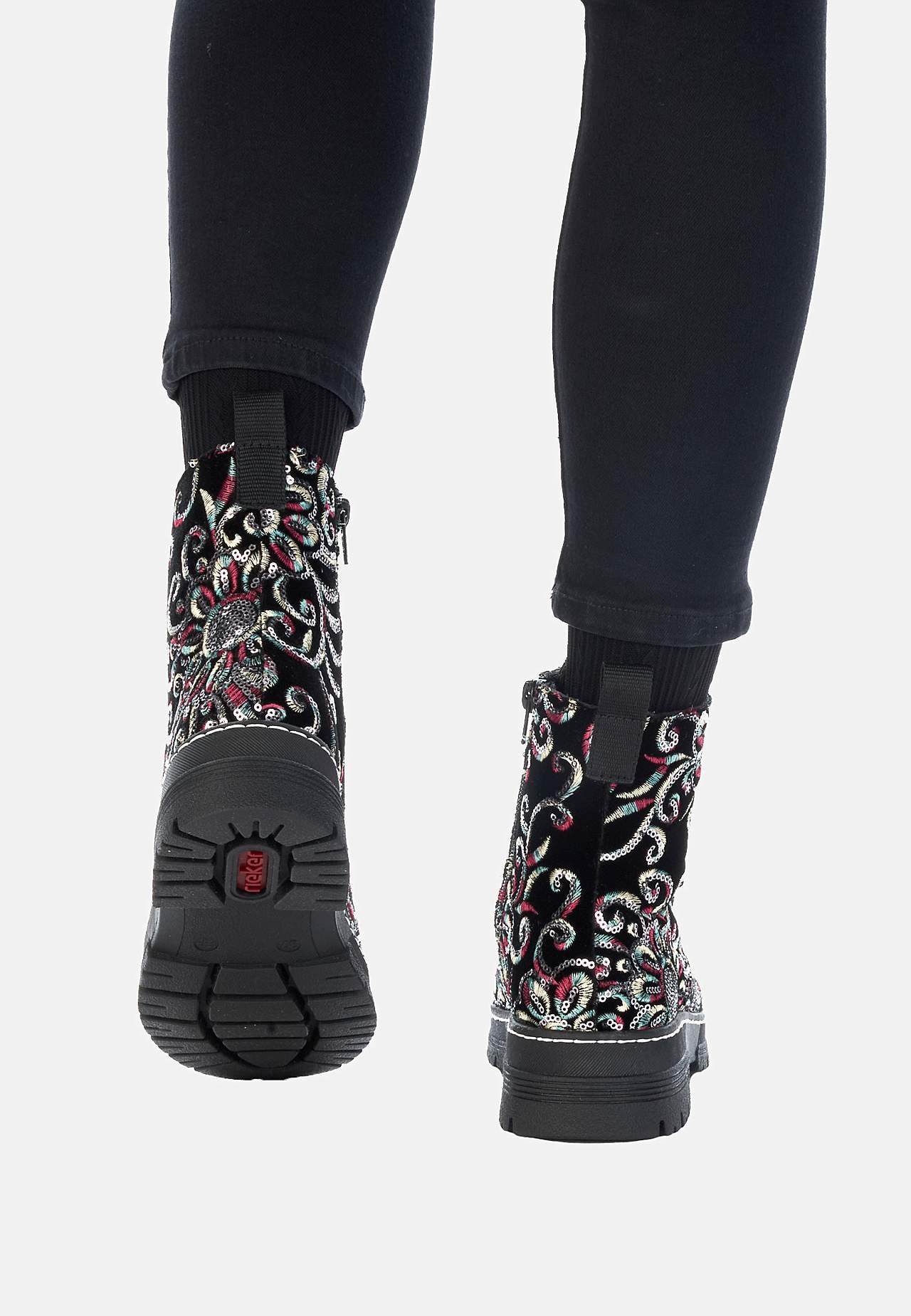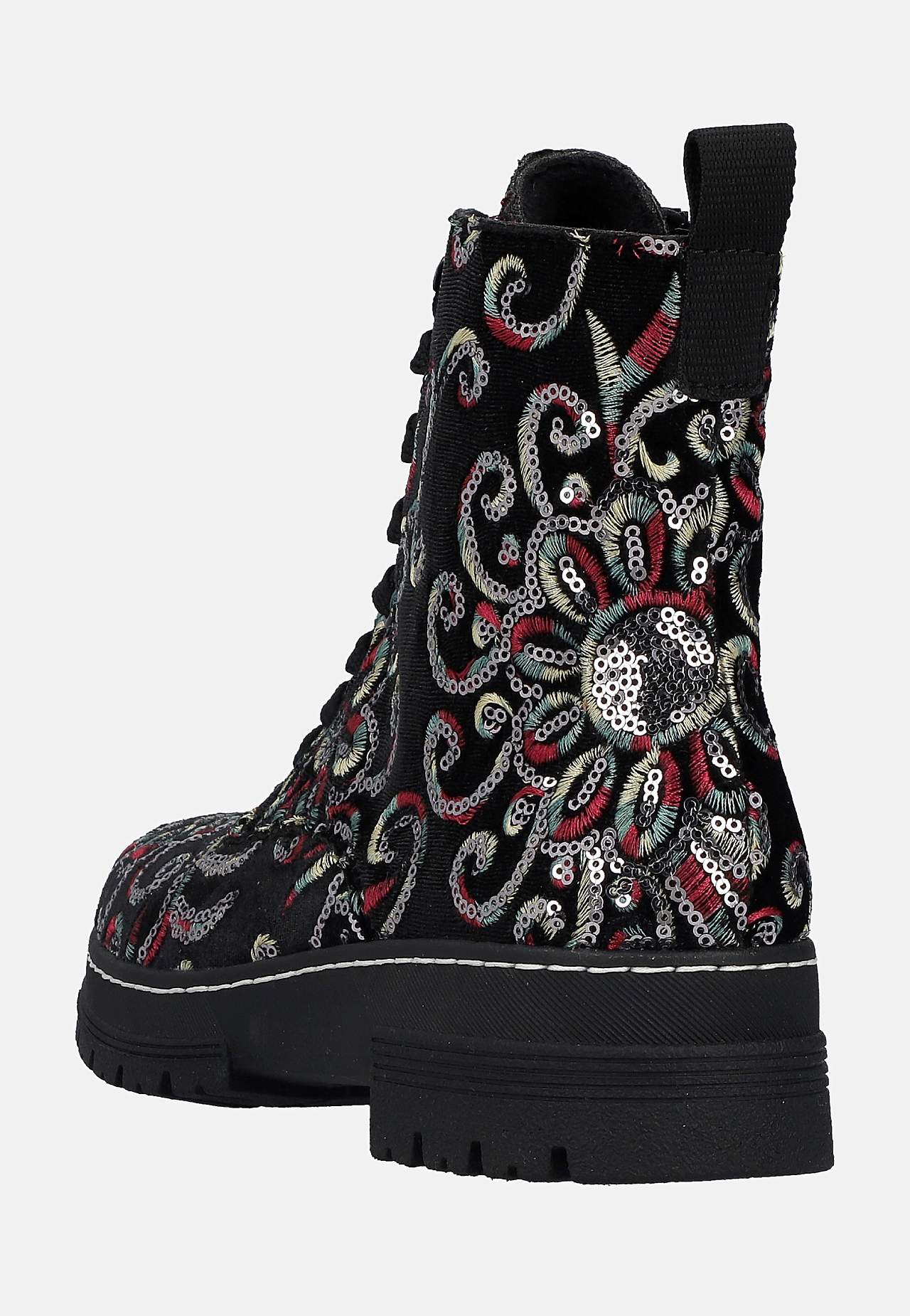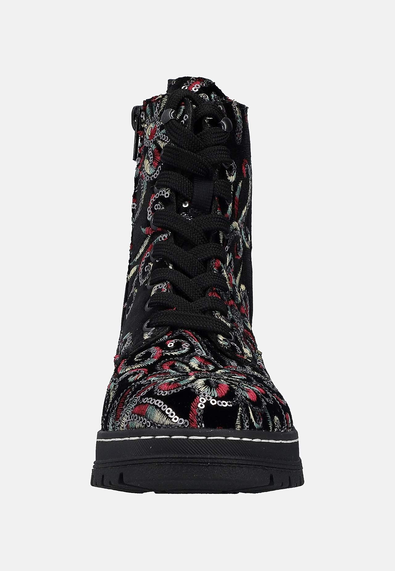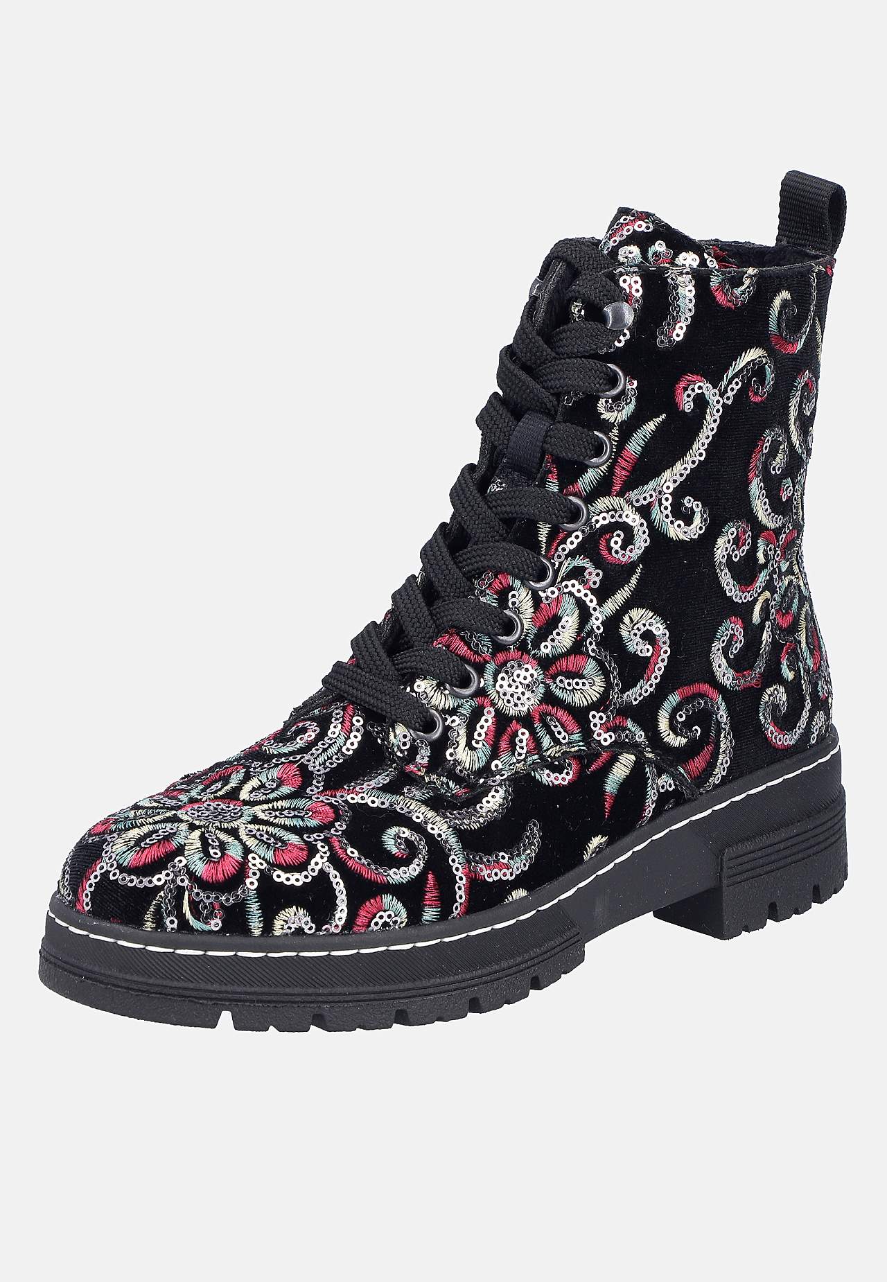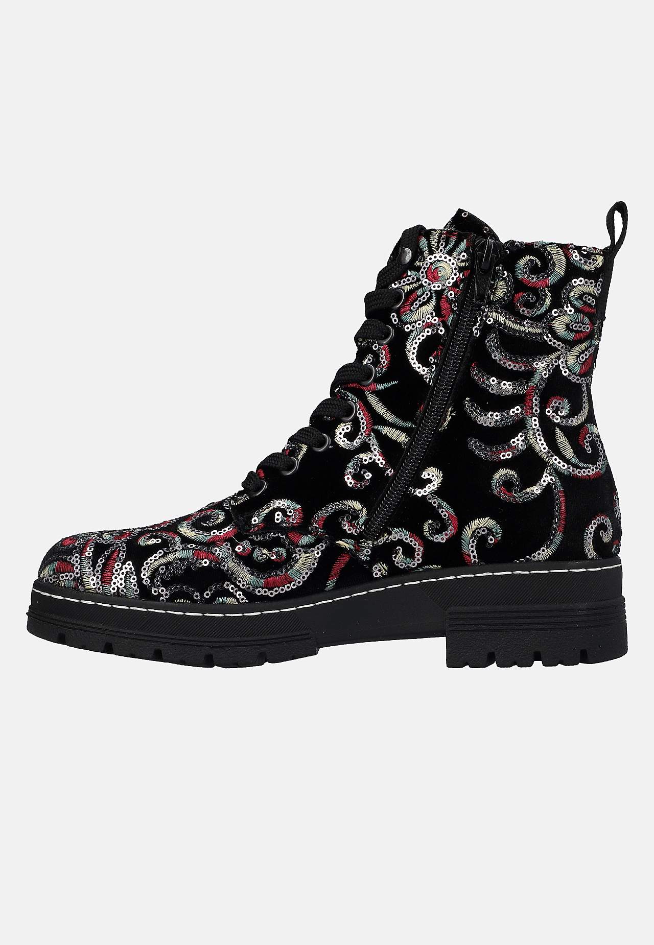 Varsikenkä sametista paljeteilla ja kukkakuvioinen kirjonta. Säädettävä varrenleveys nyörityksellä. Vetoketju sisäpuolella helppoa pukemista ja riisumista varten. Vetolenkki takana. Ohut, pehmeä fleecevuori. Irrotettava sisäpohja. Ulkopohja hyvällä pidolla. Antistress: Katso alta. RiekerTEX: Katso alta. Päällinen tekstiili... Lue lisää