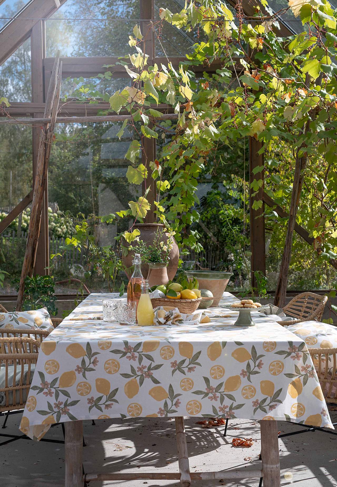 Pöytäliina ihanalla sitruunakuviolla ja pienet kukat terälehdellä. Sileä materiaali kierrätetystä puuvillasta ja polyesterista. Helma kaikkialla. Koko: 140x300 cm.