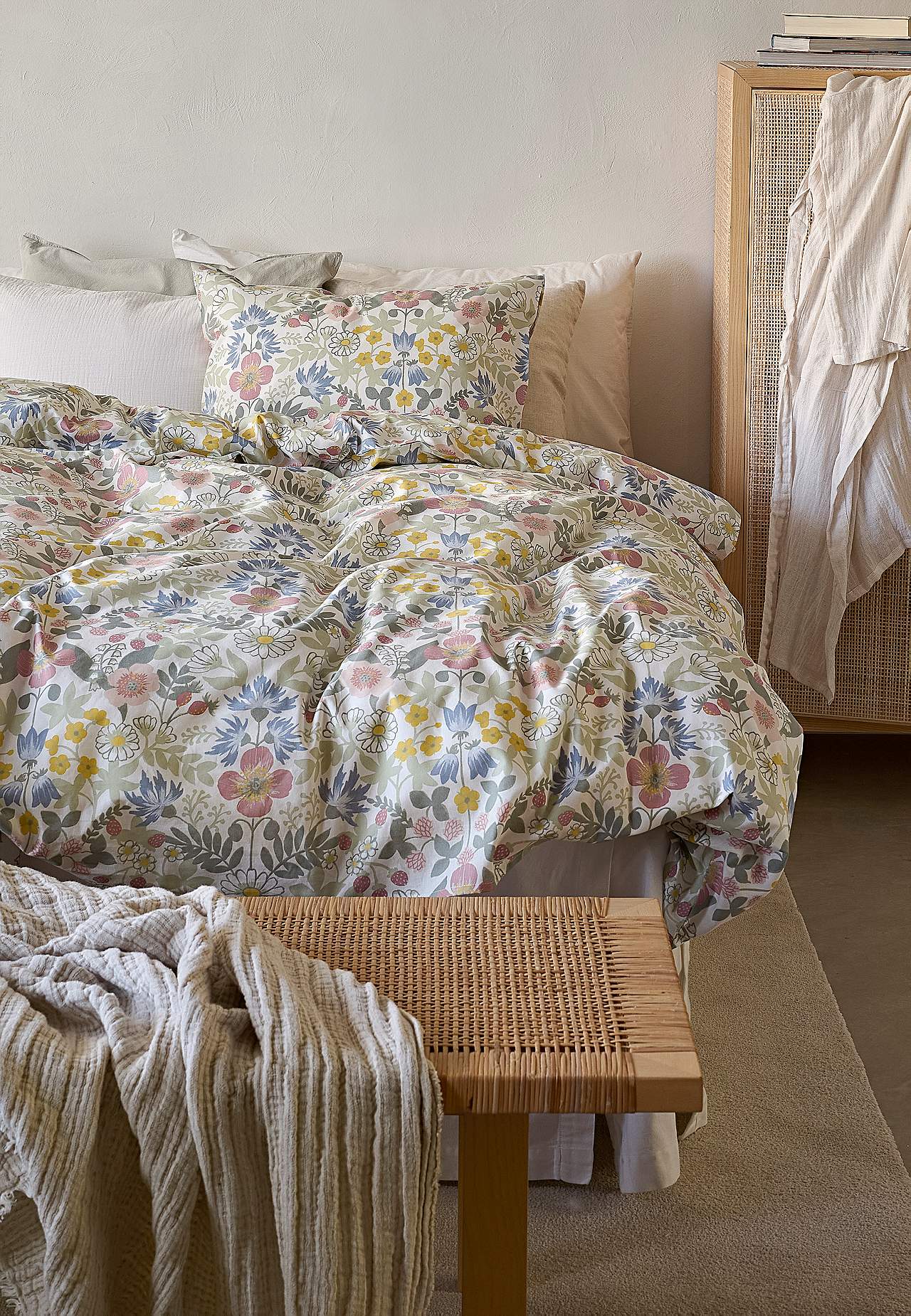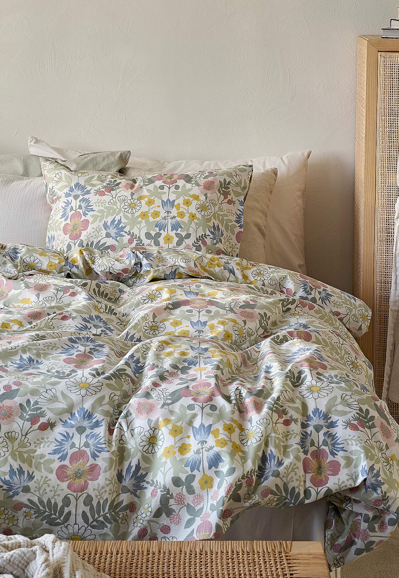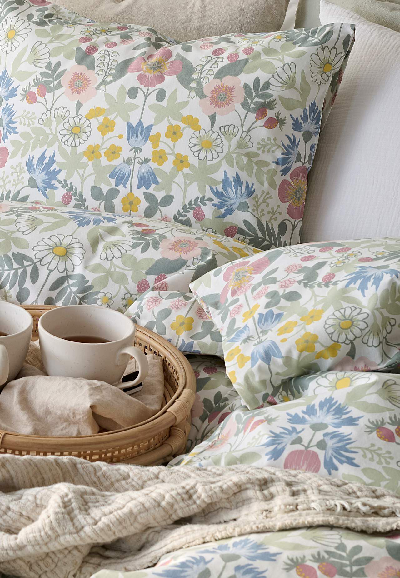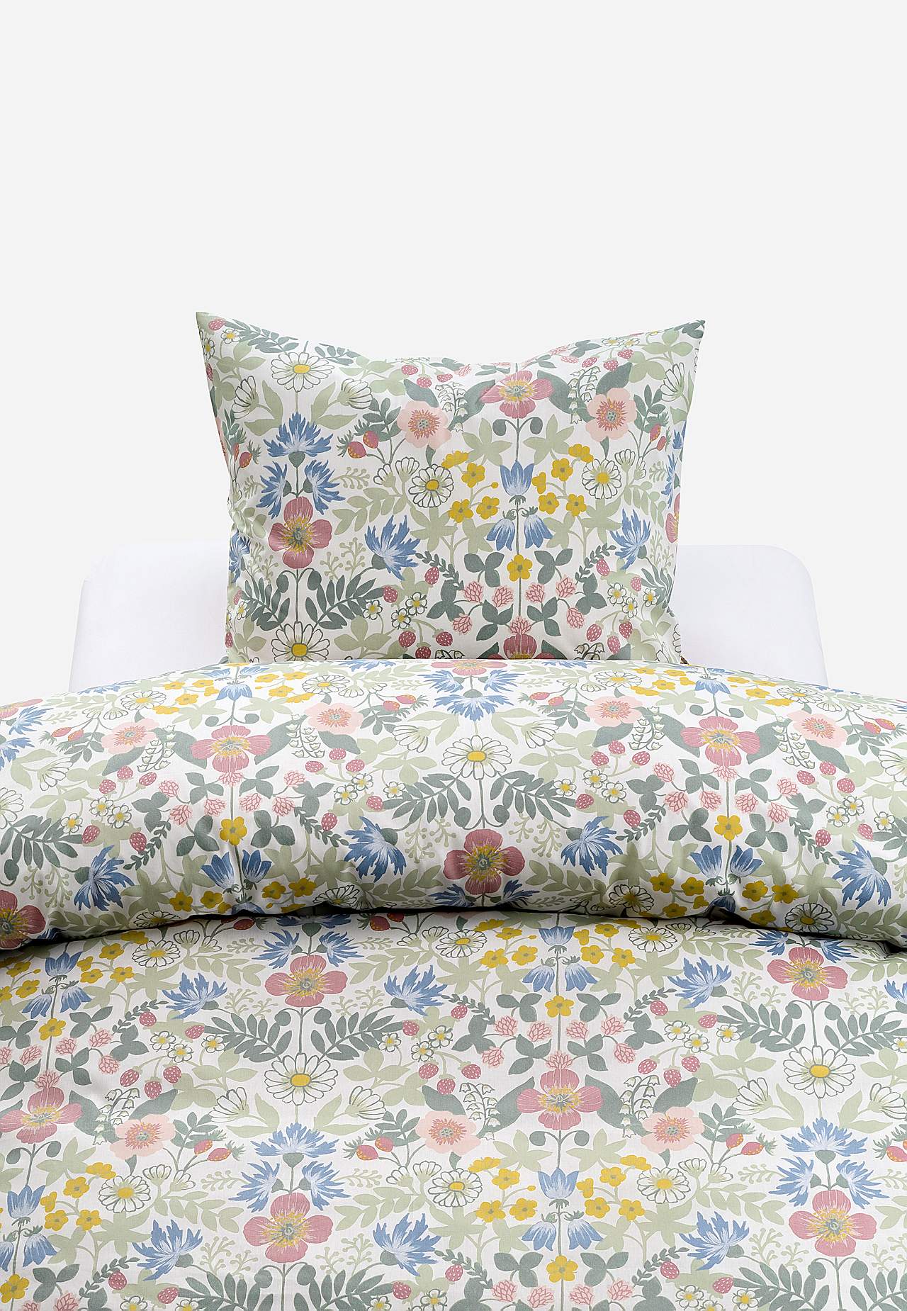 Pussilakanasetti pehmeästä, mukavasta puuvillasta. Painettu lakanasetti pienikukkaisella kuvioinnilla ja yksivärisellä pohjalla. Sama kuvio edessä ja takana. 2 osaa. Pussilakanan koko 150 x 210 cm, tyynynpäällisen koko 50 x 60 cm. Pussilakana, yläosassa kädenreiät. Kirjekuoriaukkoinen tyynyliina. Langantiheys: 144.