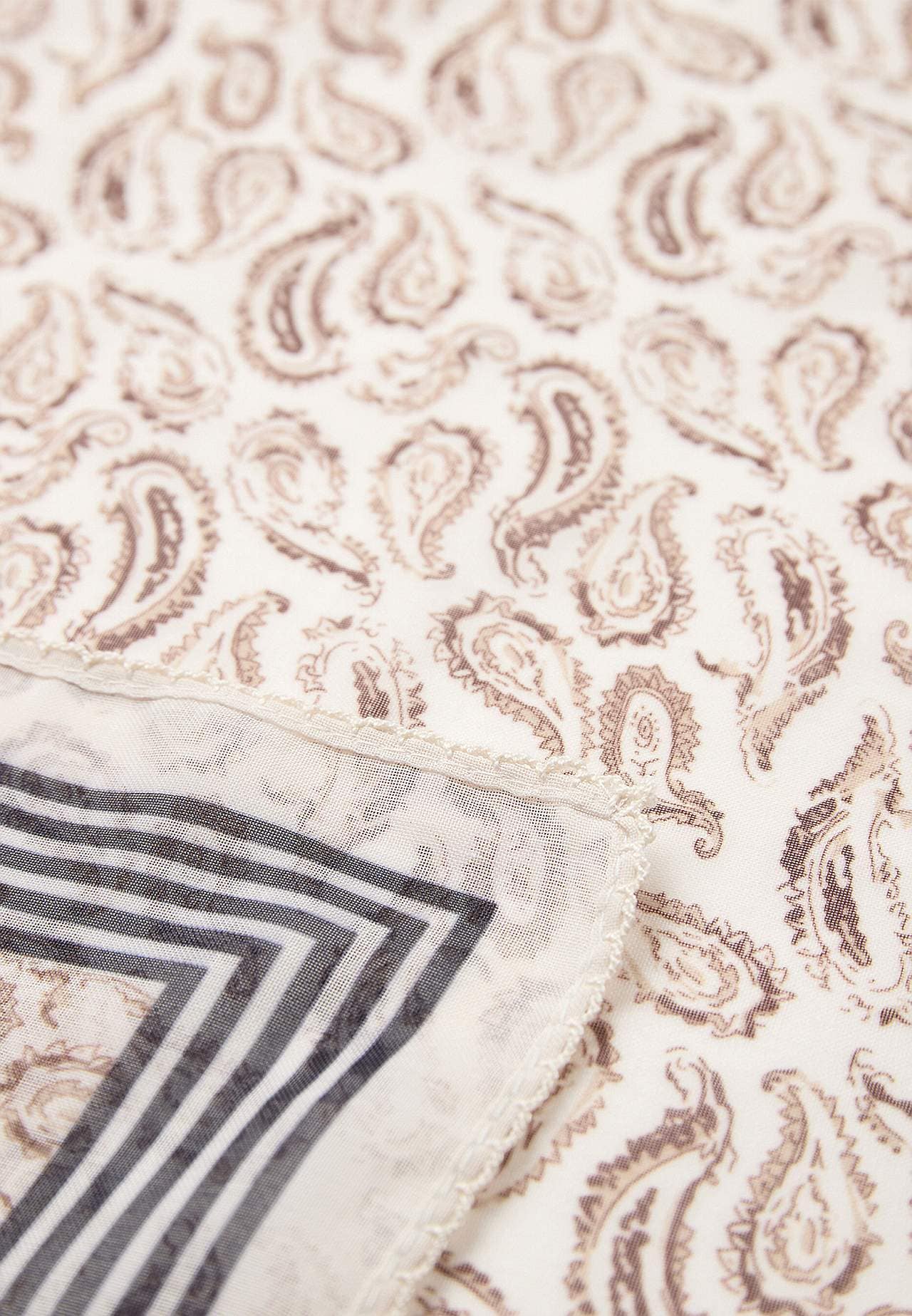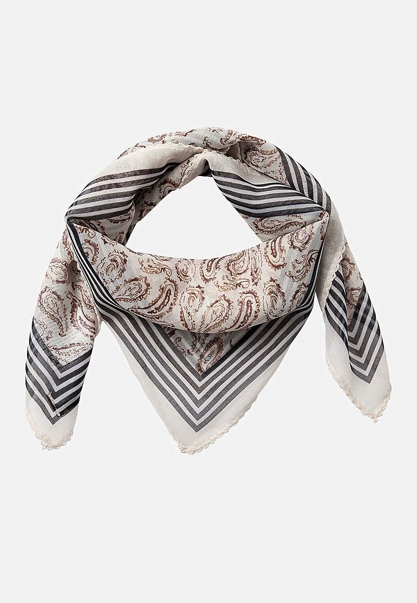 Huivi paisley-kuviolla ja ohuilla raidoilla. Läpikuultava materiaali polyesterista. Virkattu, koristeellinen, aaltoileva reuna.