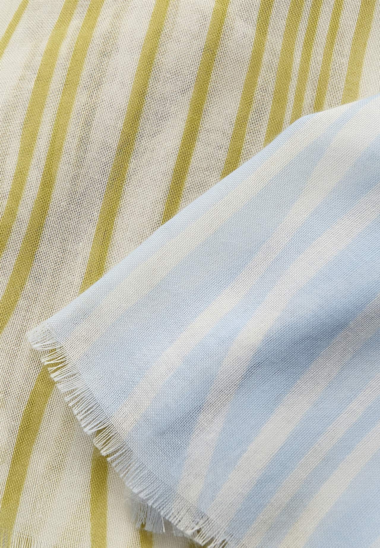 Huivi erivärisillä raidoilla. Pehmeä, ilmava materiaali kierrätetystä polyesterista. Suorakulmainen muoto. Hapsutettu reuna lyhyillä sivuilla.