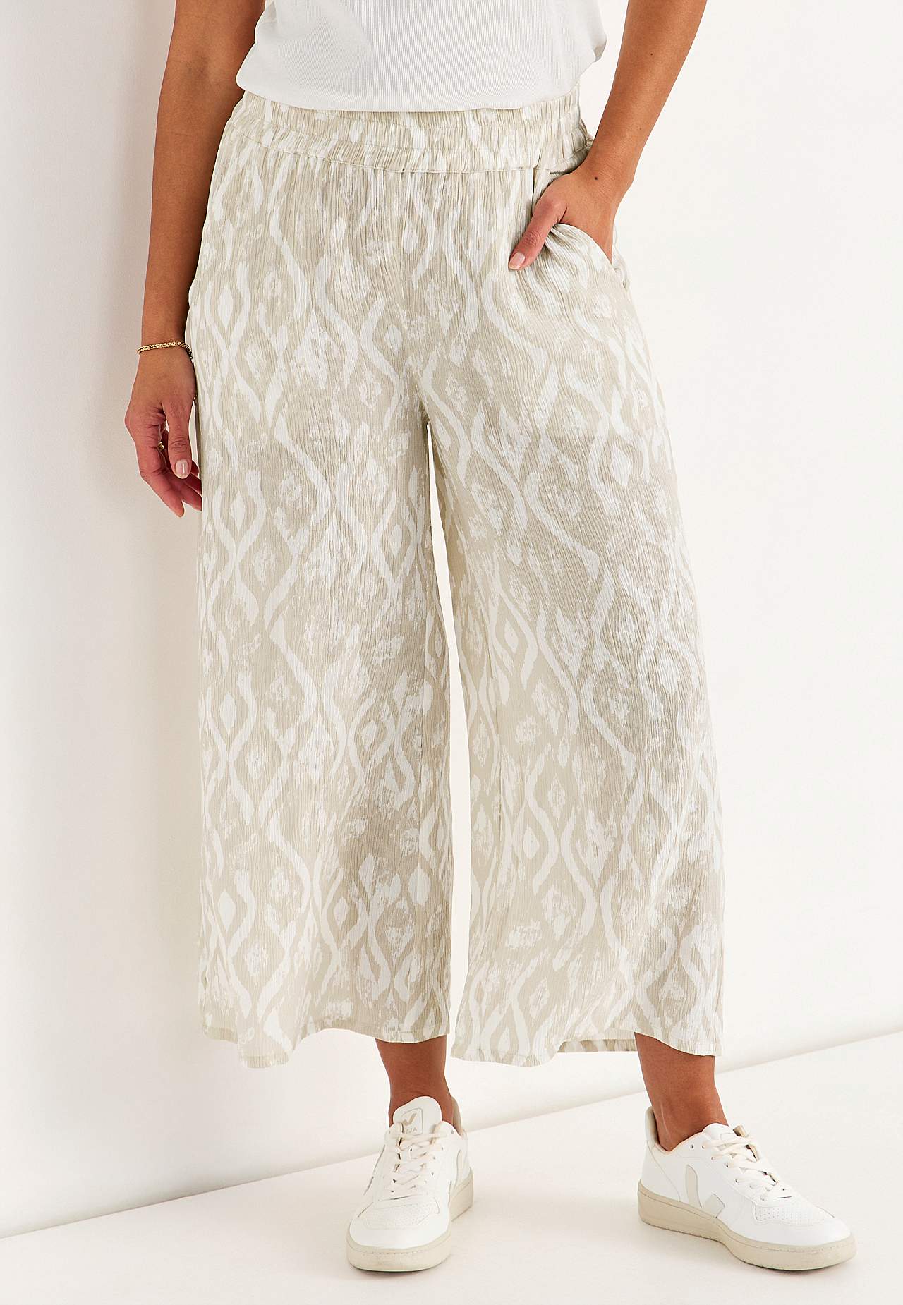 Kudotut culottehousut crêpe-laadulla. Ilmava, viileä materiaali. Leveä, pehmeä joustava vyötärönauha. Vinotaskut edessä. Lahkeen sisäpituus n. 60 cm joka koossa. Yhdistä vapaasti tähän tuotteeseen: 702443.