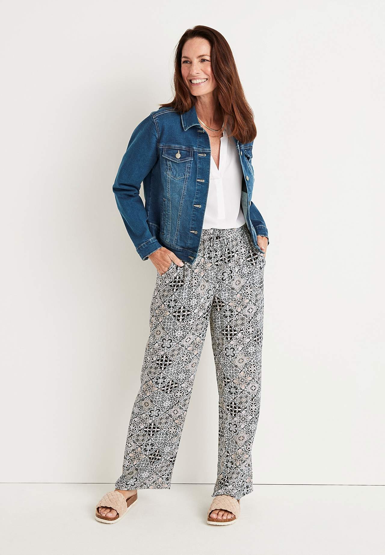 Kudotut housut crêpe-laadulla. Leveä, pehmeä joustava vyötärönauha nyörillä. Vinotasku edessä. Haaran korkeus vaihtelee koon kukaan: noin 29-39 cm. Lahkeen sisäpituus n. 74 cm joka koossa.