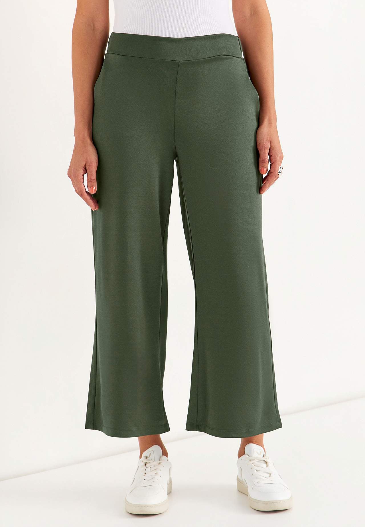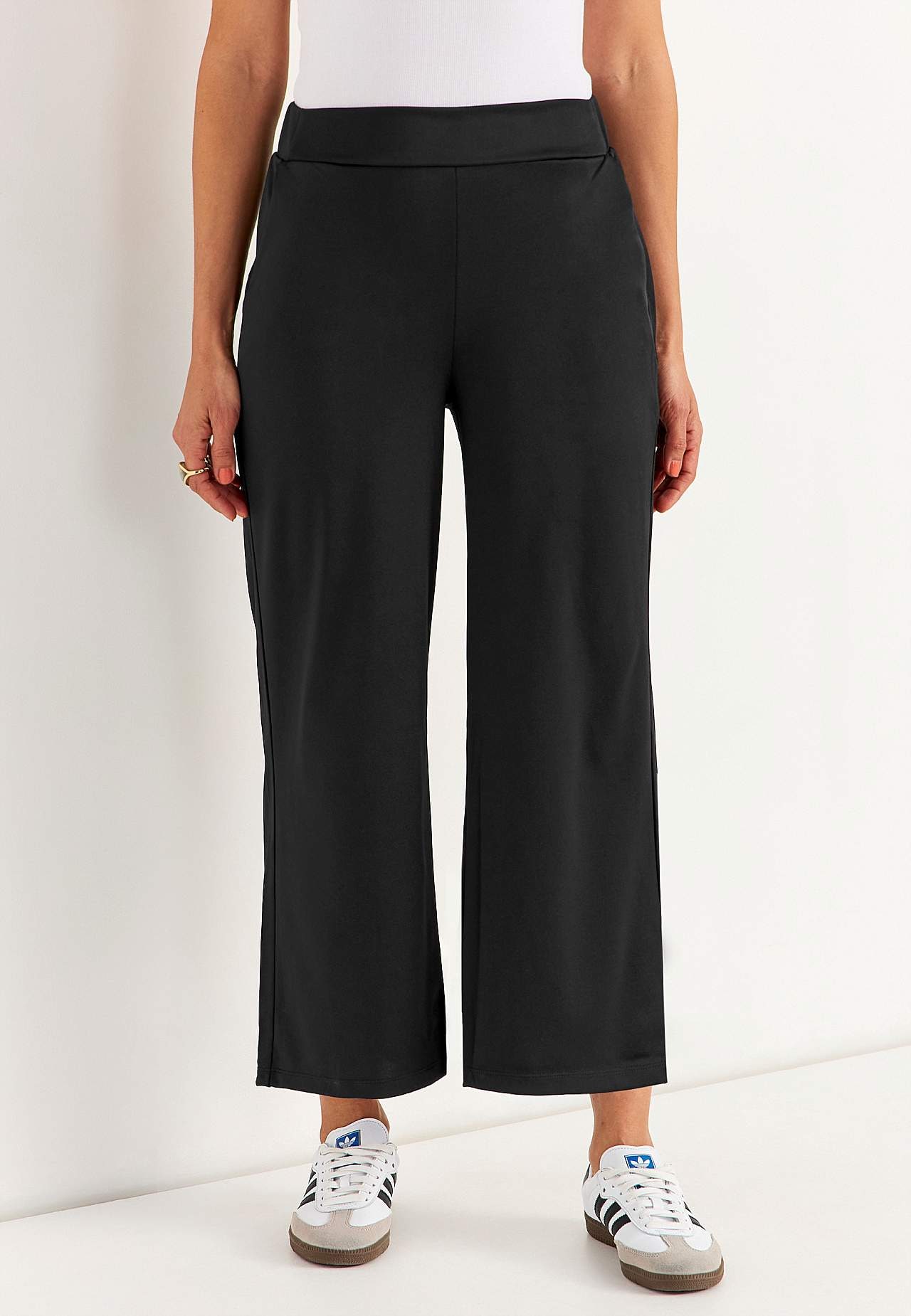 Nilkkapituiset housut leveillä lahkeilla. Joustava, sileä trikoo kivalla hohdolla. Leveä vyötärönauha kätketyllä resorilla takana. Sivusaumataskut. Lahkeen sisäpituus n. 62 cm joka koossa. Haaran korkeus vaihtelee koon kukaan: noin 26-37 cm.