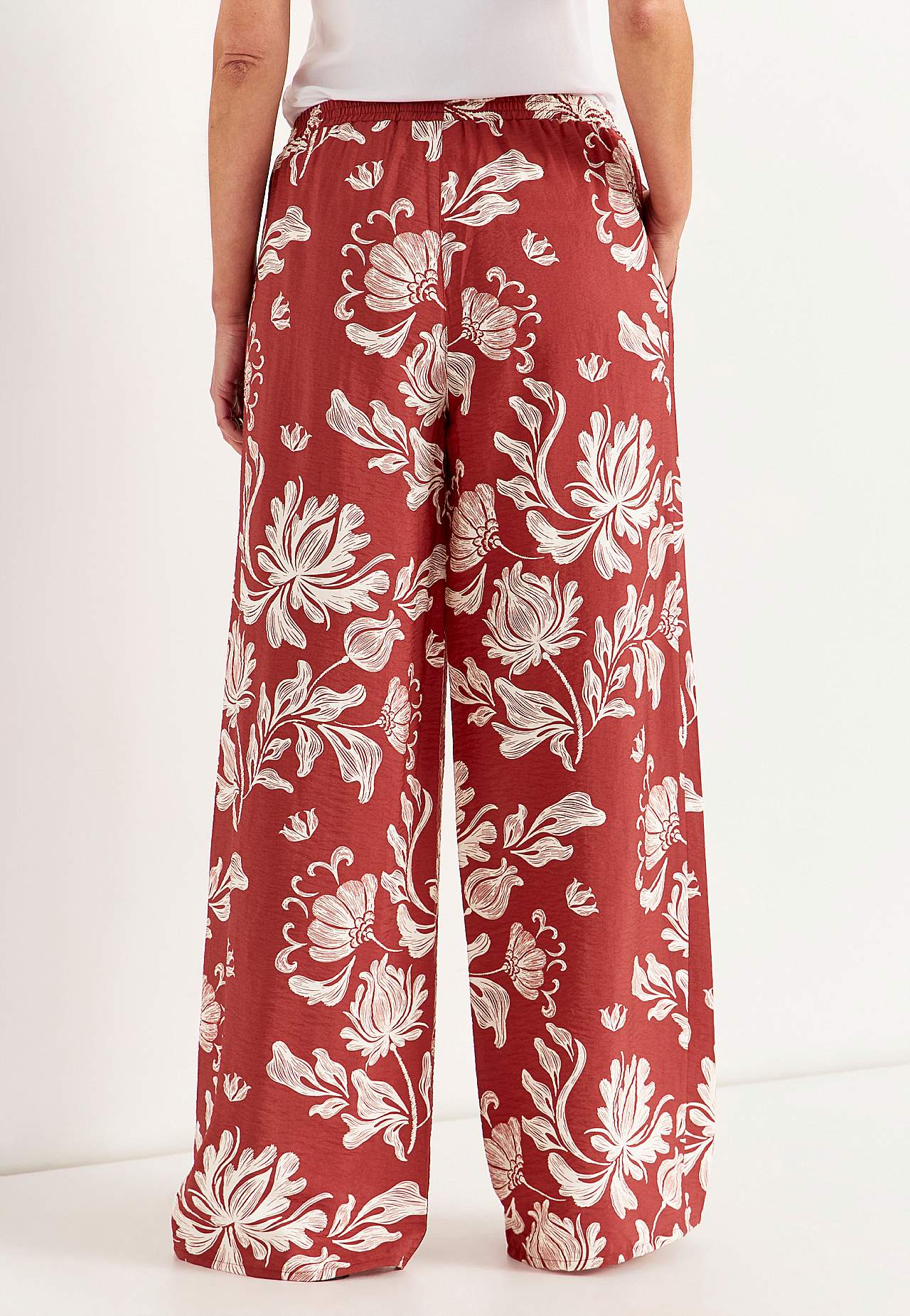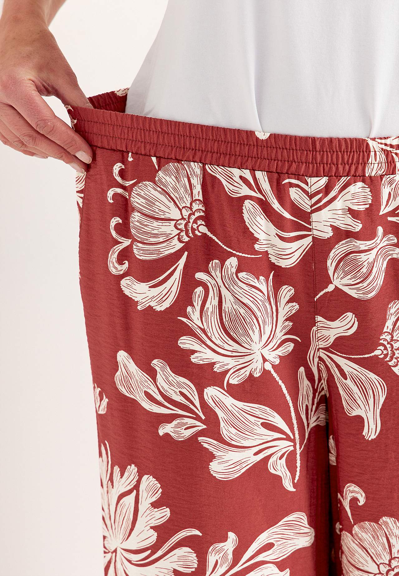 Kudotut housut ihanasta viskoosisekoitteesta hieman kiiltävällä teksturoidulla kankaalla. Kiva, raskas laskeutuminen ja viileä tuntuma. Löysä istuvuus leveillä, suorilla lahkeilla. Normaali vyötärö mukavalla resorilla. Viistot taskut. Lahkeen sisäpituus n. 78 cm joka koossa. Haaran korkeus vaihtelee koon kukaan: noin 26-37... Lue lisää