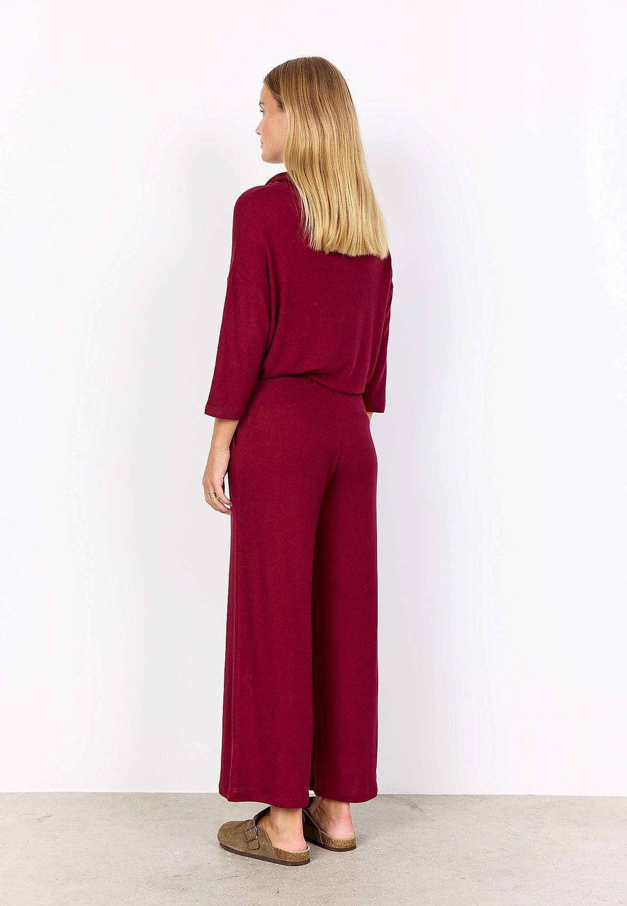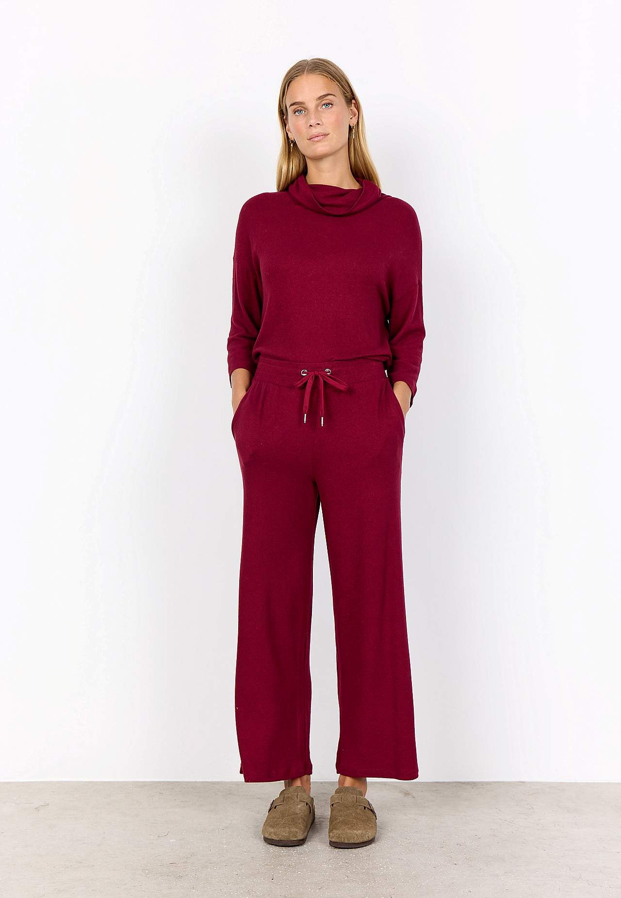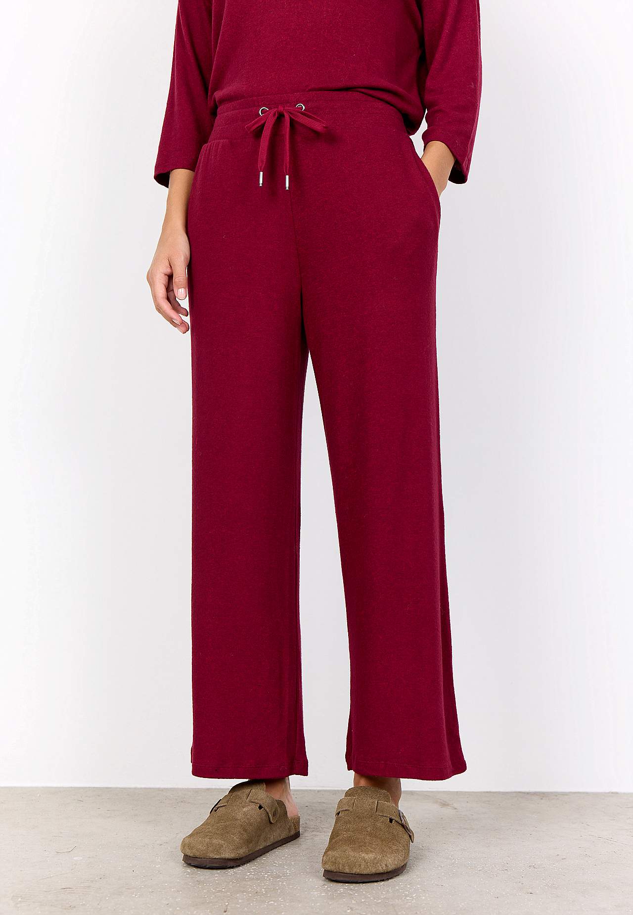Pehmeä, hieman raskaampi trikoo harjatulla pinnalla. Rento istuvuus. Resori vyötäröllä kiristysnyörillä. Taskut edessä. Suorat lahkeet. Sisäjalan pituus n. 64 cm koossa S (38). Yhdistä vapaasti tähän tuotteeseen: 700967.