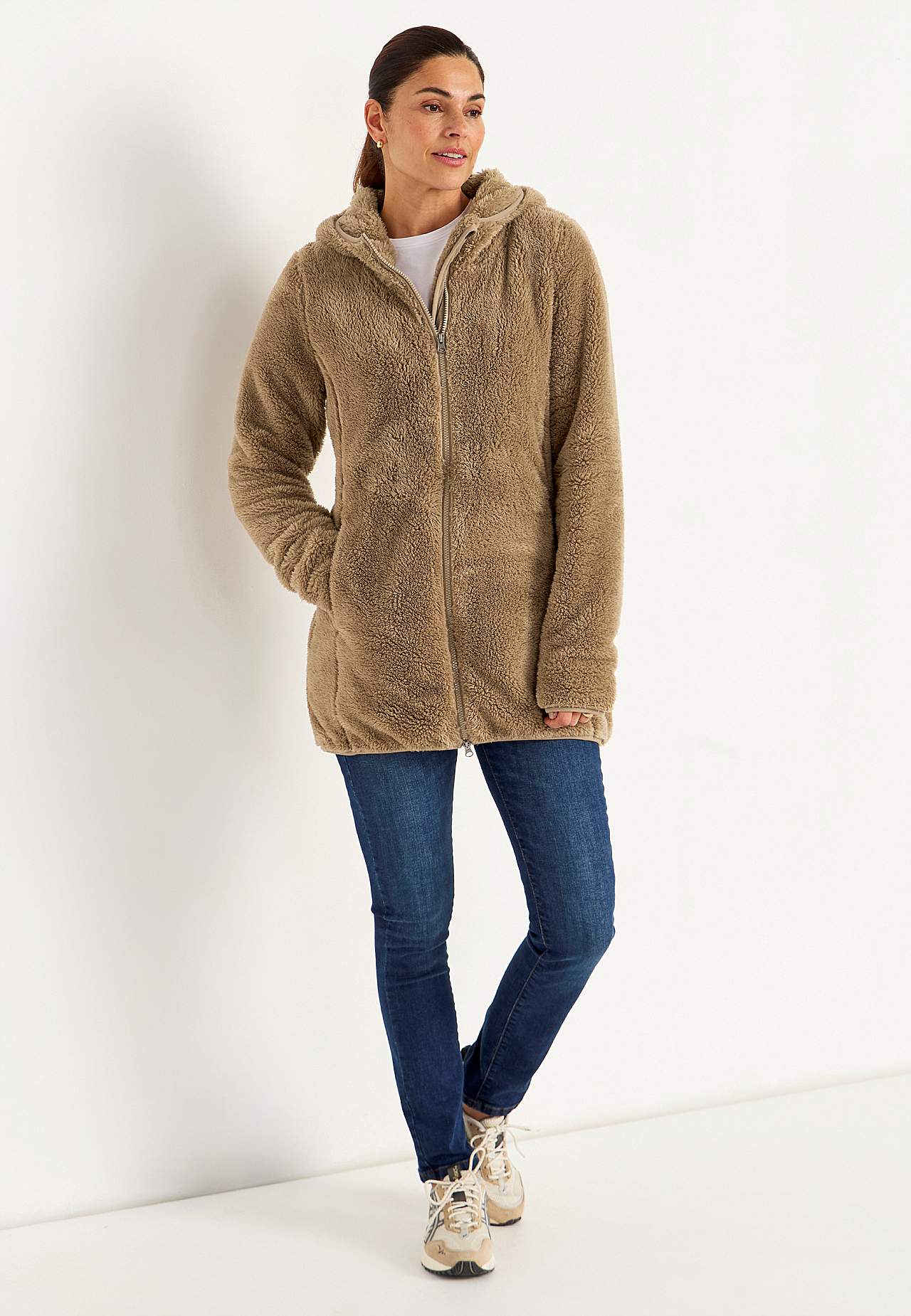 Pitkä, hyvin pehmeä fleece-takki. Kiinnitetty huppu elastisella, yhteensopivalla reunanauhalla. Taskut edessä vetoketjulla ja pehmeällä vuorilla. Pitkät hihat elastisella reunanauhalla hihansuissa. Käytännöllinen kaksisuuntainen vetoketju. Suora helma elastisella reunanauhalla. Takapituus koon mukaan n. 81-89 cm.