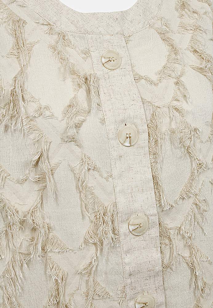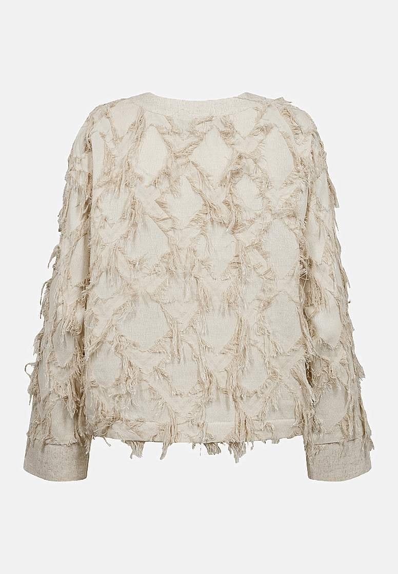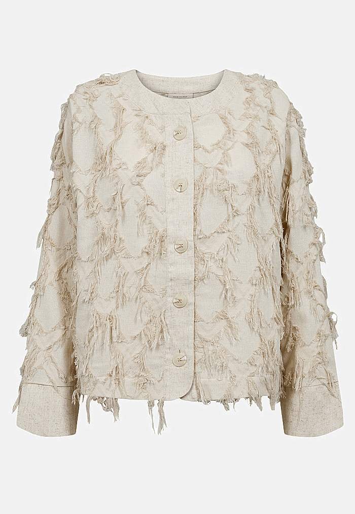 Hienostunut, ilmava sisätakki epäsäännöllisillä hapsuilla. Muotoilu kivalla tekstuurilla. Ylikokoinen istuvuus. Pyöristetty kaula-aukko. Pudotettu olkapää. Nappikiinnitys edessä. Pitkät hihat leveällä kalvosimella hihansuissa. Suora helma. Pituus olkapäästä n. 59 cm koossa S (38).