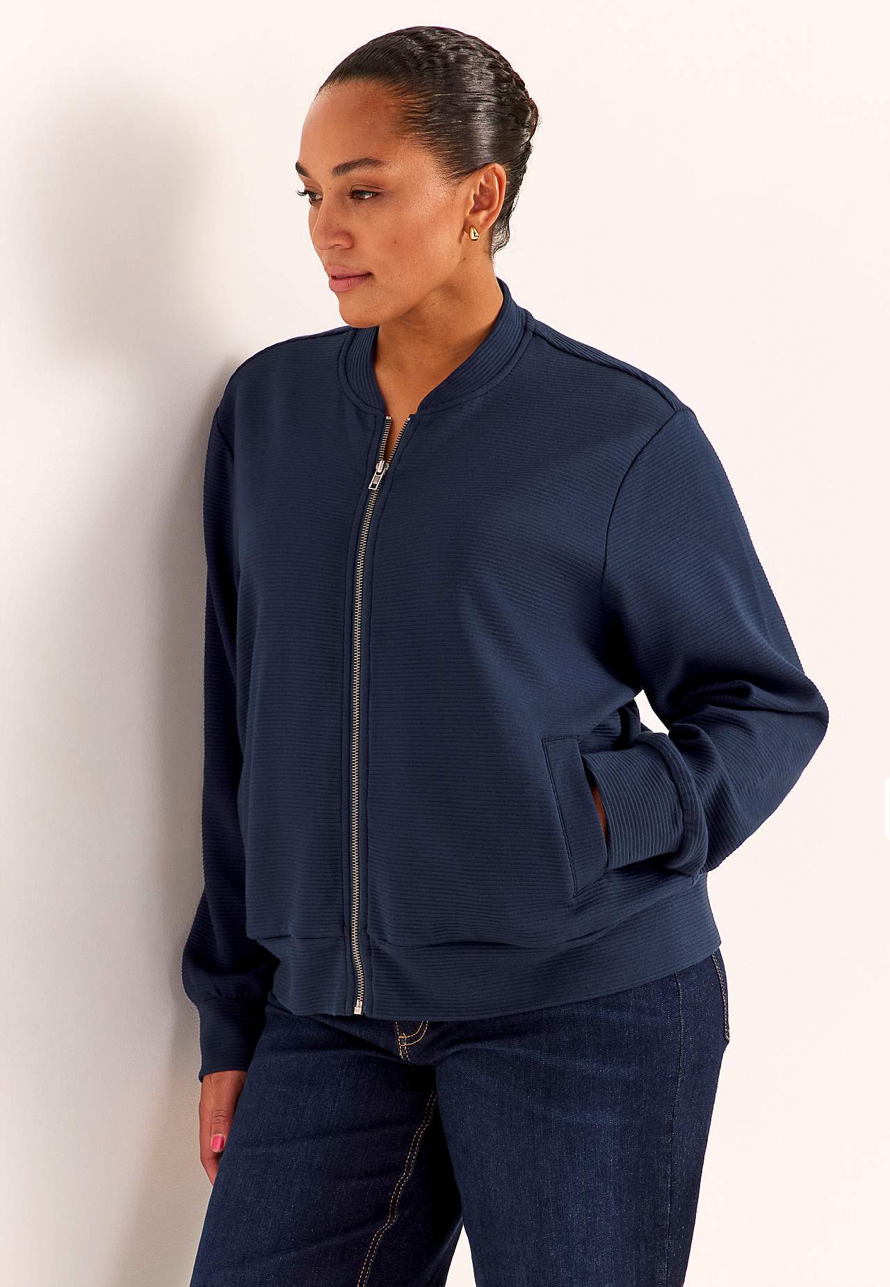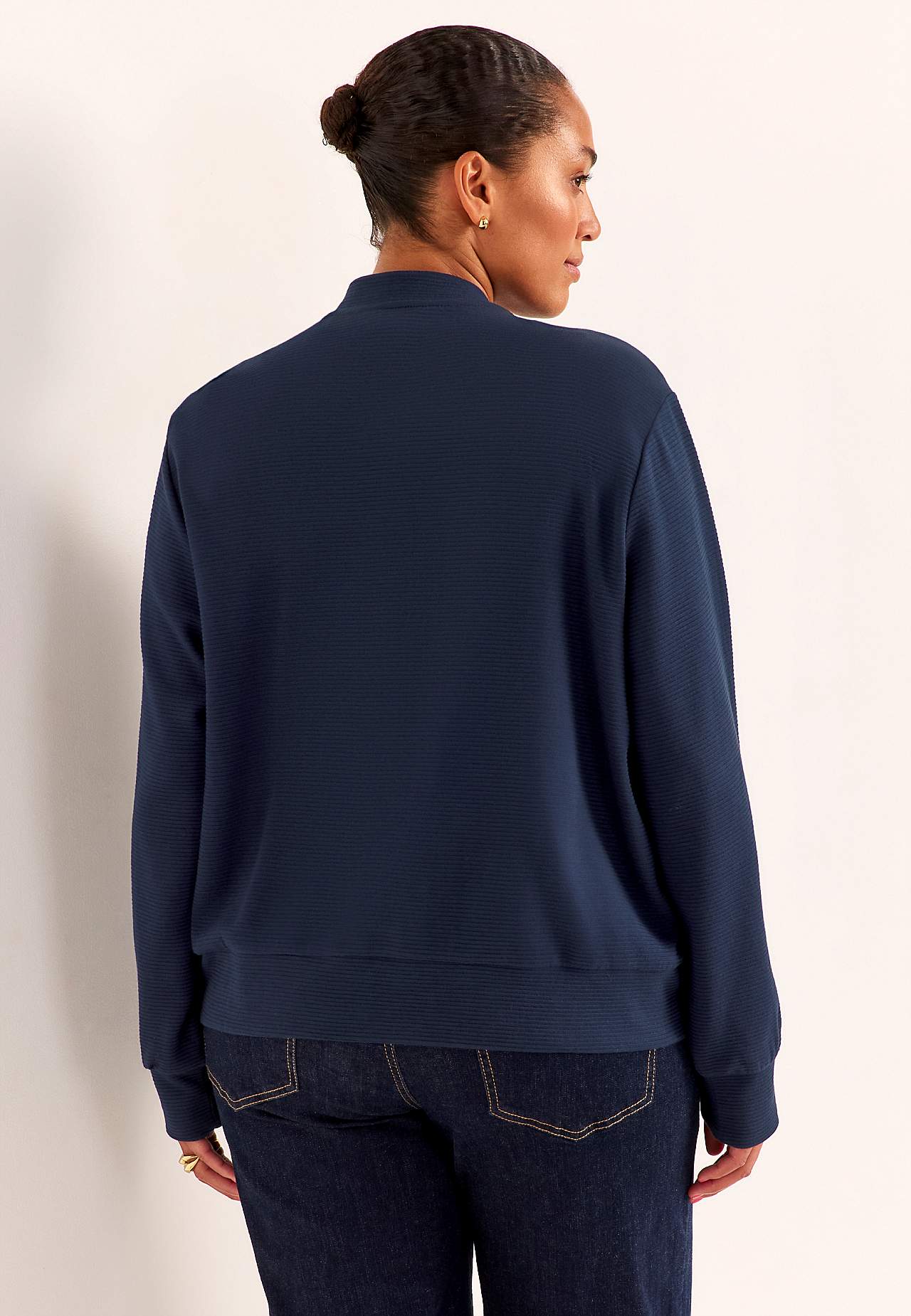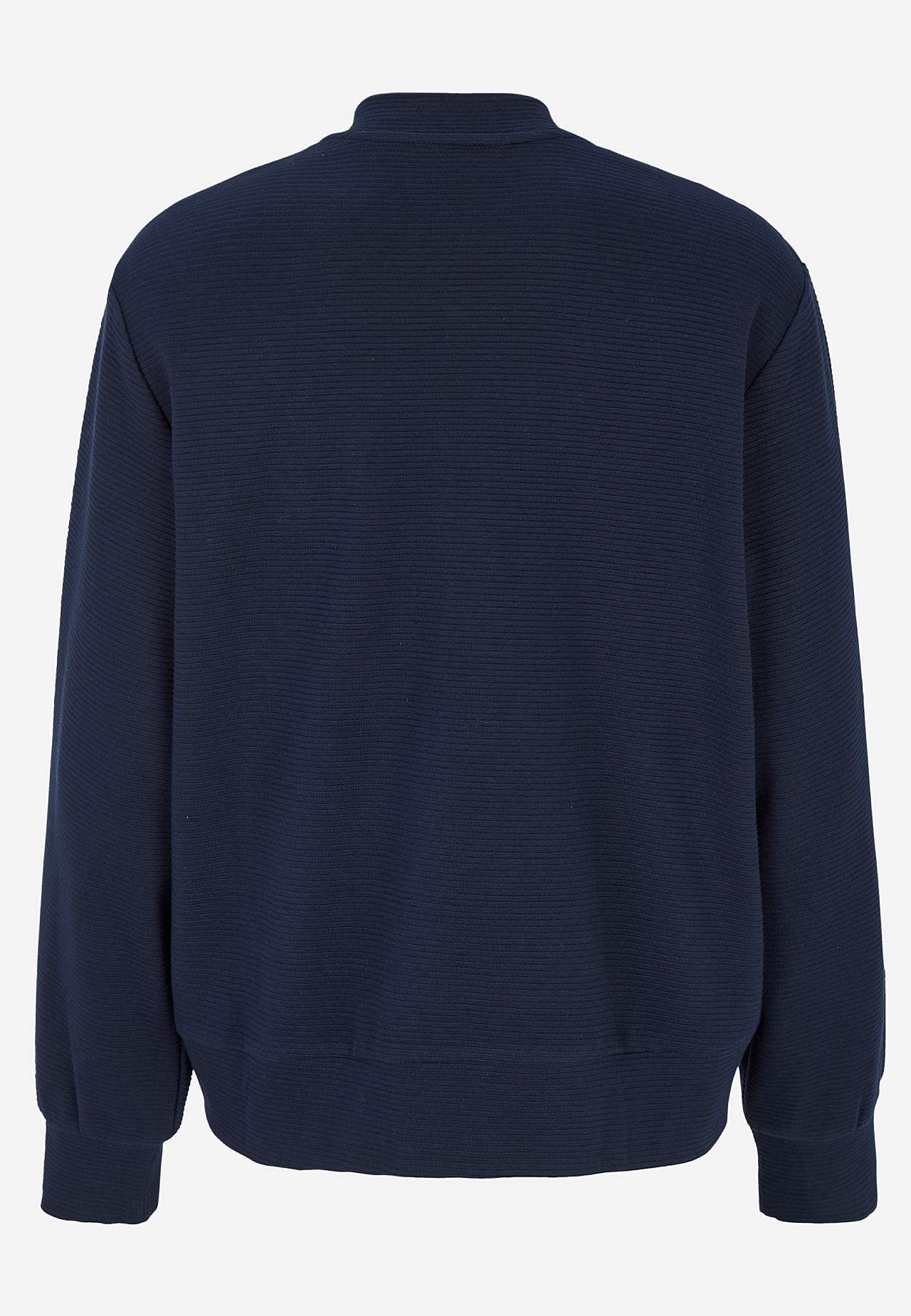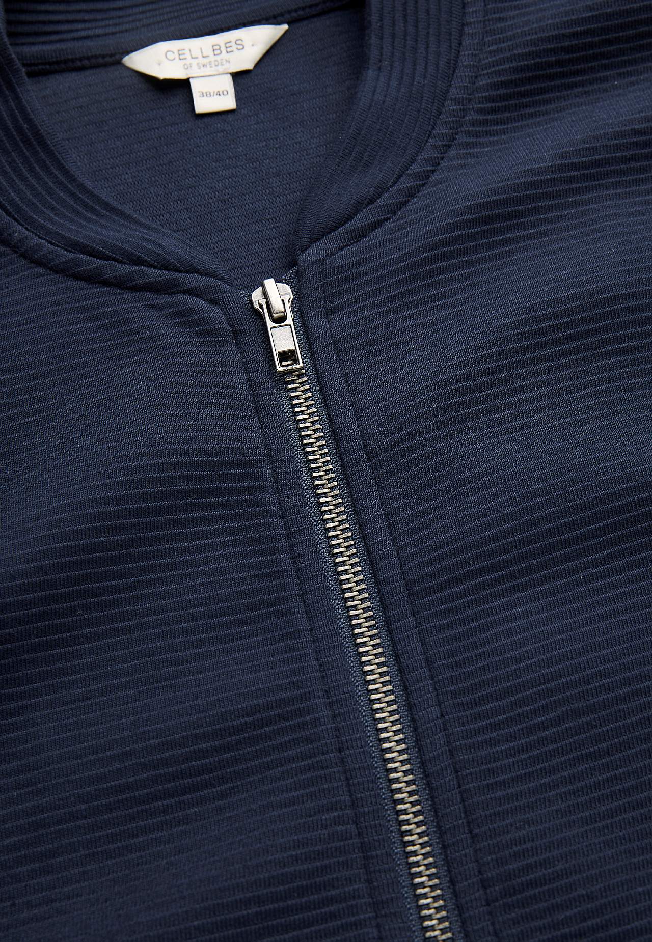 Sisätakki hieman raskaammasta, pehmeästä trikoosta raidallisella sommitelmalla. Löysä istuvuus. Matala pystykaulus. Vetoketju. Viistot kahden kantin taskut. Pitkät hihat resorilla hihansuissa. Suora helma kaksinkertainen taitetulla resorilla. Pituus olkapäältä koon mukaan noin 72-84 cm.