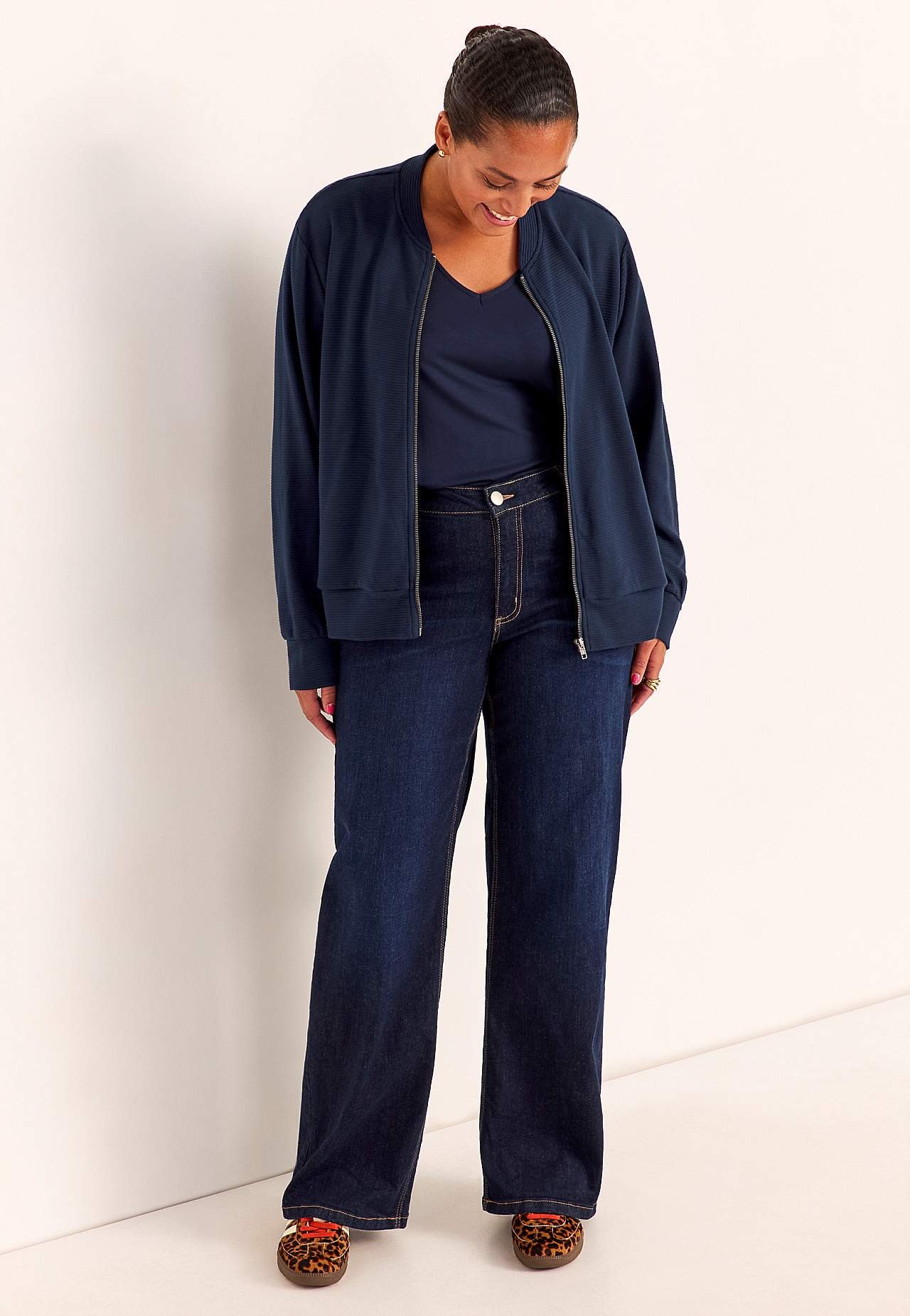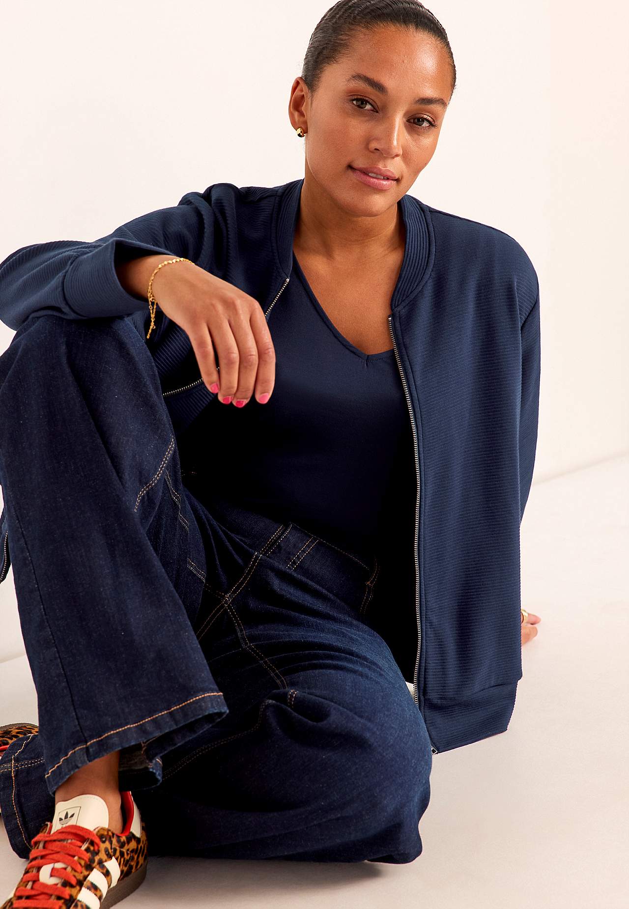 Malli on 177 cm pitkä ja käyttää kokoa 46/48