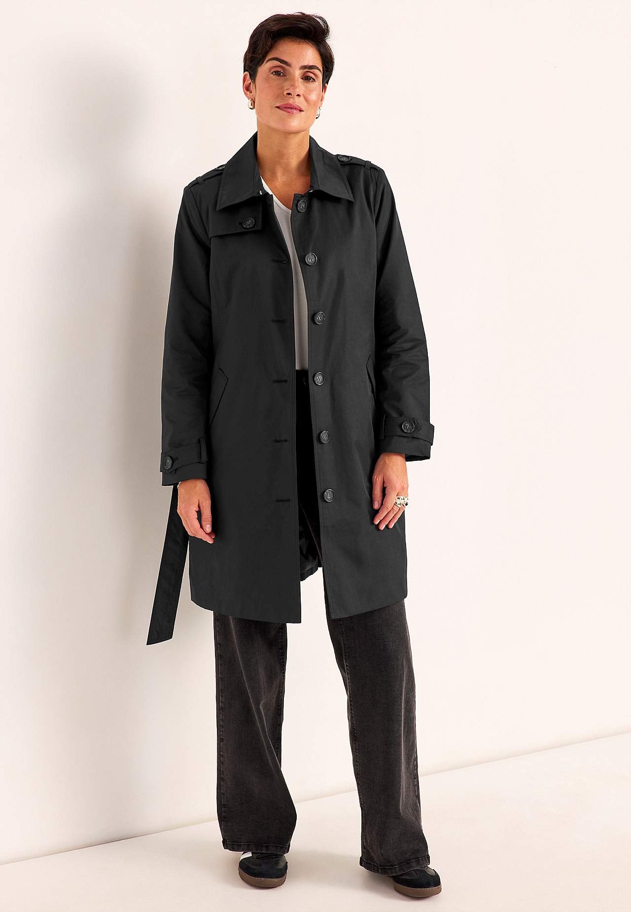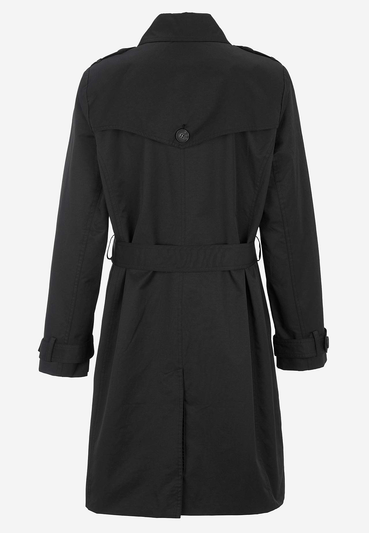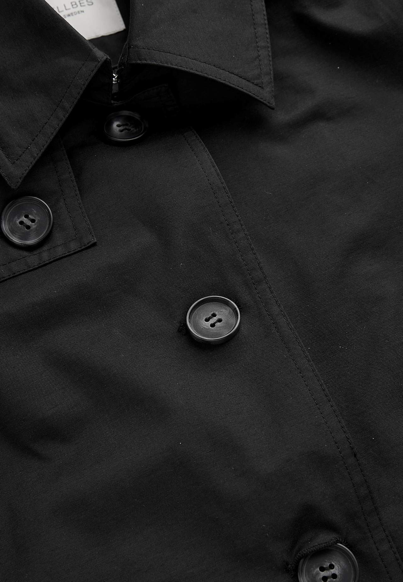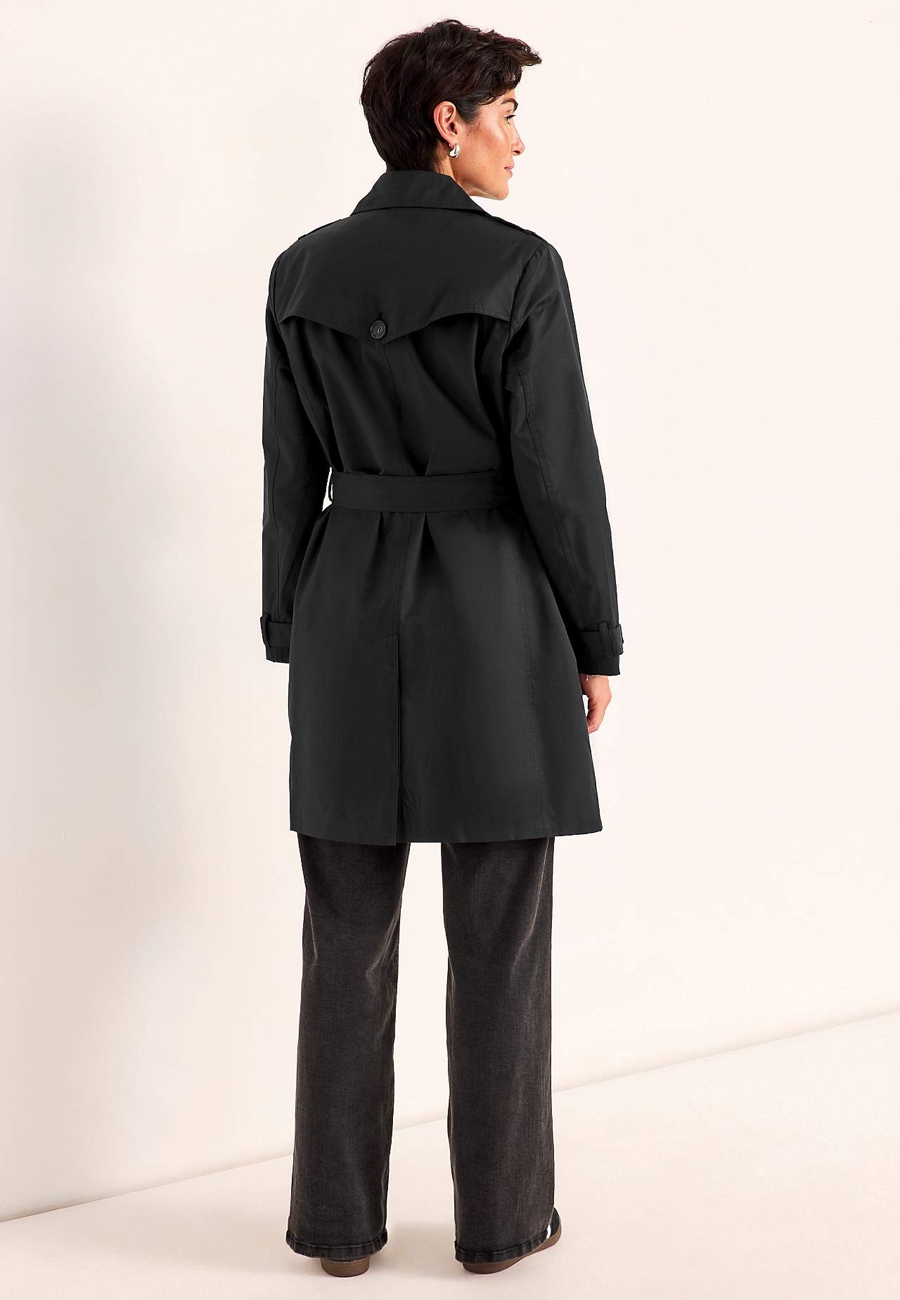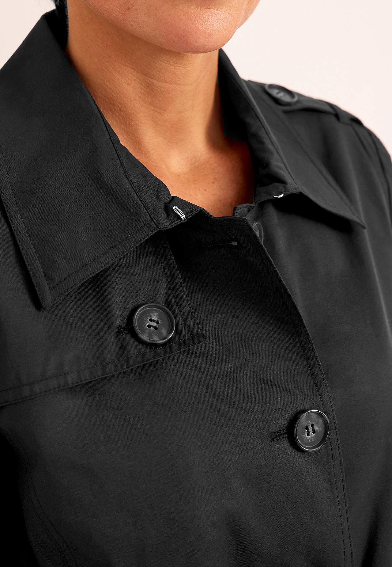 Vettähylkivä, täysin vuorattu trenssitakki. Pienet olkatoppaukset sisäpuolella. Kahden kantin taskut sivusaumoissa. Sisätasku. Suora helma halkiolla takana ja kahdella napilla. Pituus olkapäältä koon mukaan noin 97-111 cm.