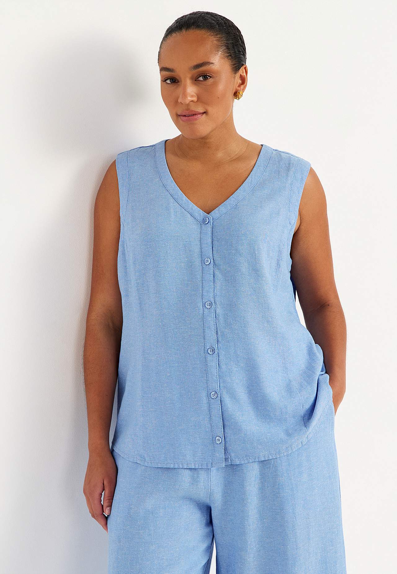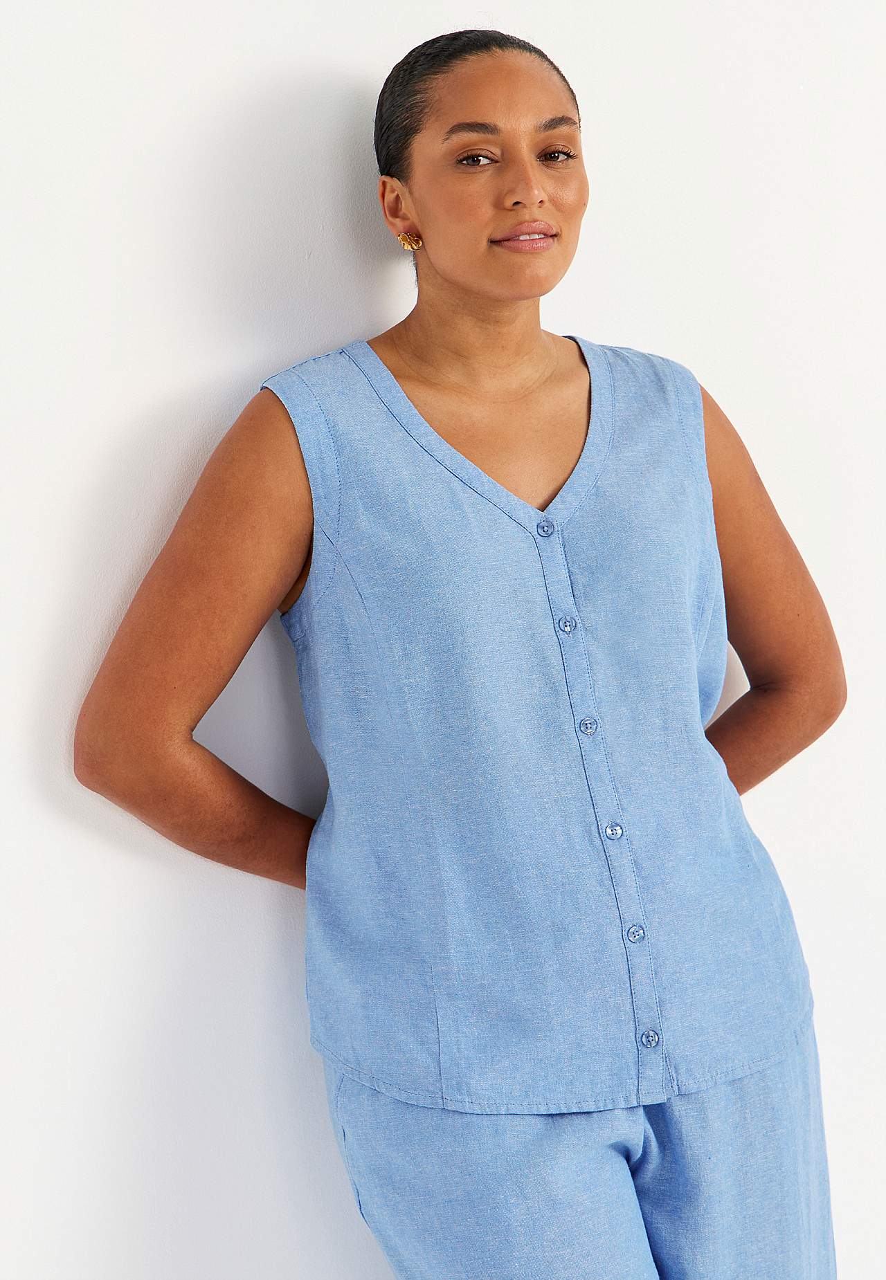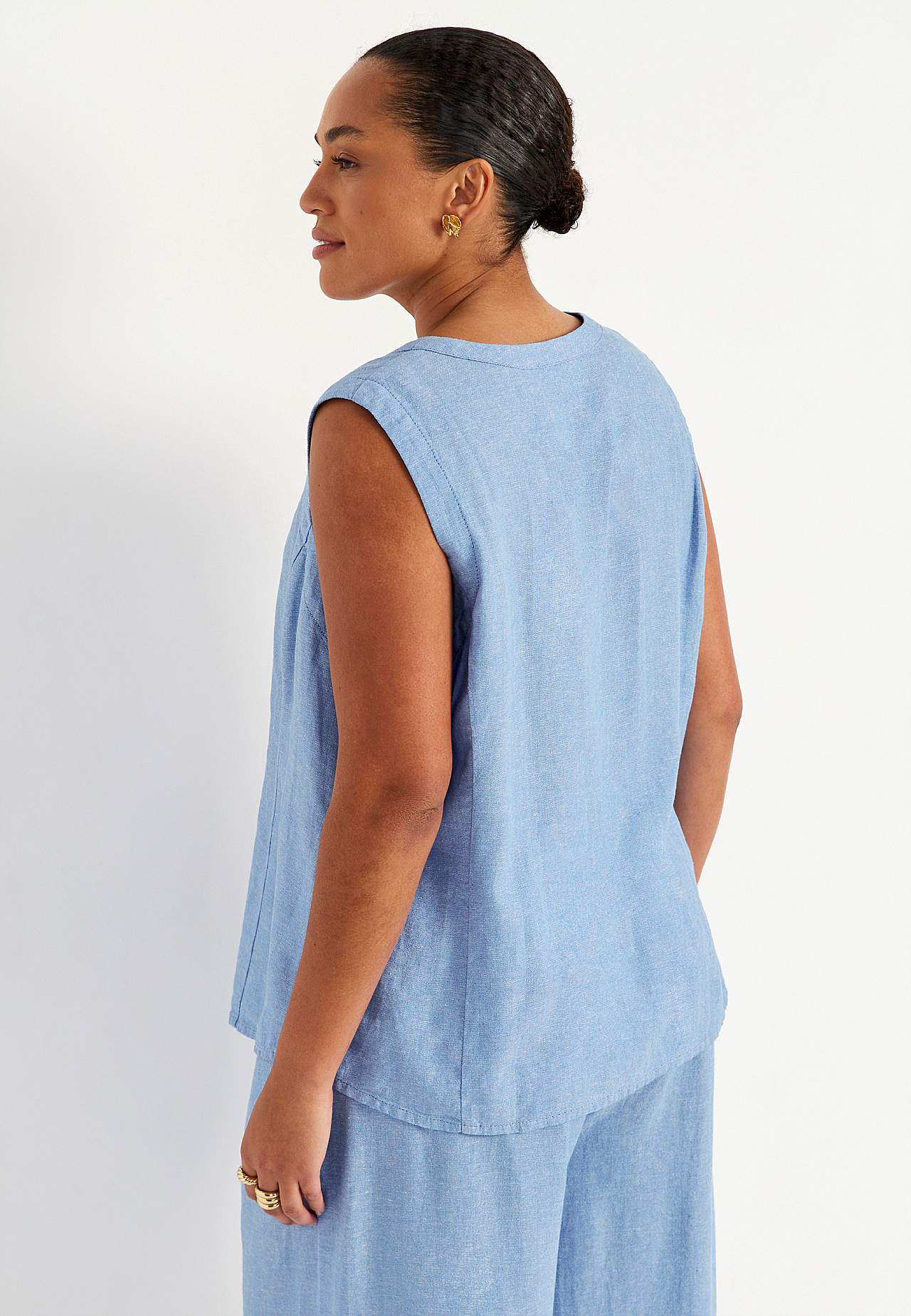 Kudottu, hihaton pusero ilmavasta pellava-viskoosiseoksesta. Normaali istuvuus. Sovitetut saumat edessä ja takana. Pyöristetty helma. Yhdistä vapaasti tähän tuotteeseen: 702563. Takapituus koon mukaan n. 62-74 cm.