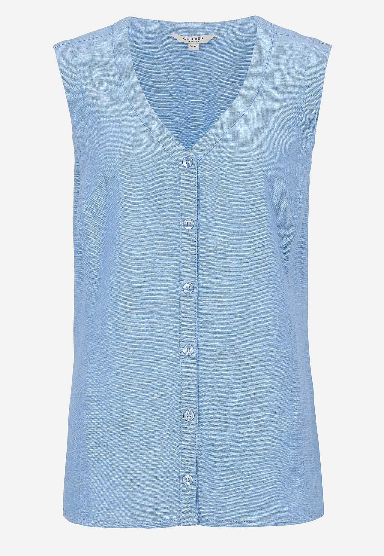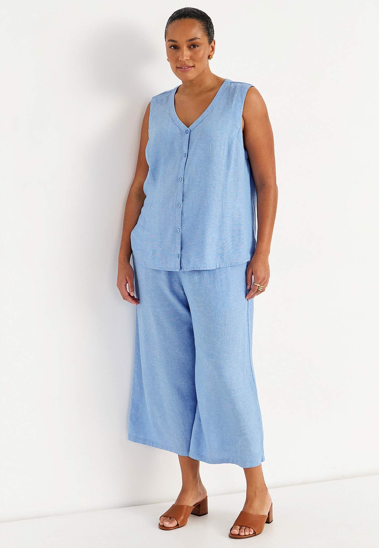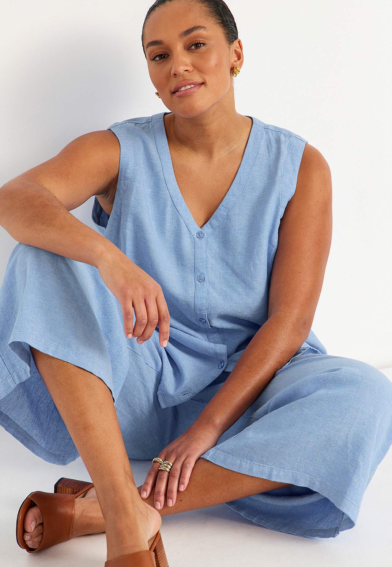 Kudottu, hihaton pusero ilmavasta pellava-viskoosiseoksesta. Normaali istuvuus. Sovitetut saumat edessä ja takana. Pyöristetty helma. Yhdistä vapaasti tähän tuotteeseen: 702563. Takapituus koon mukaan n. 62-74 cm.