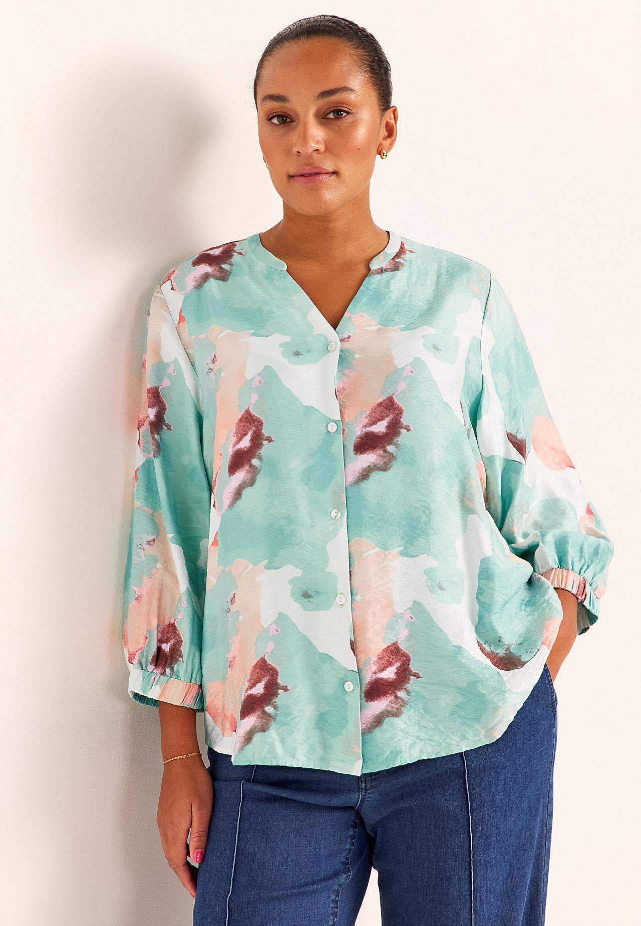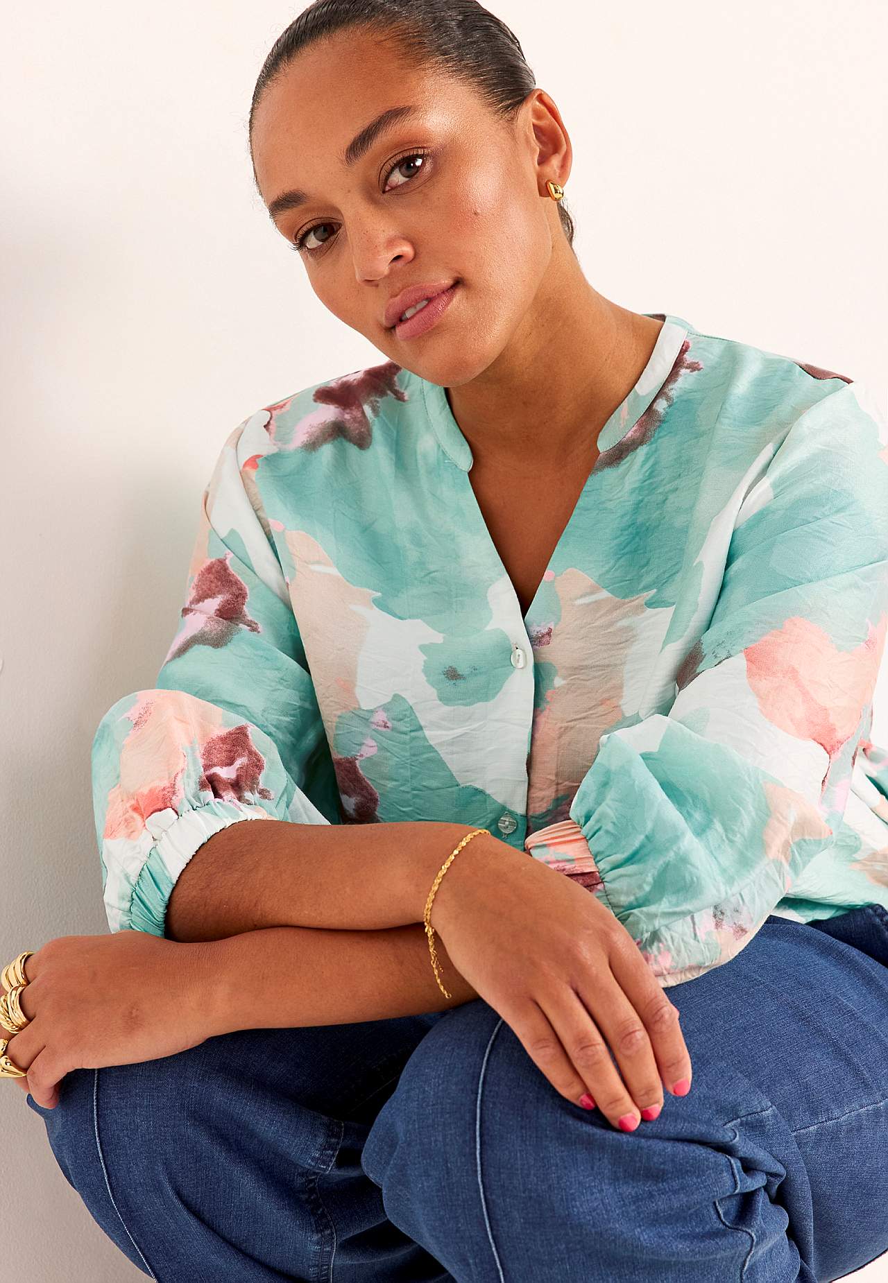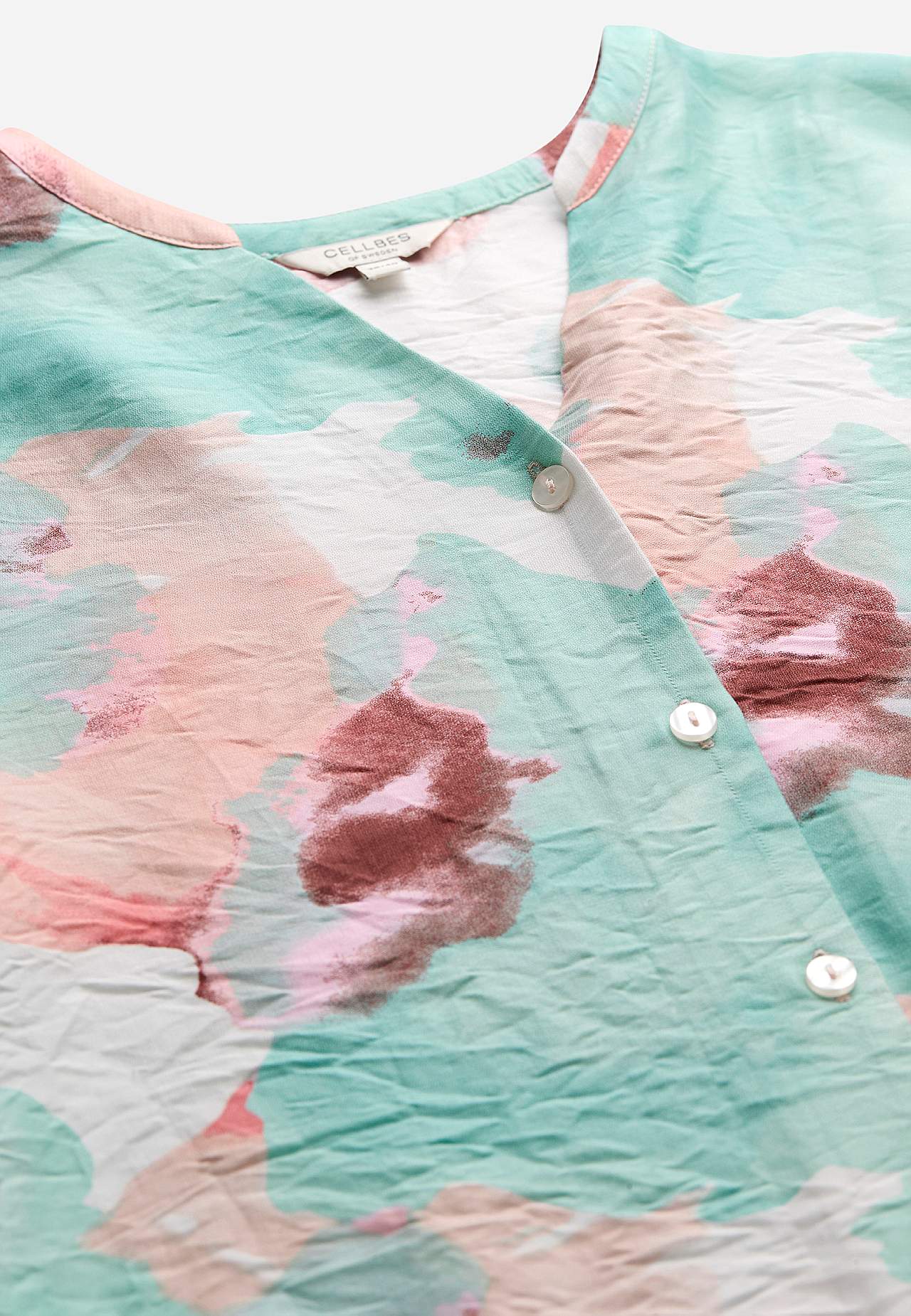 Pusero viskoosista hieman kiiltävällä teksturoidulla kankaalla. Kiva laskeutuminen ja viileä tuntuma. Normaali istuvuus. Pyöristetty pääntie v-leikkauksella edessä. Nappikiinnitys viidellä kivalla napilla. Lievästi pyöristetty helma. Pituus olkapäältä koon mukaan noin 62-76 cm.