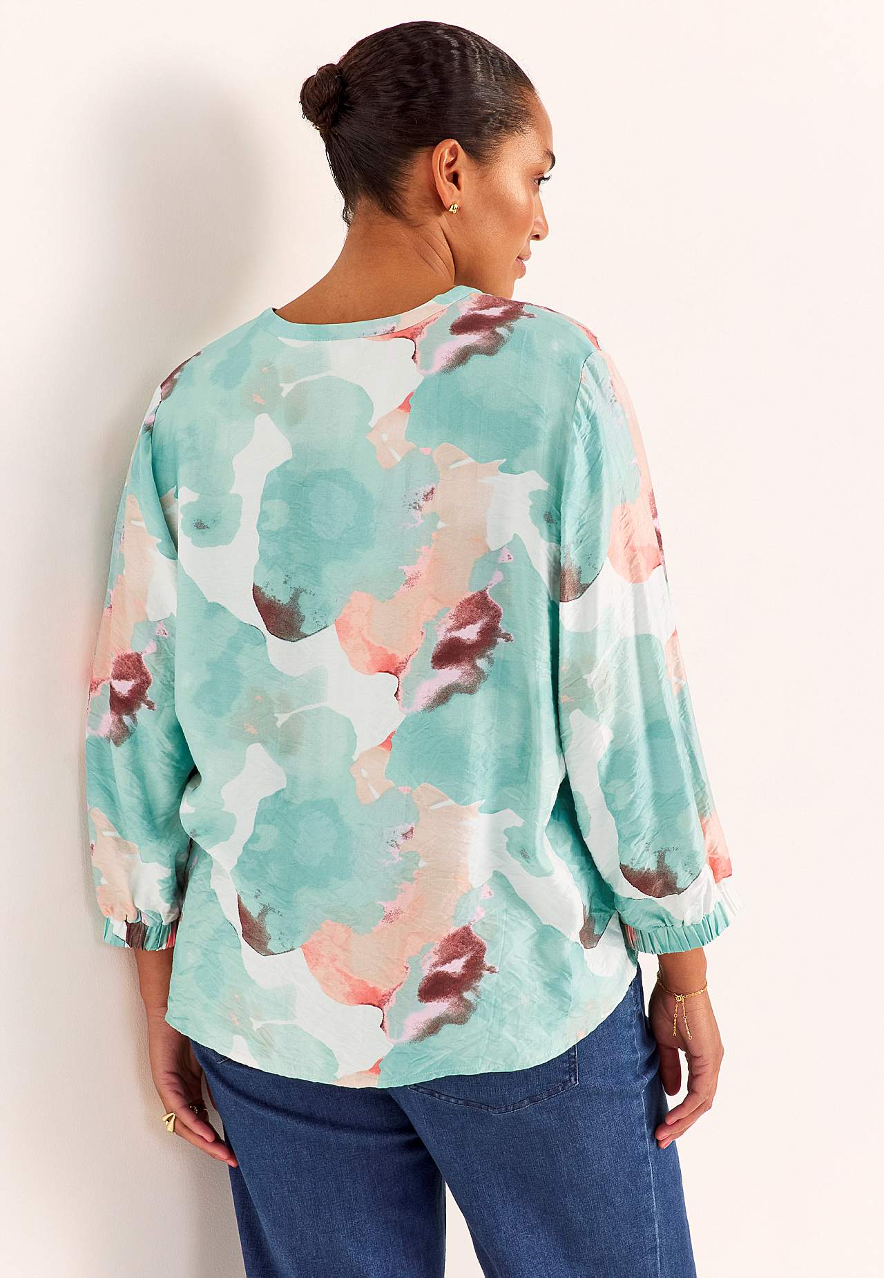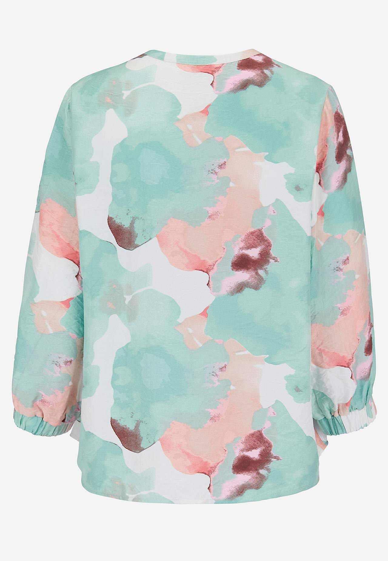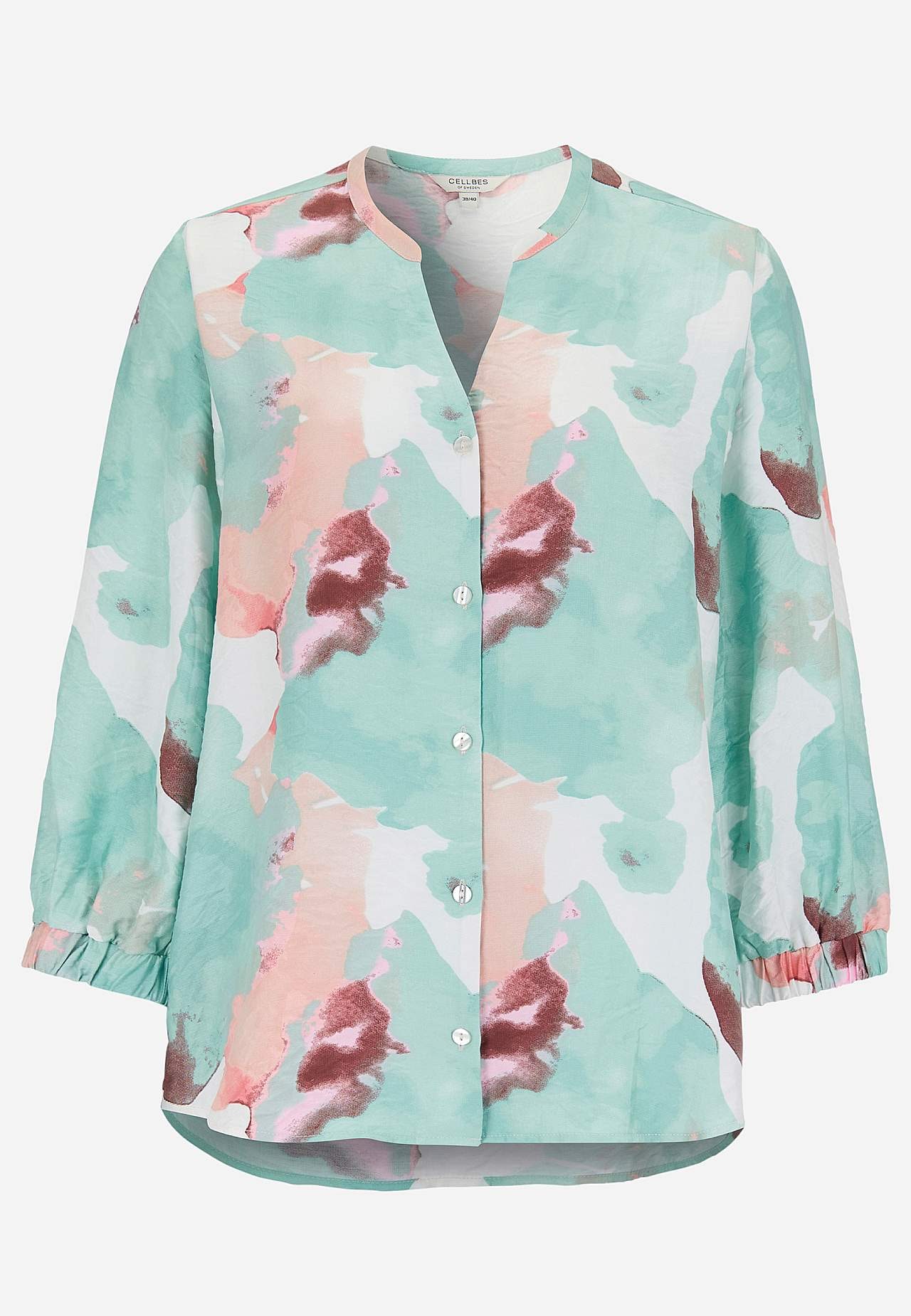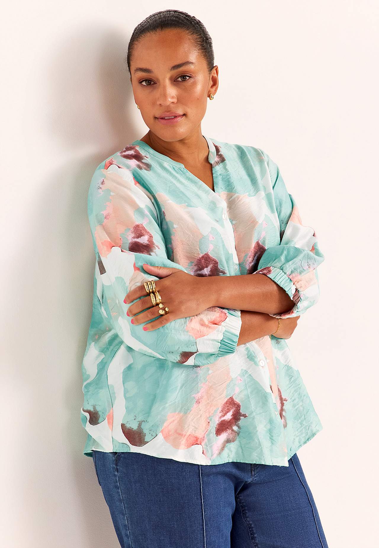 Pusero viskoosista hieman kiiltävällä teksturoidulla kankaalla. Kiva laskeutuminen ja viileä tuntuma. Normaali istuvuus. Pyöristetty pääntie v-leikkauksella edessä. Nappikiinnitys viidellä kivalla napilla. Lievästi pyöristetty helma. Pituus olkapäältä koon mukaan noin 62-76 cm.