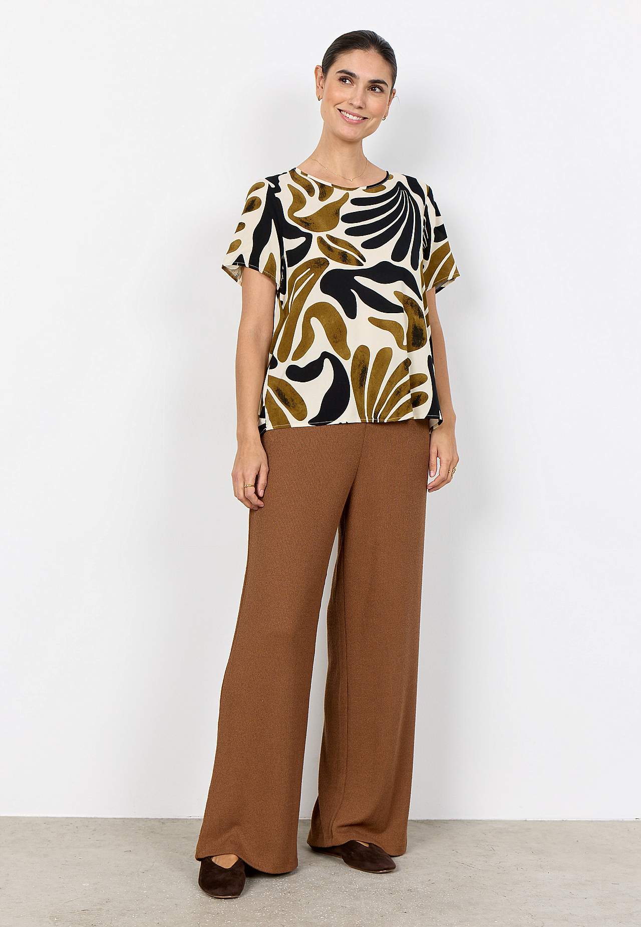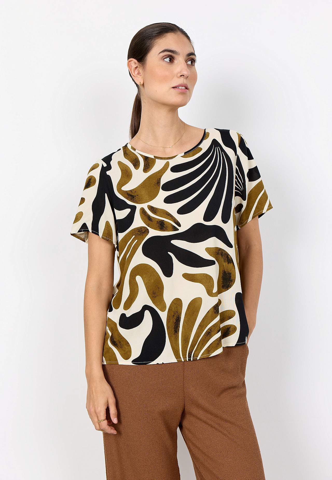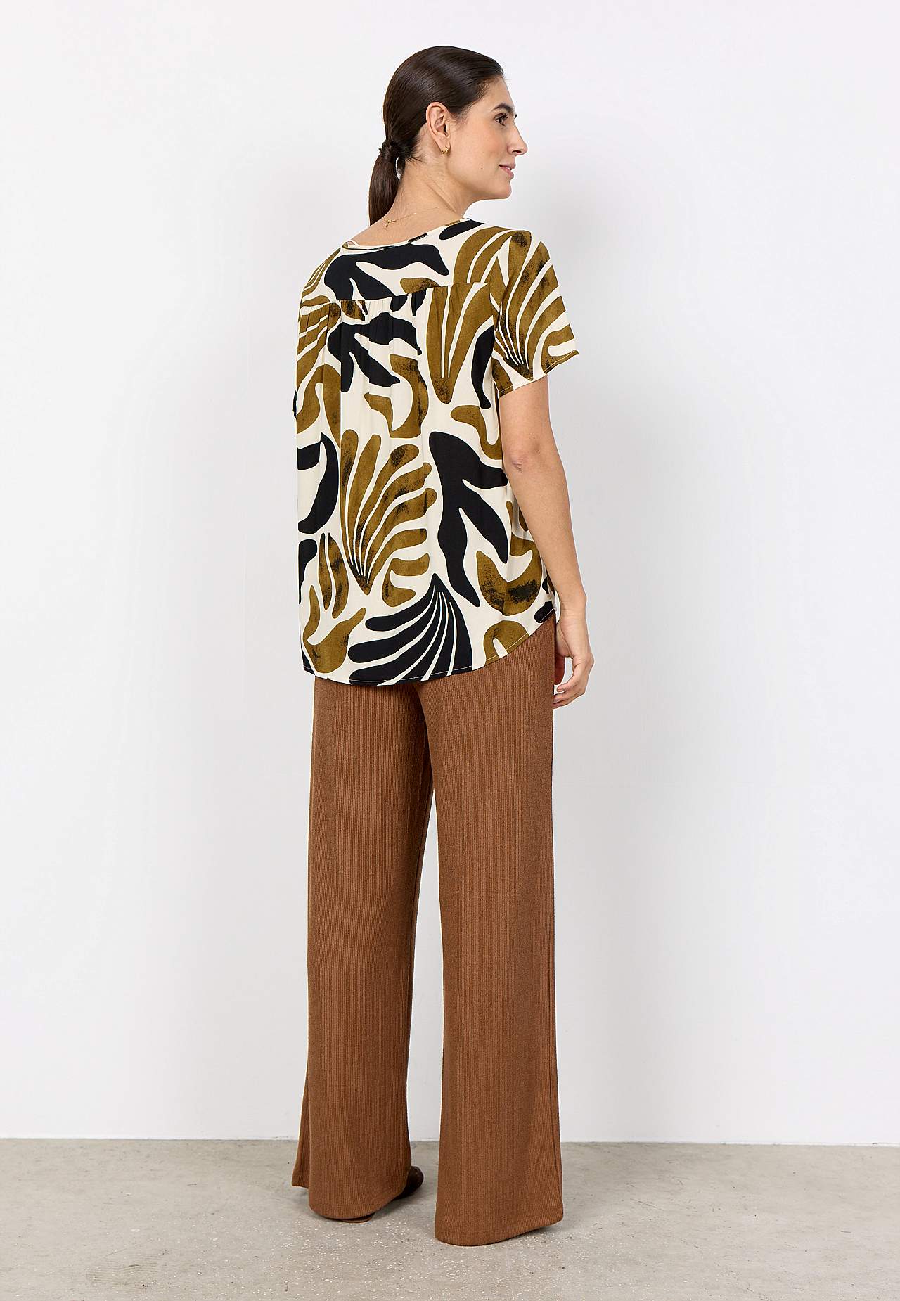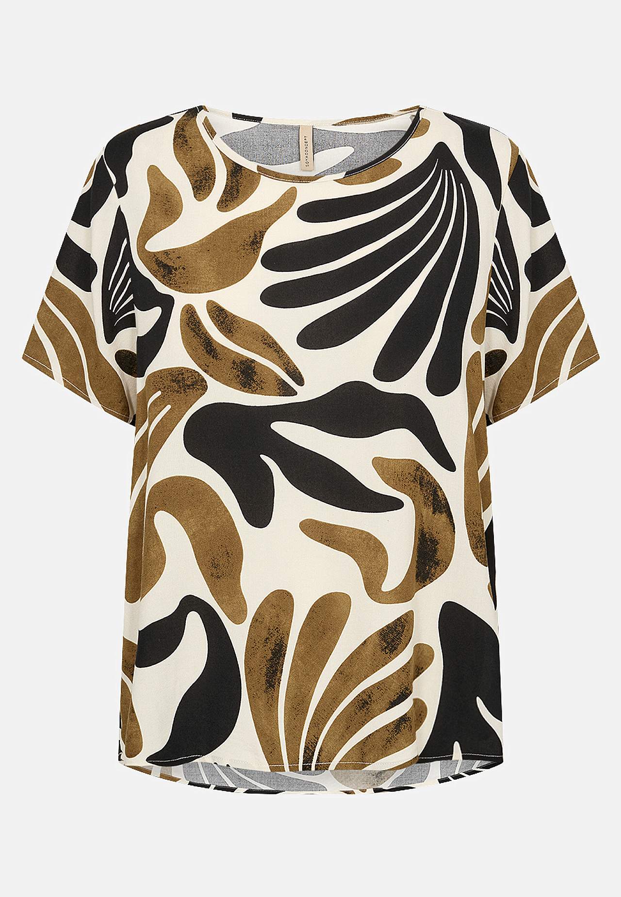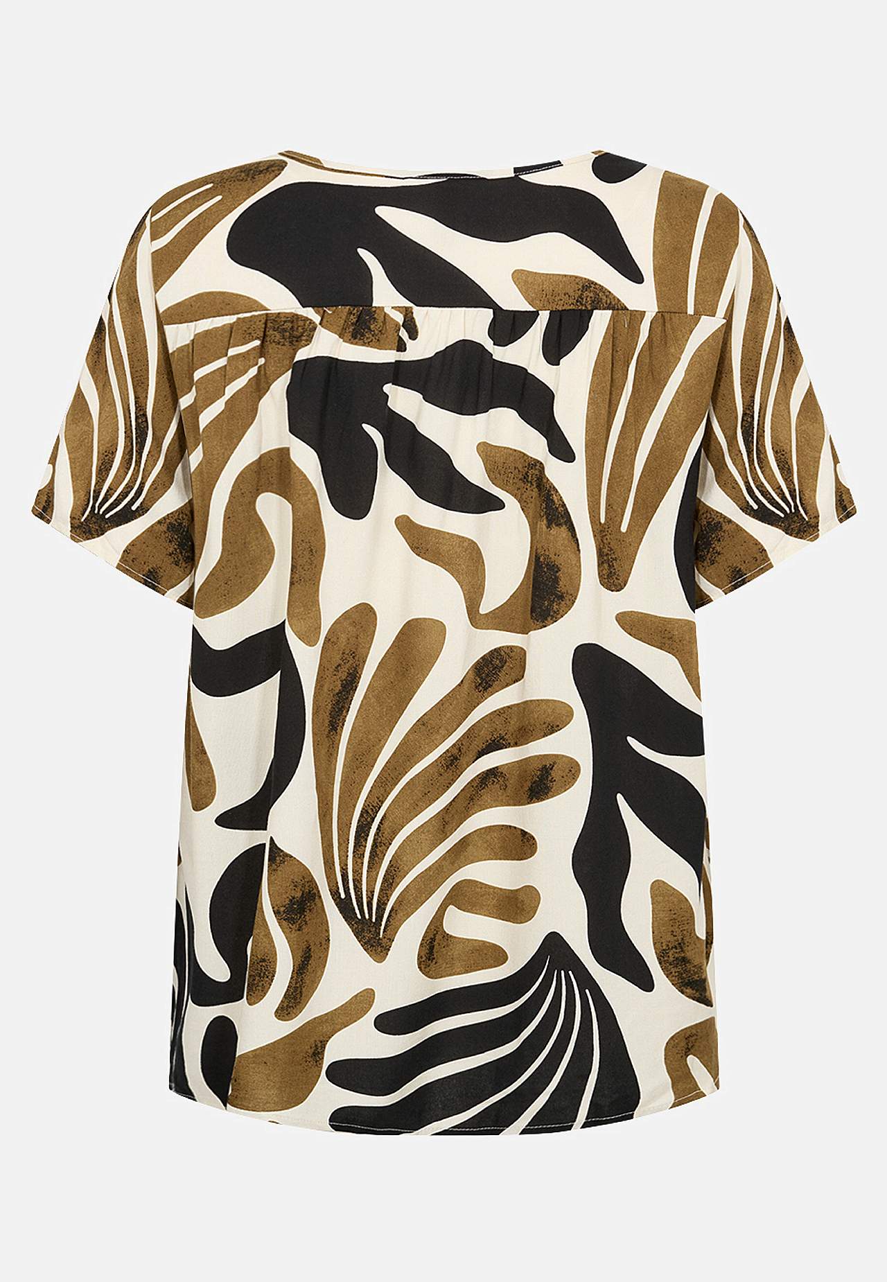 Pusero viileästä, joustavasta viskoosista. Tyylikäs kuviointi. Normaali istuvuus. Pyöreä pääntie. Lyhyet hihat. Kaarroke rypytyksellä takana. Lievästi pyöristetty, takaa hieman pidempi helma. Pituus olkapäästä n. 60 cm koossa M (40).