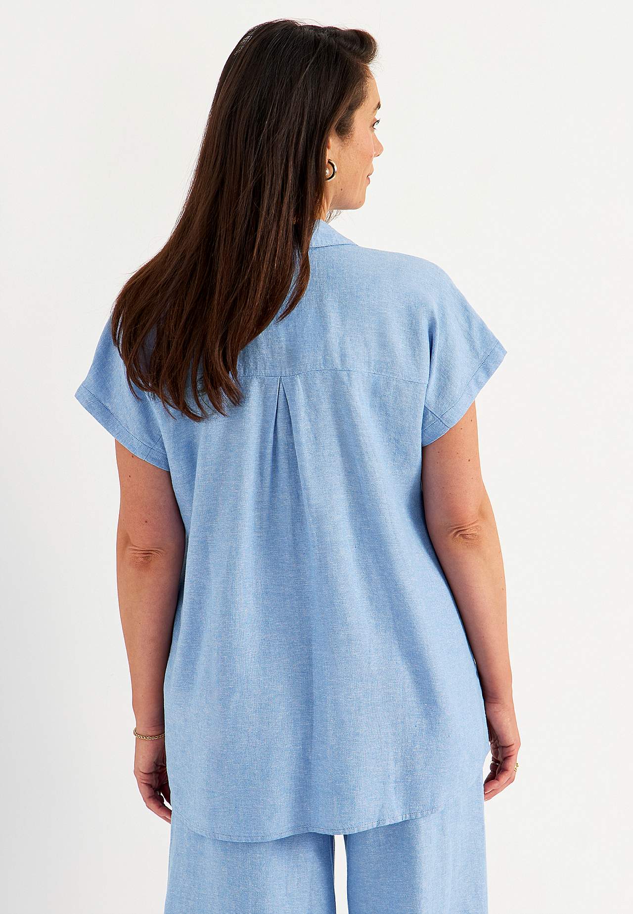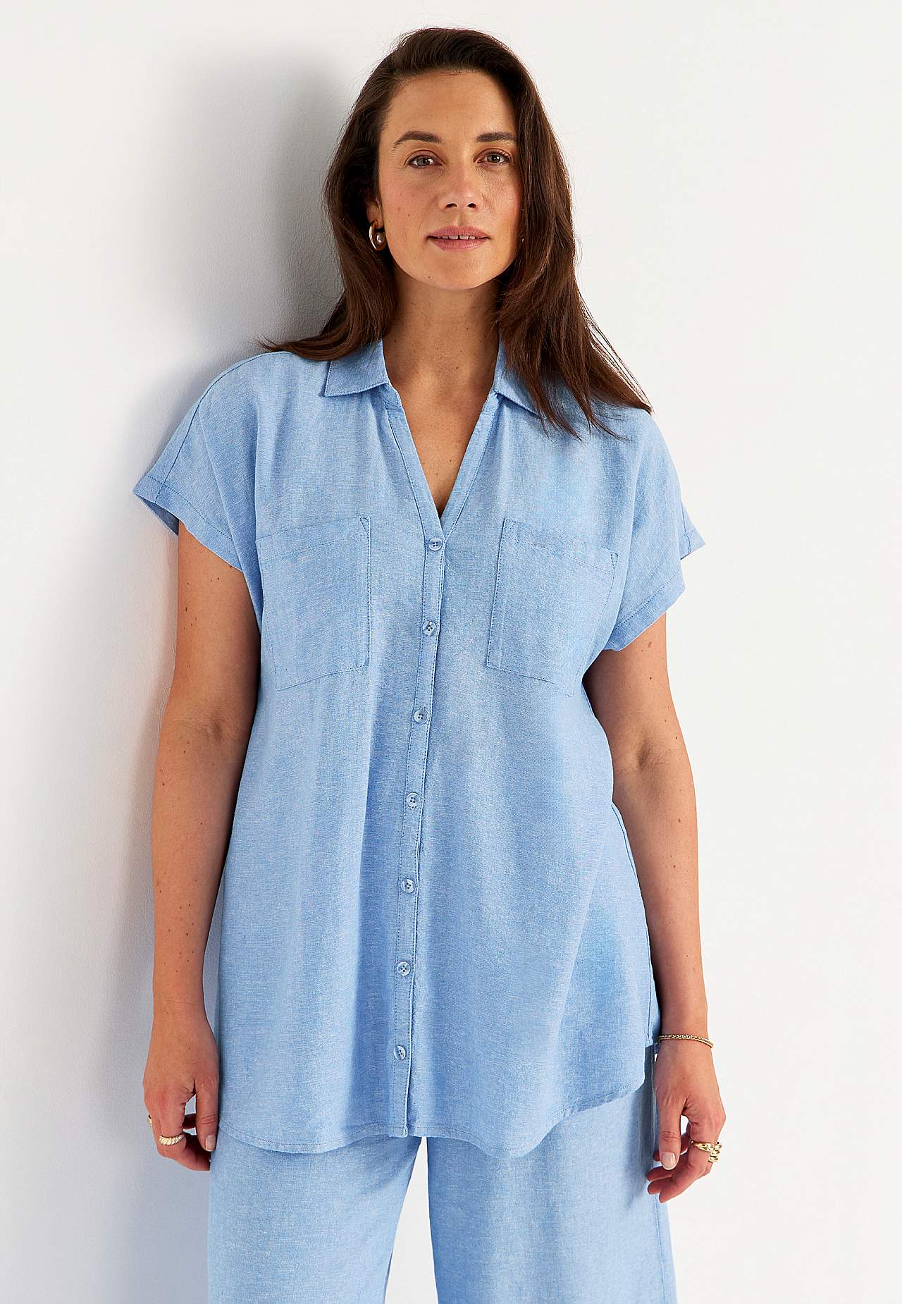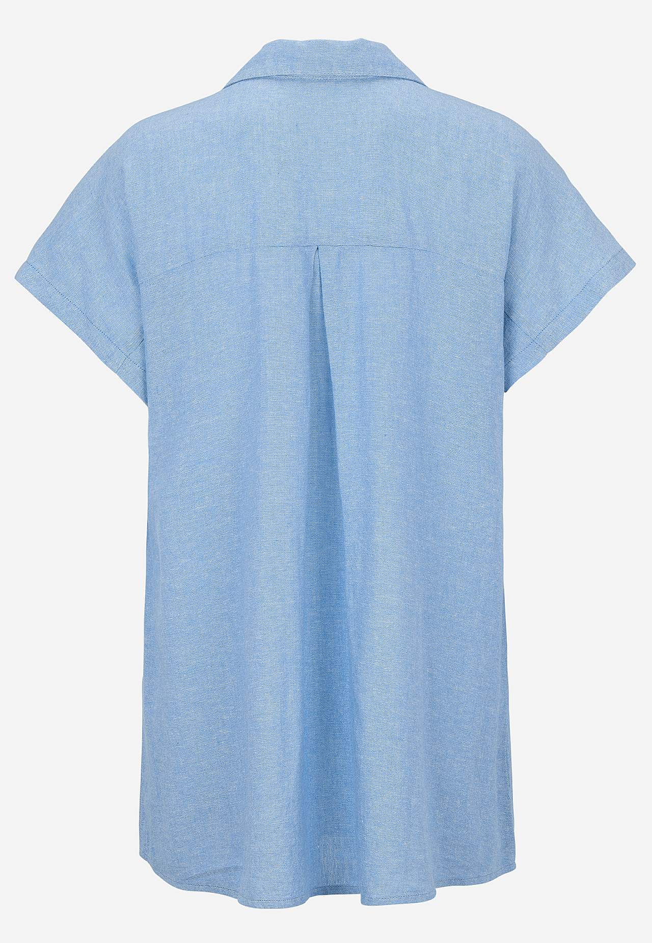 Kudottu pitkä paita ilmavasta pellava-viskoosiseoksesta. Pehmeä, hieman raskaampi materiaali luonnollisella rakenteella. Rento istuvuus. Rintataskut. Kaarroke takana koristeellisella vekillä. Pyöristetty helma. Pituus olkapäältä koon mukaan noin 77-84 cm.