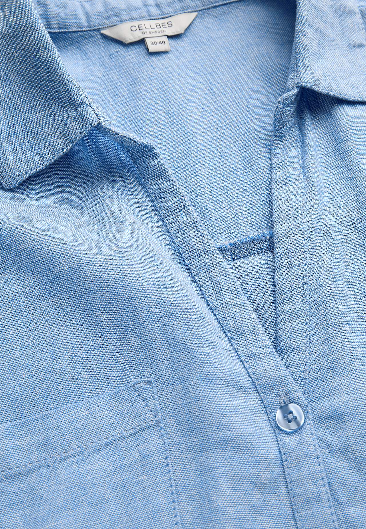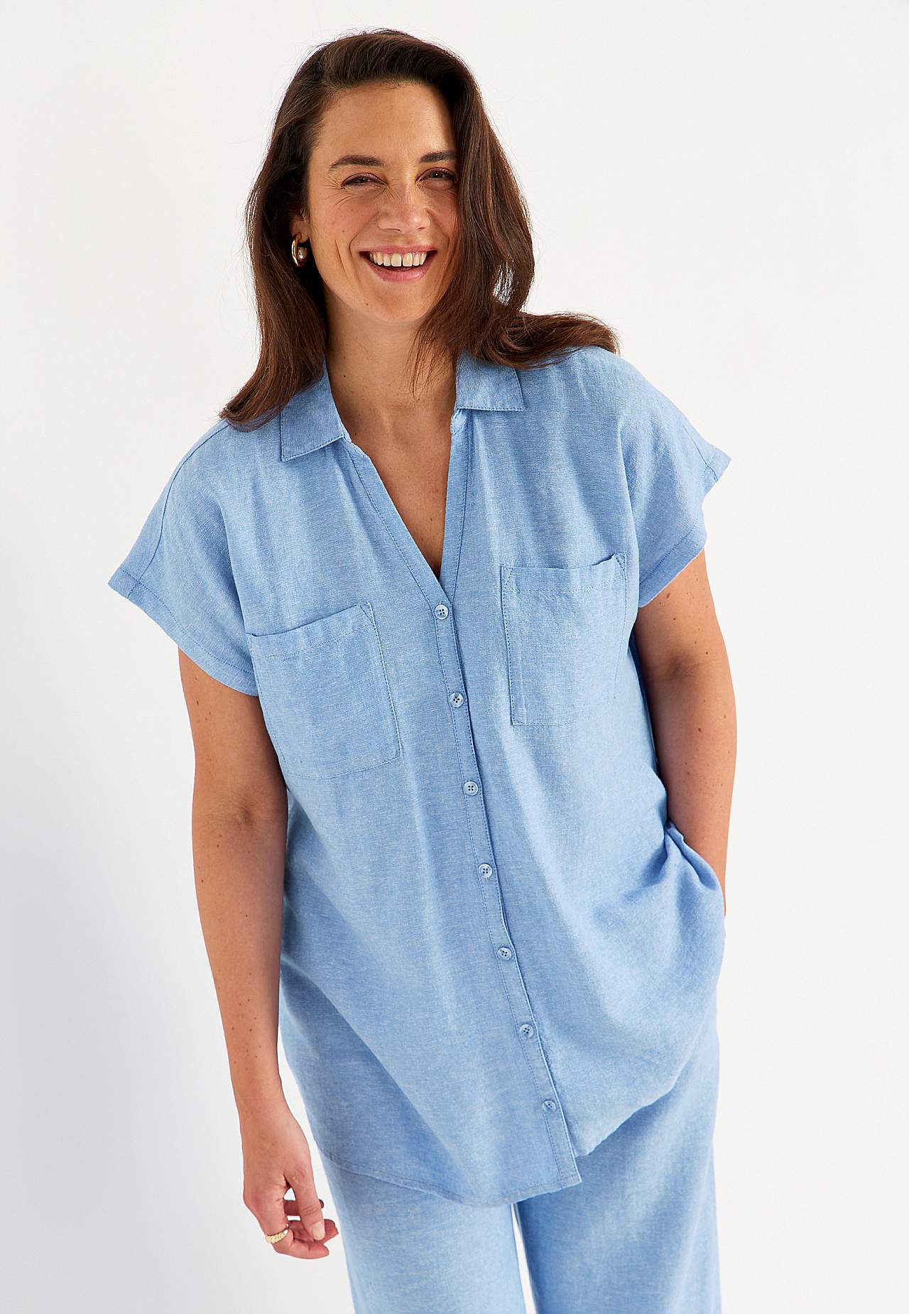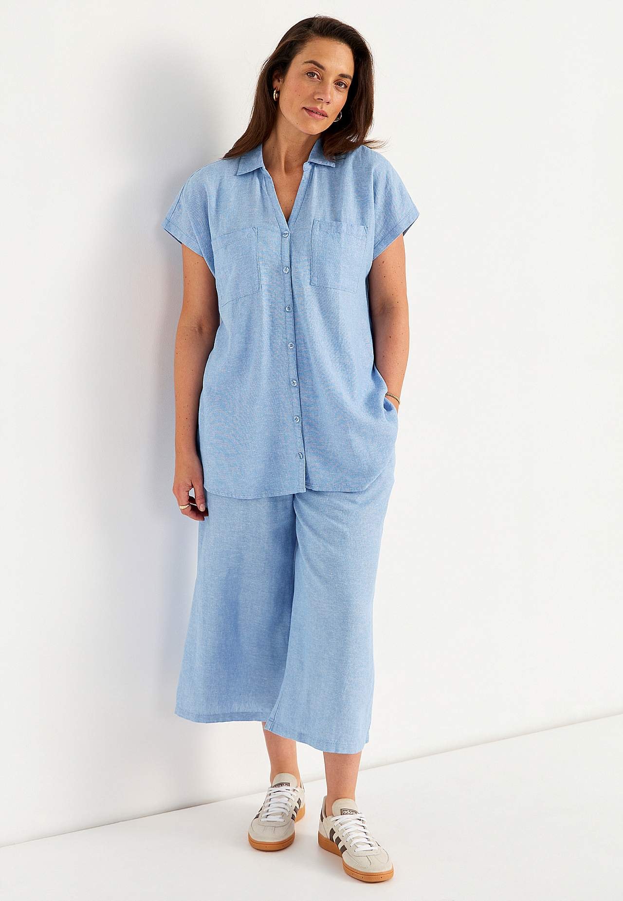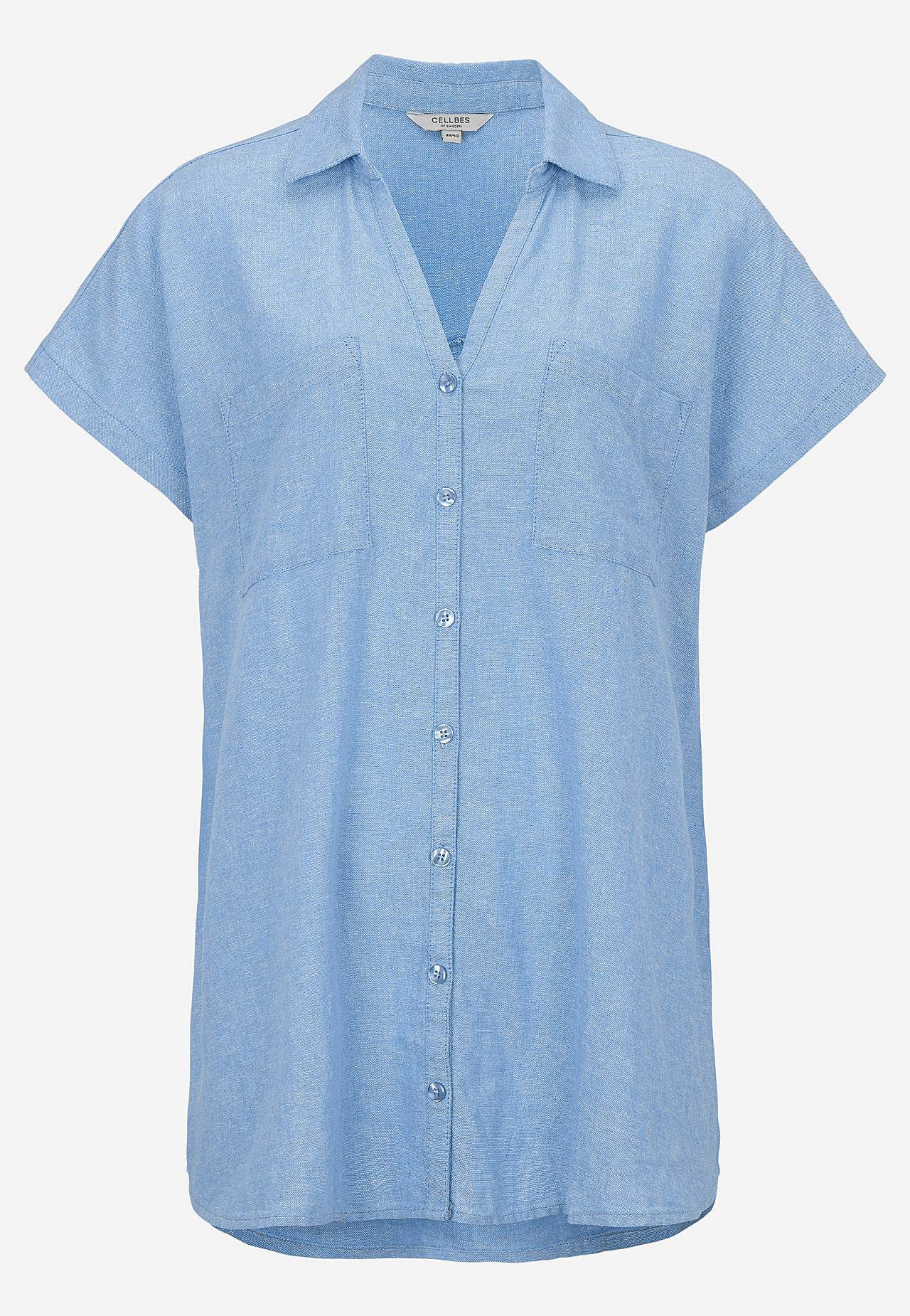 Kudottu pitkä paita ilmavasta pellava-viskoosiseoksesta. Pehmeä, hieman raskaampi materiaali luonnollisella rakenteella. Rento istuvuus. Rintataskut. Kaarroke takana koristeellisella vekillä. Pyöristetty helma. Pituus olkapäältä koon mukaan noin 77-84 cm.