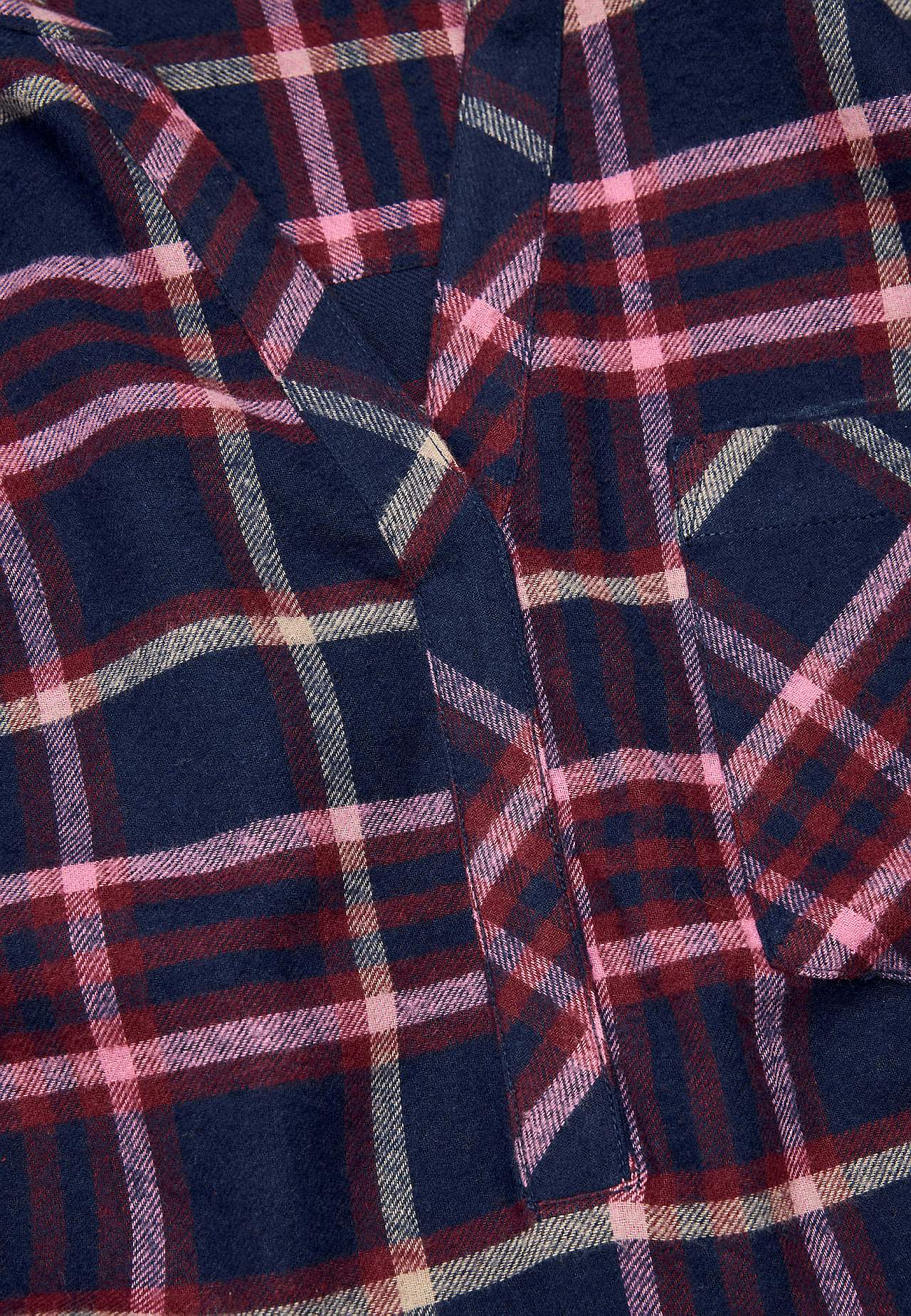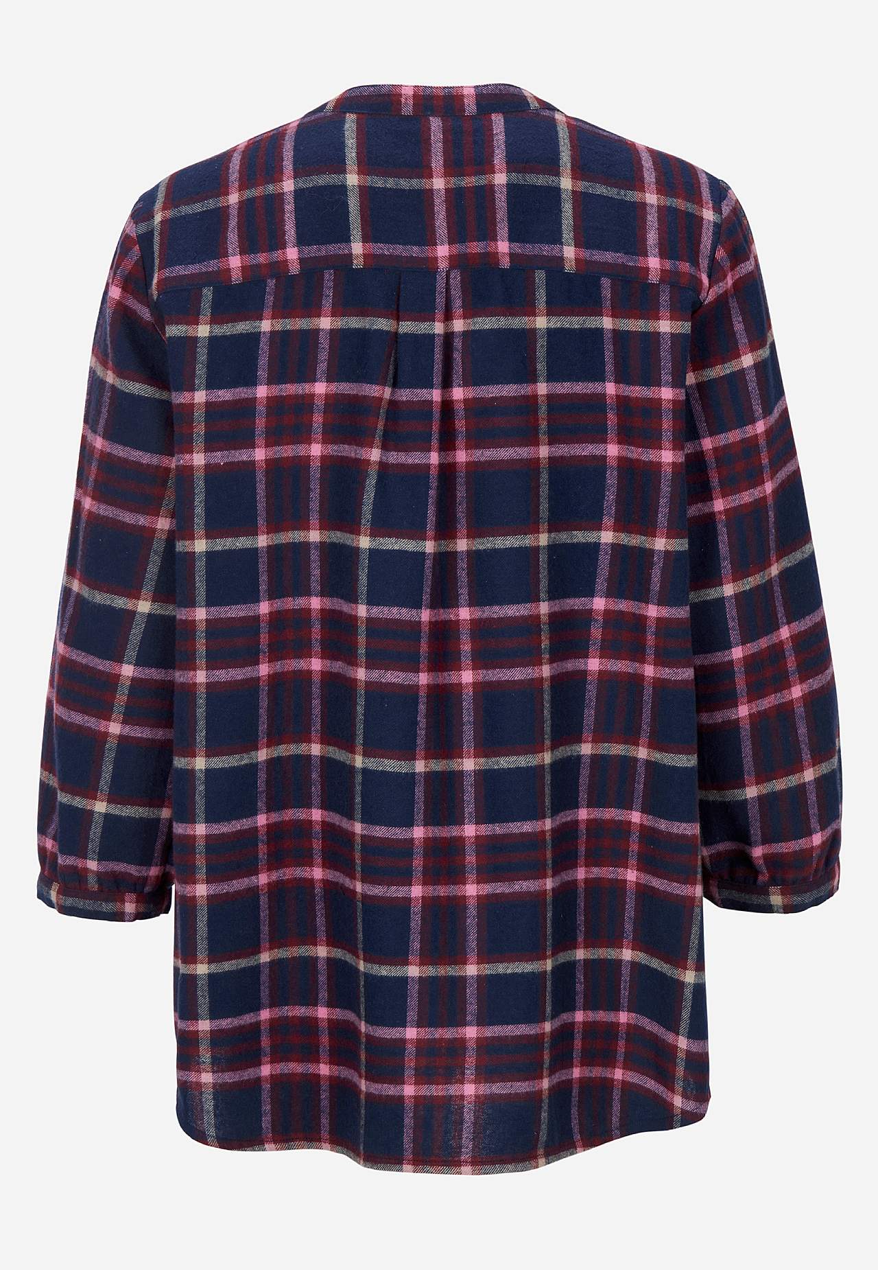 Pusero pehmeästä flanellista. Hieman A-linjainen malli. Normaali istuvuus. Pyöreä pääntie v-pääntiellä. 3/4-pituiset, leveät hihat ohuella kalvosimella. Laskos rintamuksessa. Kaarroke takana. Pyöristetty helma. Pituus olkapäältä koon mukaan noin 66-81 cm.