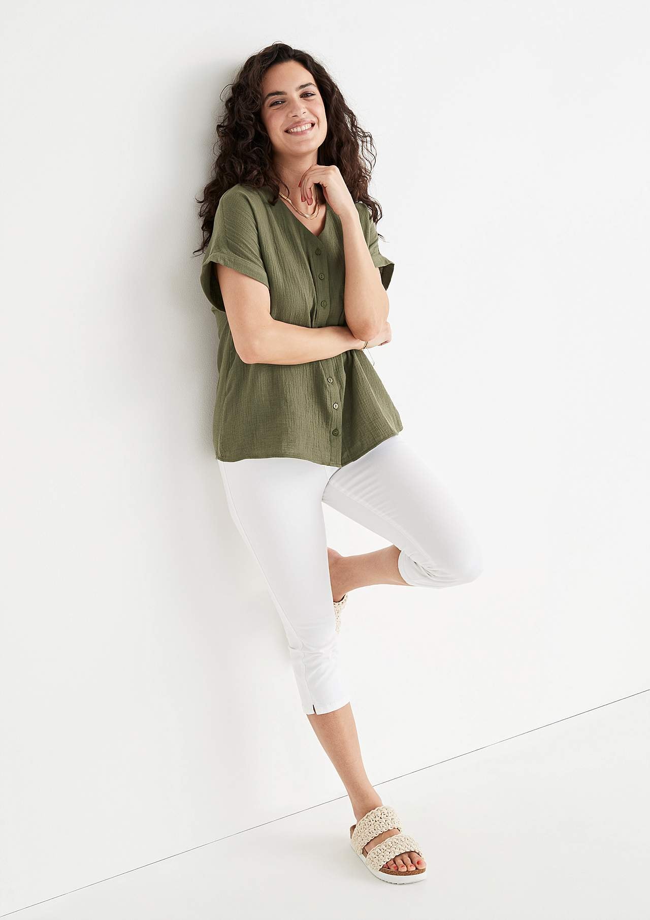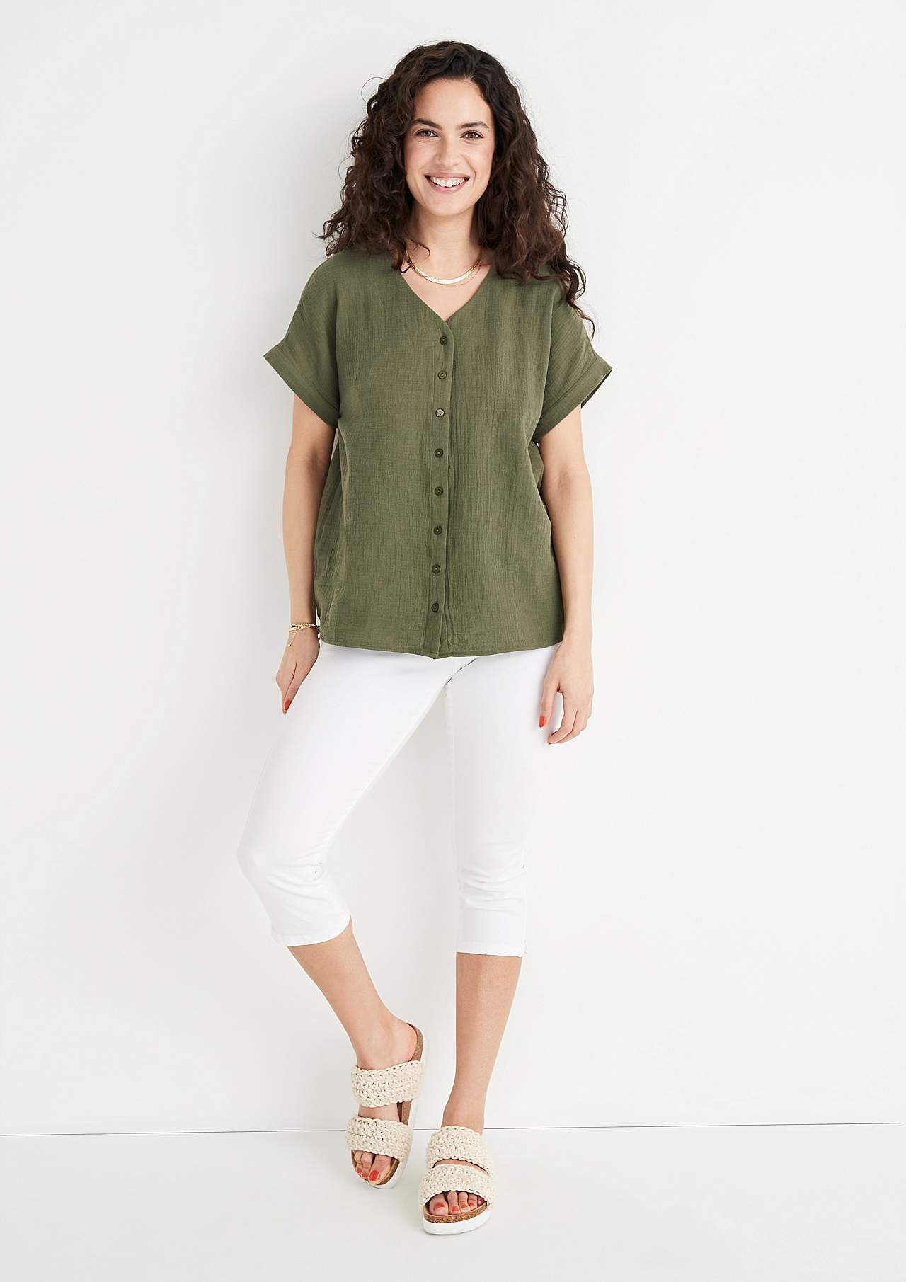 V-kaula-aukkoinen pusero lyhyillä hihoilla. Ihanan ilmava tuplaharsokangas vohvelikankaisella tekstuurilla. Napitettu malli. Rento istuvuus. Pituus olkapäältä koon mukaan noin 66-81 cm.