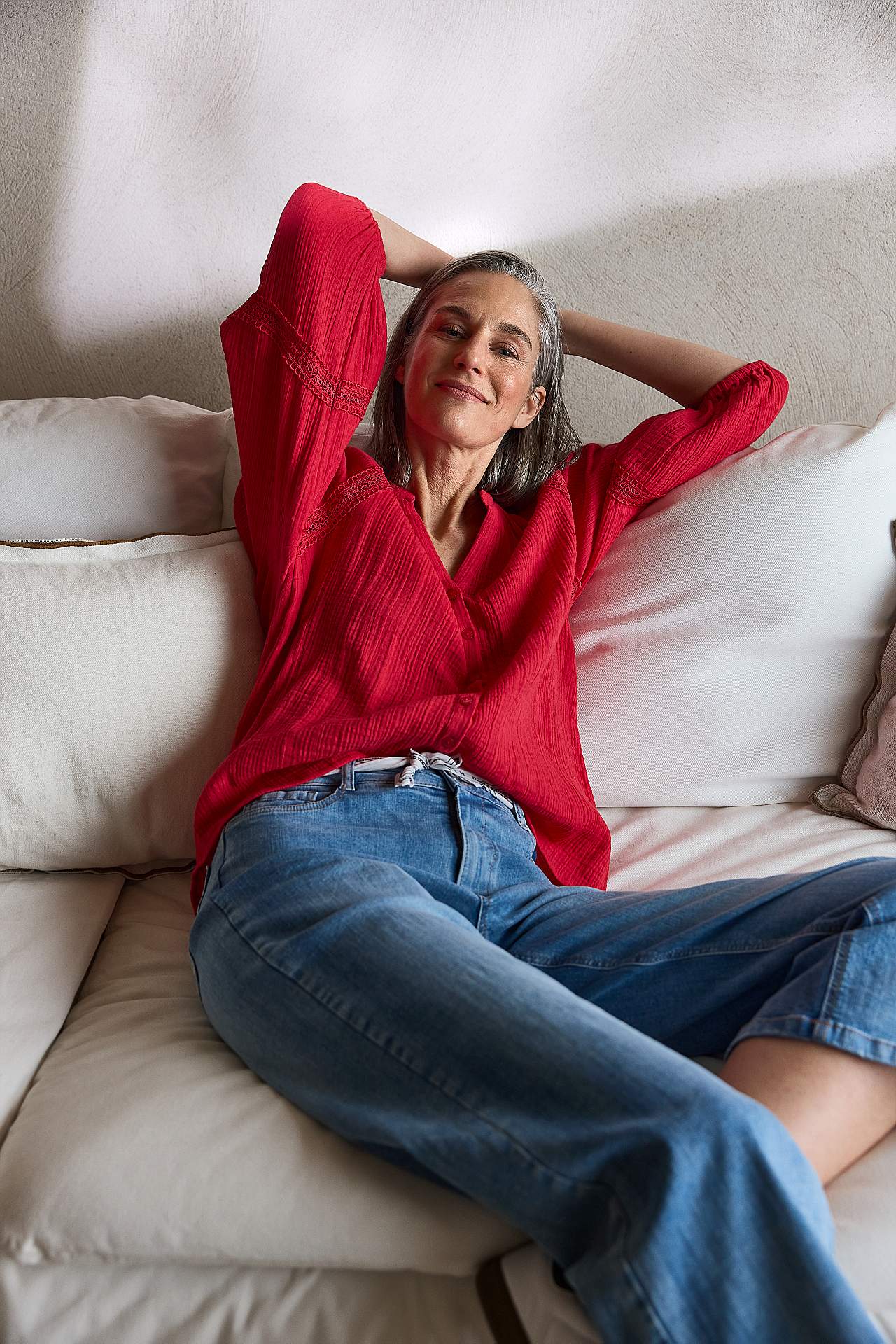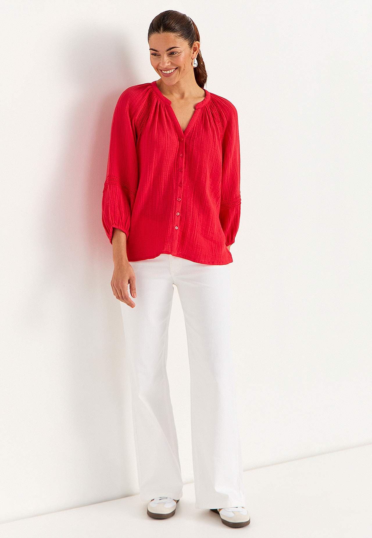Ilmava pusero kivoilla pitsireunuksilla hihoissa. Kudottu materiaali ihanasta puuvillamusliinista sommitelmalla. Löysä istuvuus. Pyöreä pääntie pienellä v-kaula-aukolla. Napit edessä. 3/4-pituiset, leveät raglanhihat puhvilla ja resorilla hihansuissa. Hienovaraisen yksityiskohtainen pitsireuna raglansaumaa ja hihan alaosaa ... Lue lisää