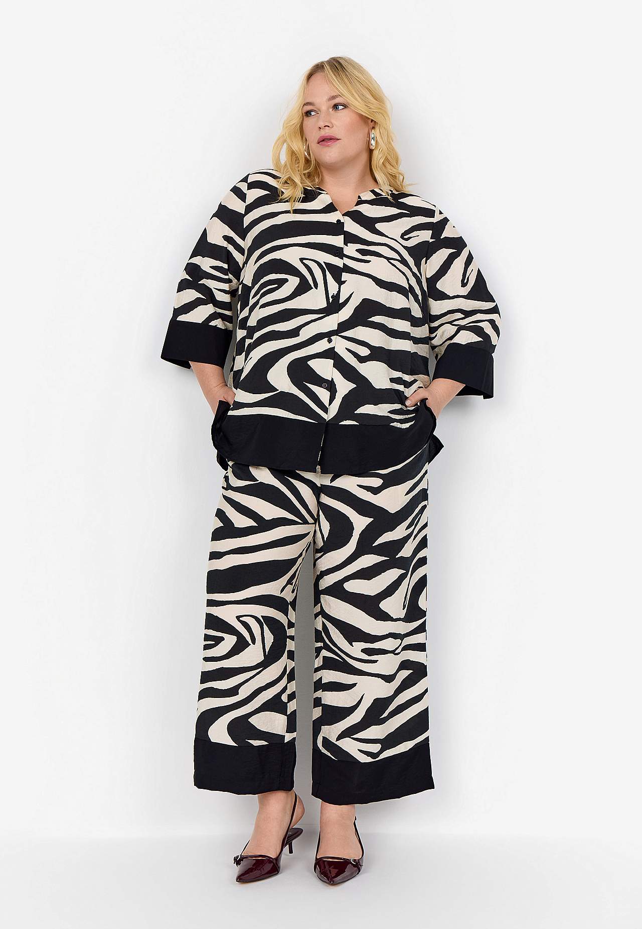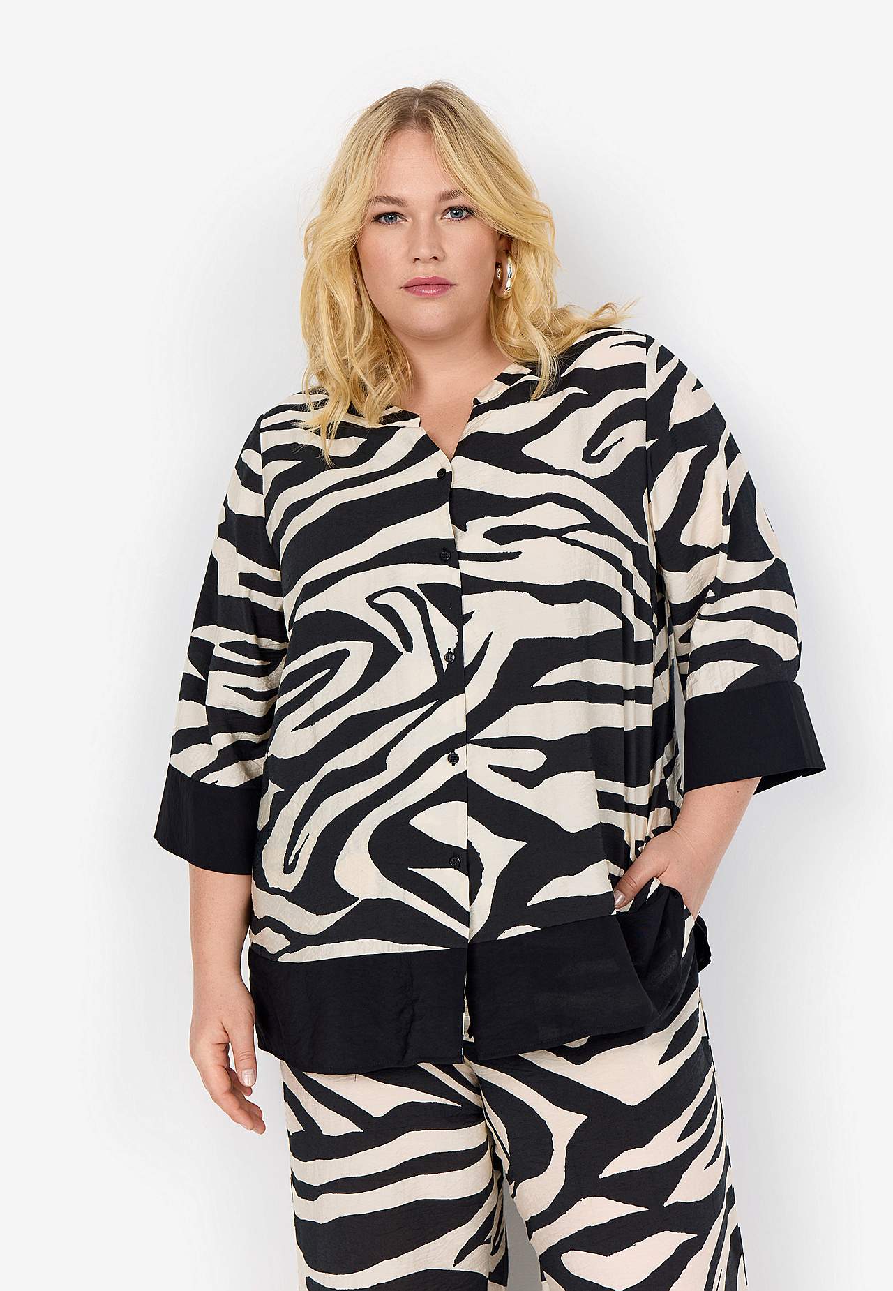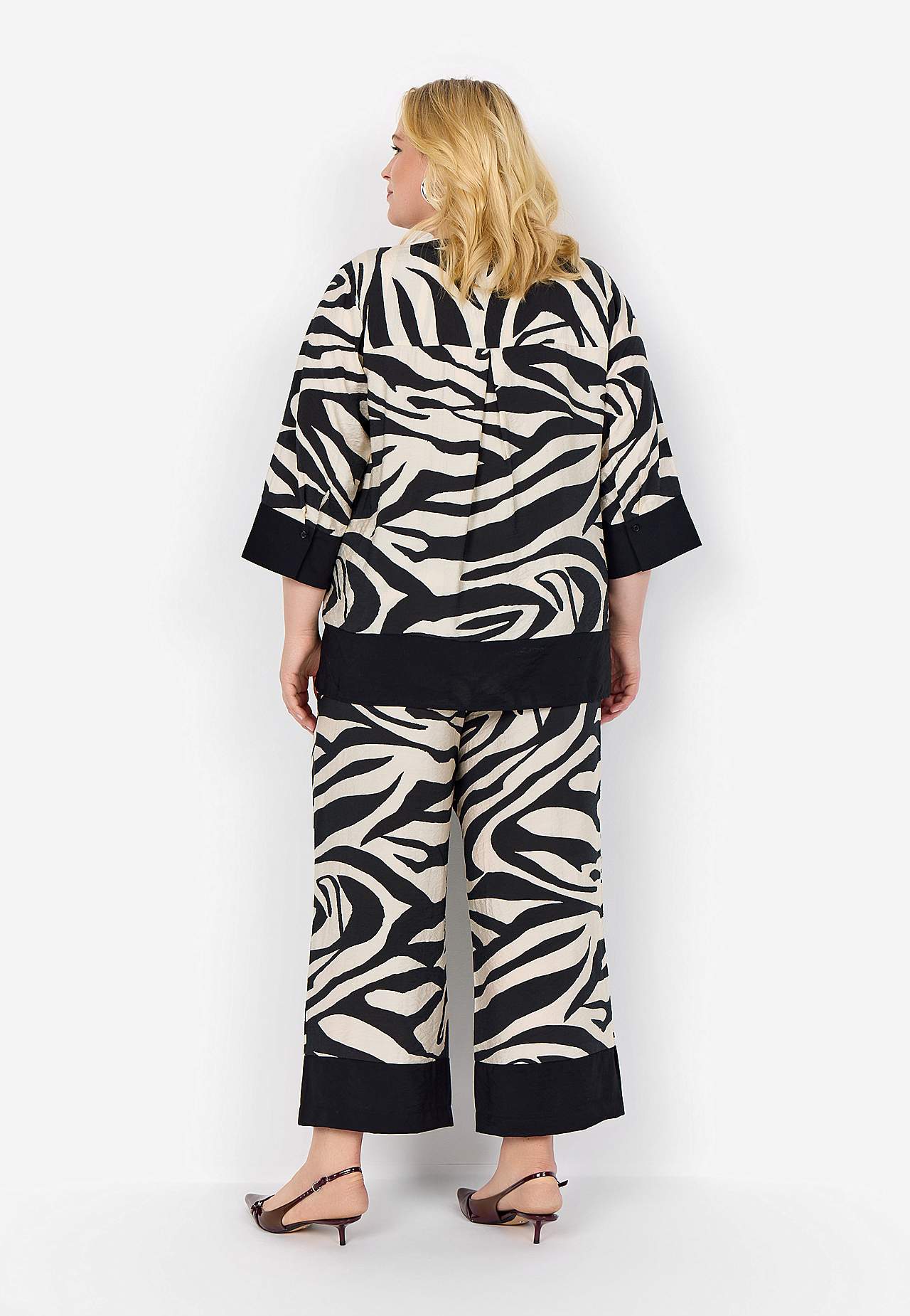 Kudottu, kuvioitu pusero. Tilava istuvuus. Kaula-aukko v-leikkauksella. Napitettu malli. Kaarroke takana komealla vekillä. 3/4-pituiset, leveät hihat kalvosimella ja napilla. Suora helma. PItuus noin 78 cm koossa M (46/48).