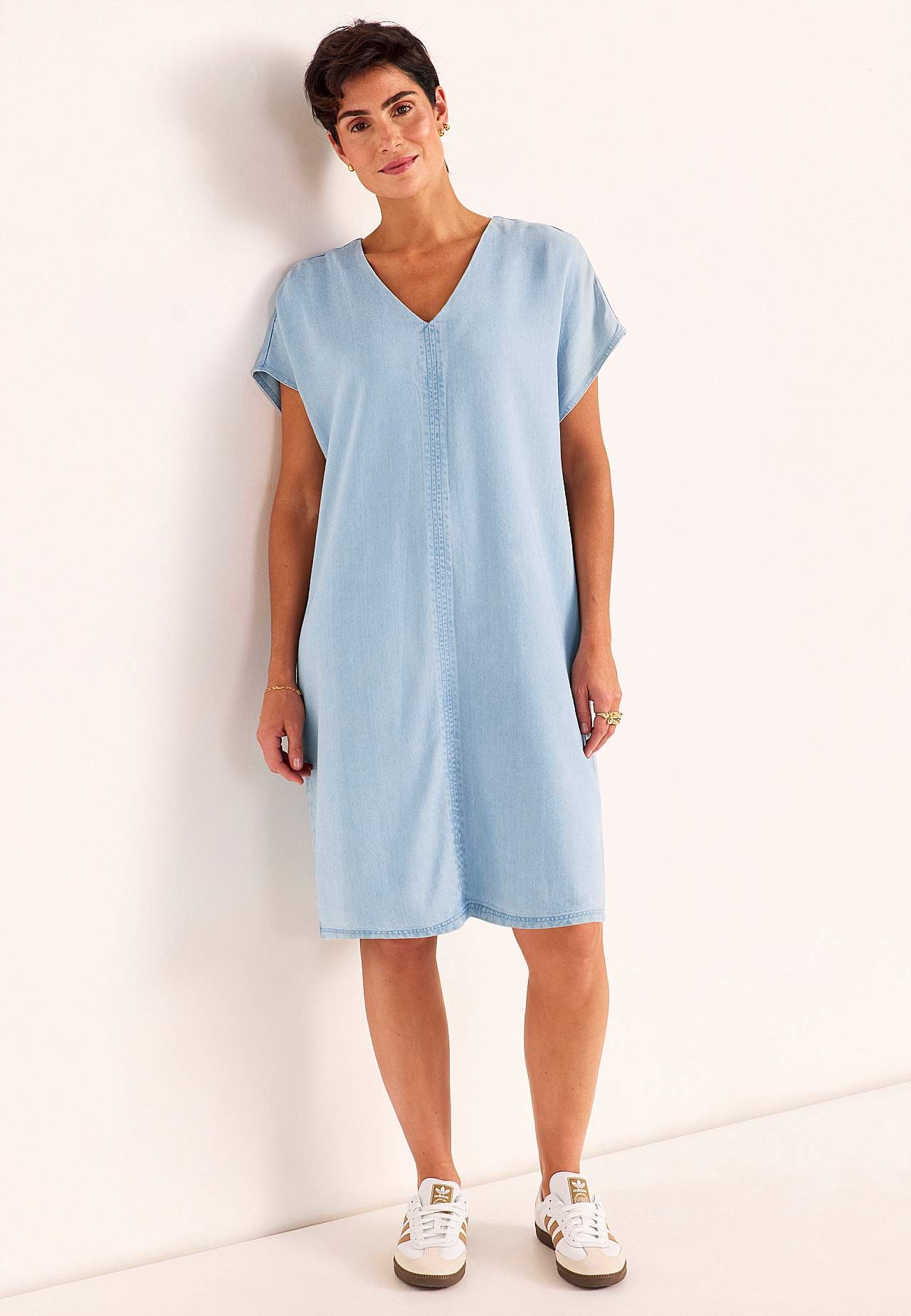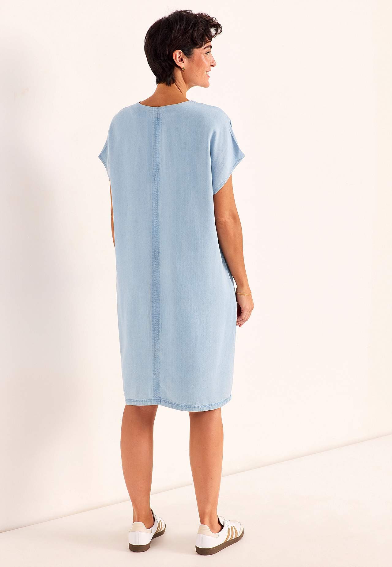 Mekko denimistä pehmeällä, uskomattoman mukavalla lyocellilla. Tyylikäs, yksinkertainen muotoilu. Sileä materiaali kivalla laskeutumisella. Suora, ylikokoinen istuvuus. V-kaula-aukkoinen pääntie ja hienot, keskellä olevat koristeommelet edessä ja takana. Lyhyet holkkihihat. Lievästi pyöristetty helma. Vaatteen pehmeän tunt... Lue lisää