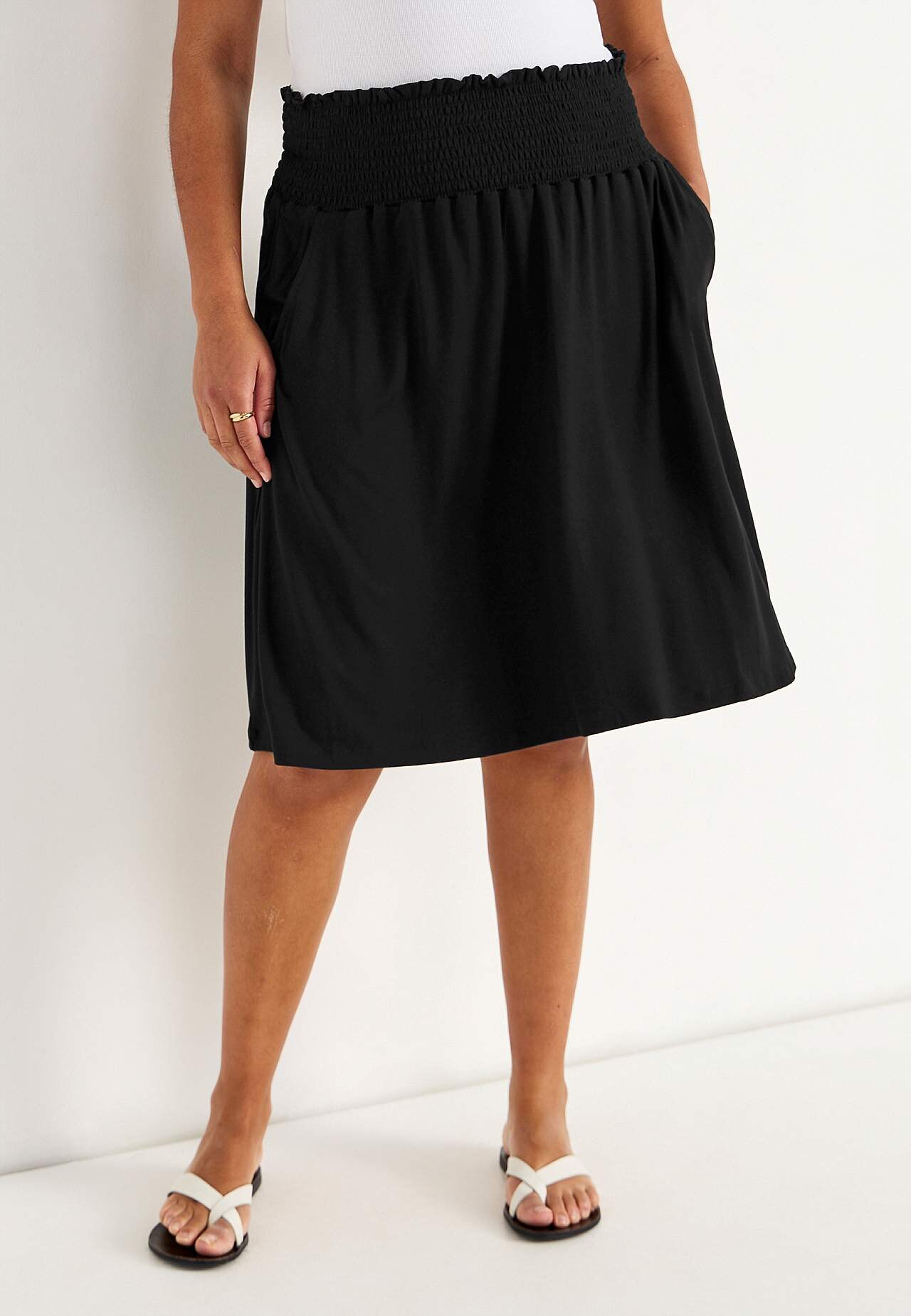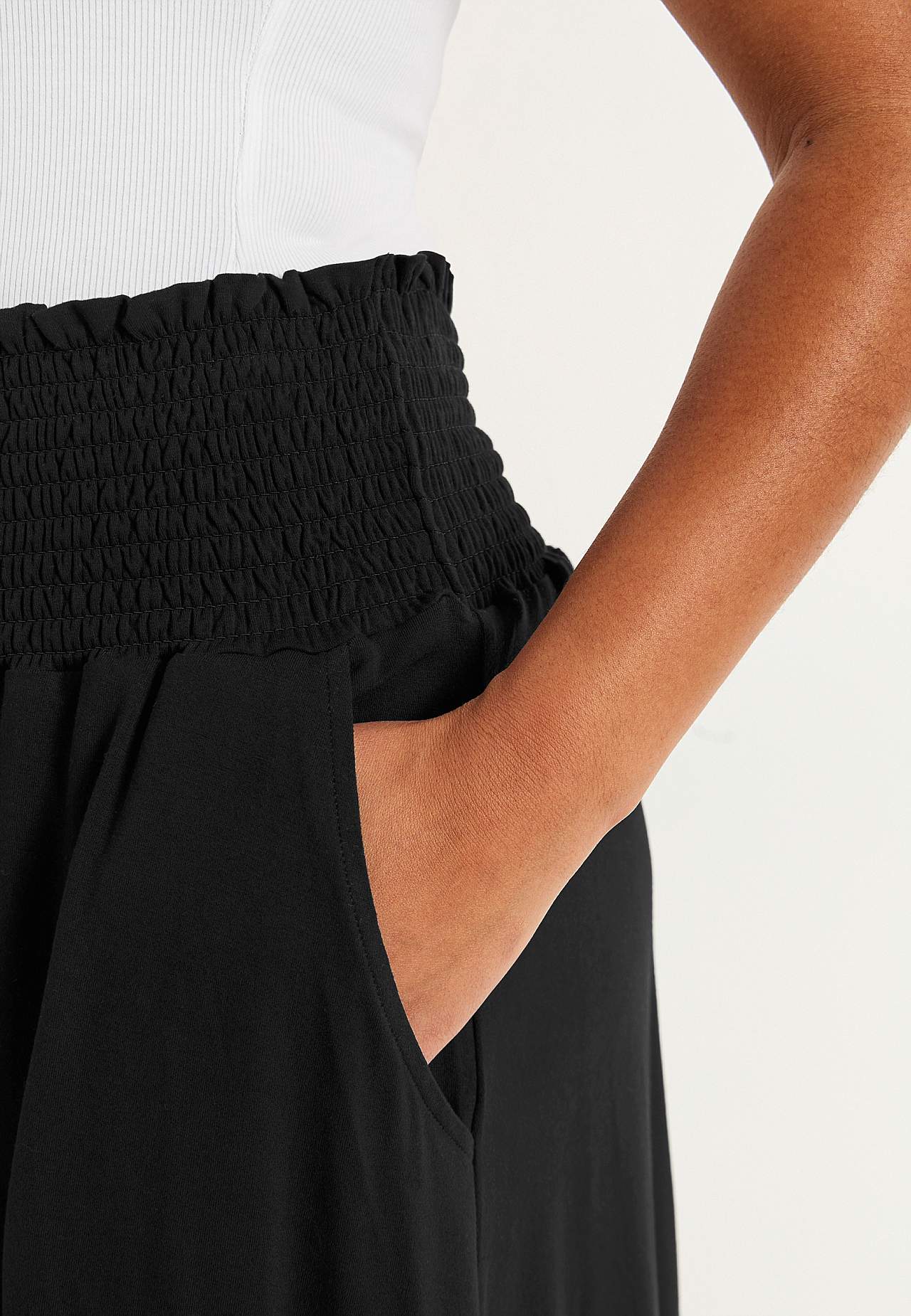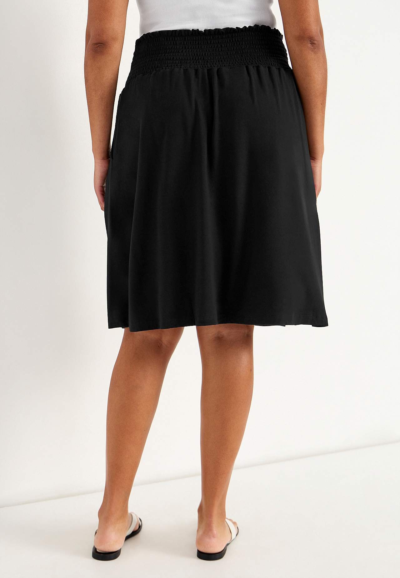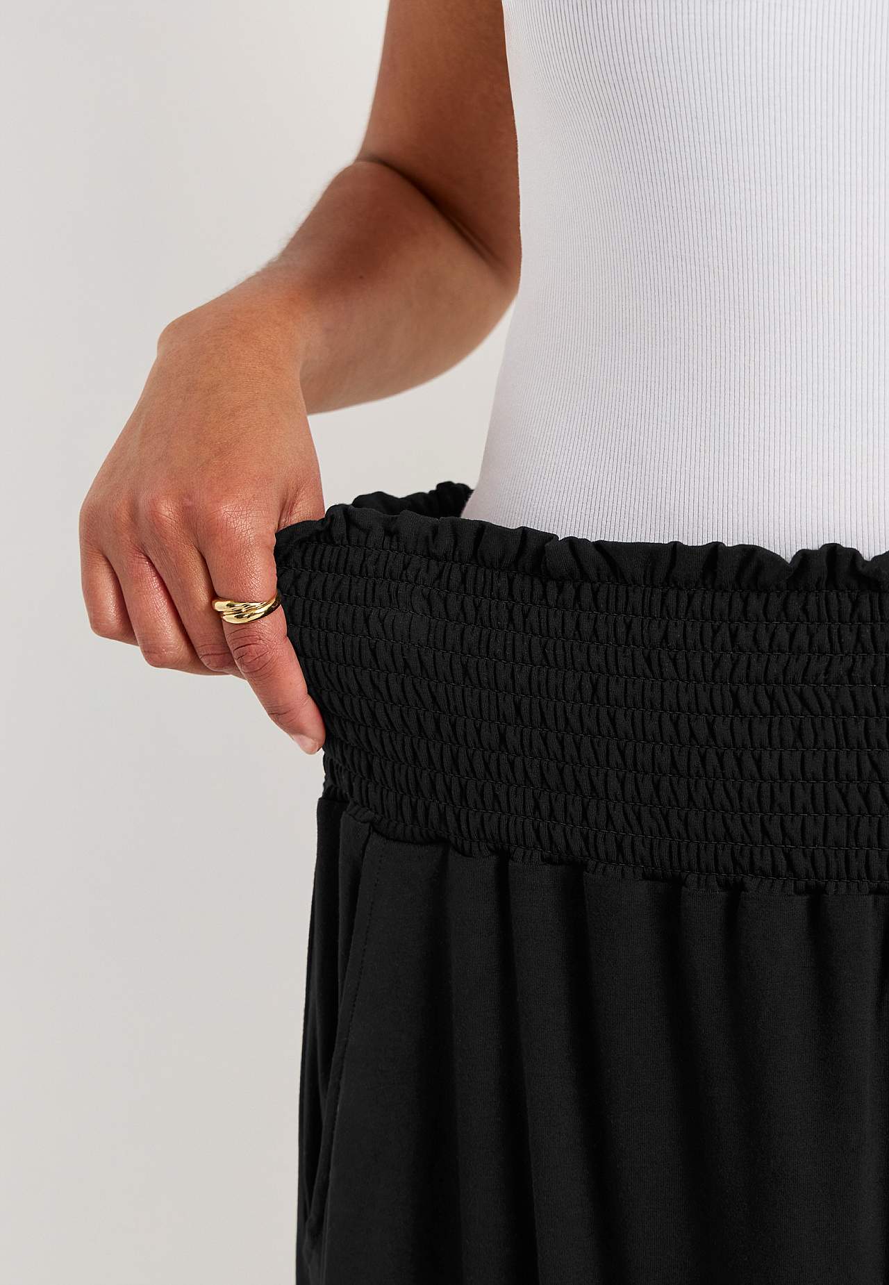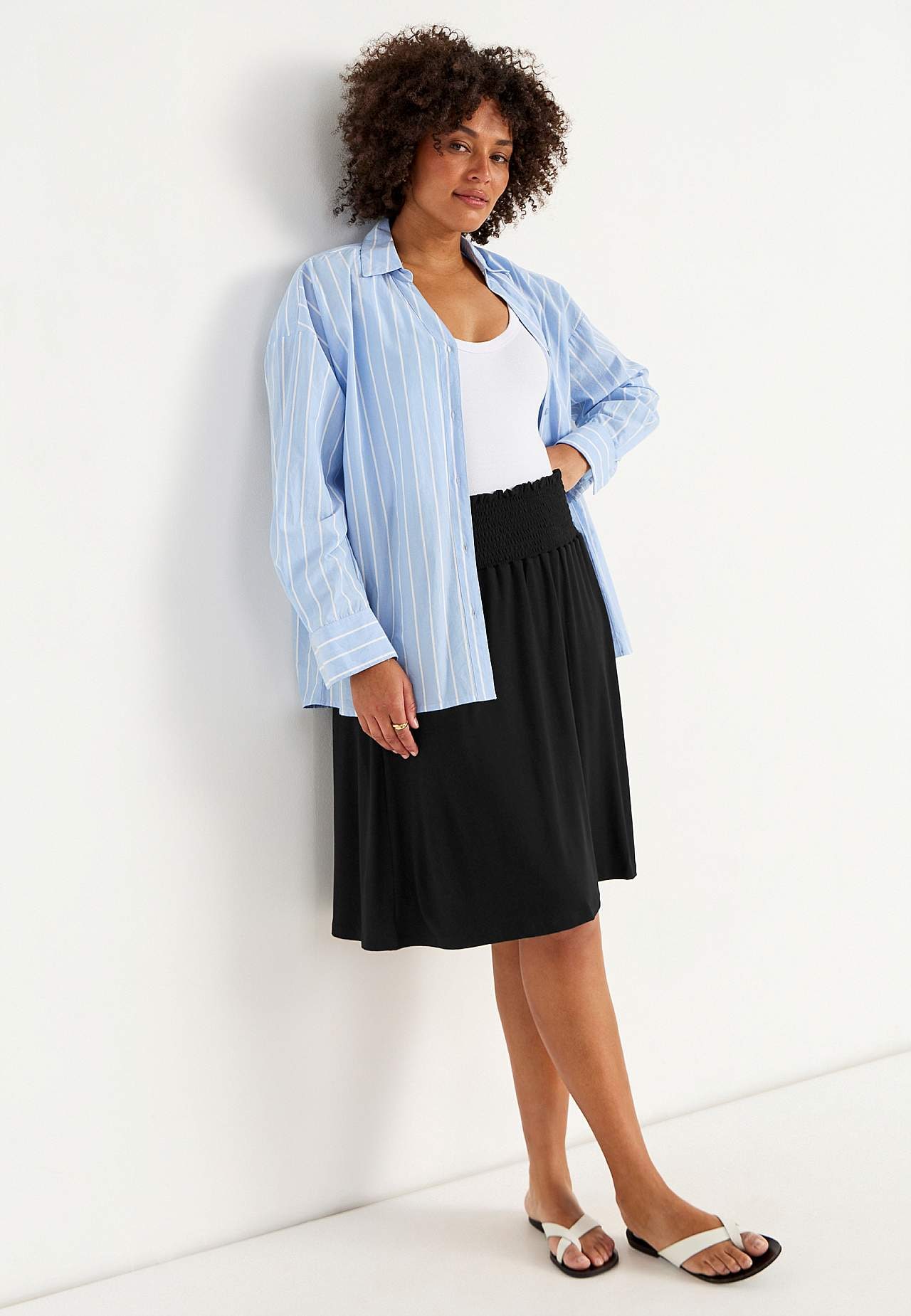 Levenevä hame pehmeästä, sileästä trikoosta. Leveä istuvuus. Leveä, mukava rypytys vyötäröllä. Taskut sivuilla. Suora helma. Pituus olkapäältä koon mukaan noin 60-62 cm.