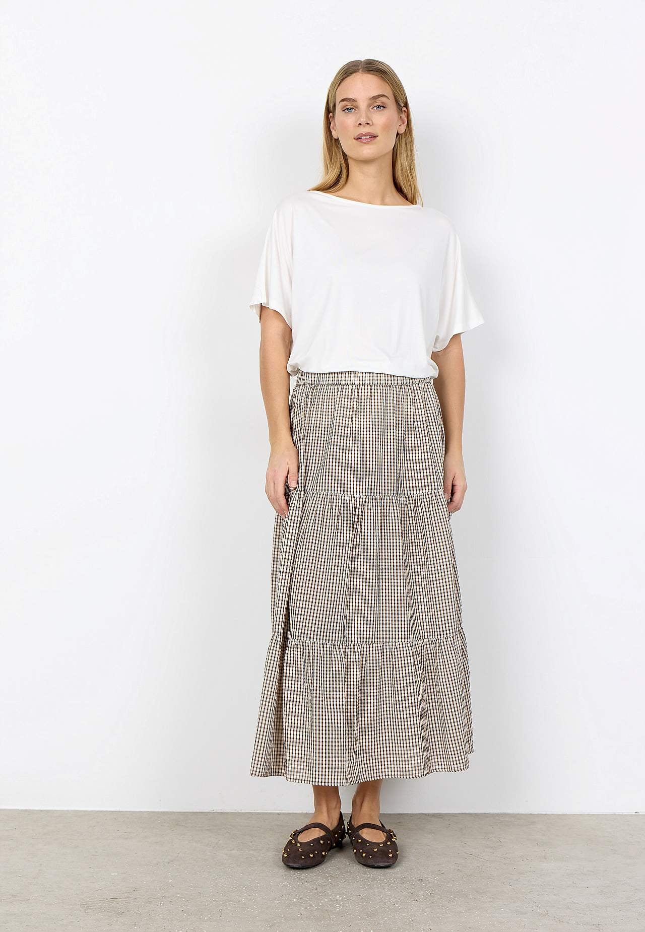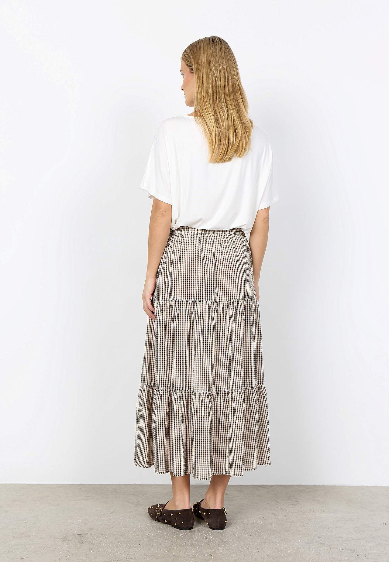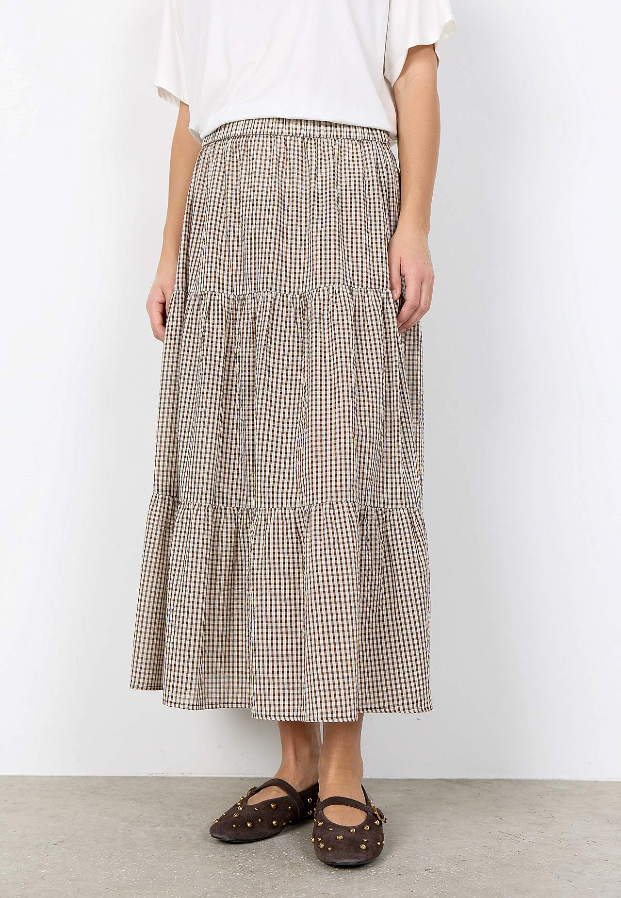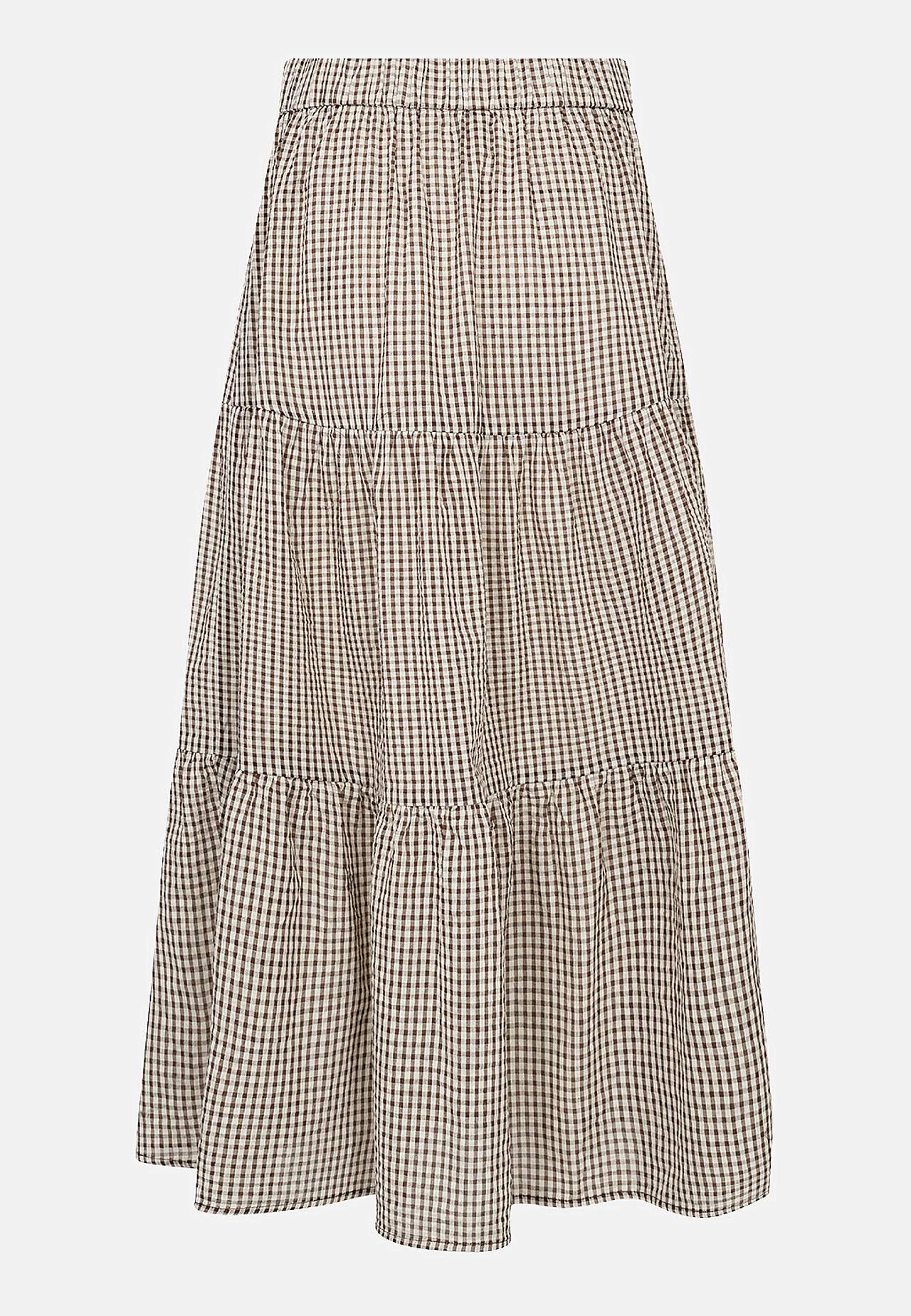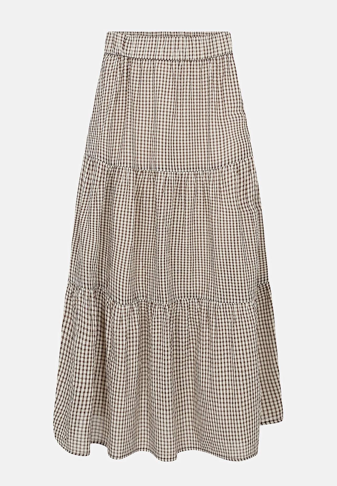 Vuorattu röyhelöhame lankavärjätyillä, pienillä ruuduilla. Ilmava materiaali orgaanisesta, pehmeästä puuvillasta. A-linjainen istuvuus kivalla leveydellä alhaalla. Mukava, leveä joustava vyötärö. Vuori pehmeästä viskoosista. Suora helma. PItuus noin 90 cm koossa S (38).
