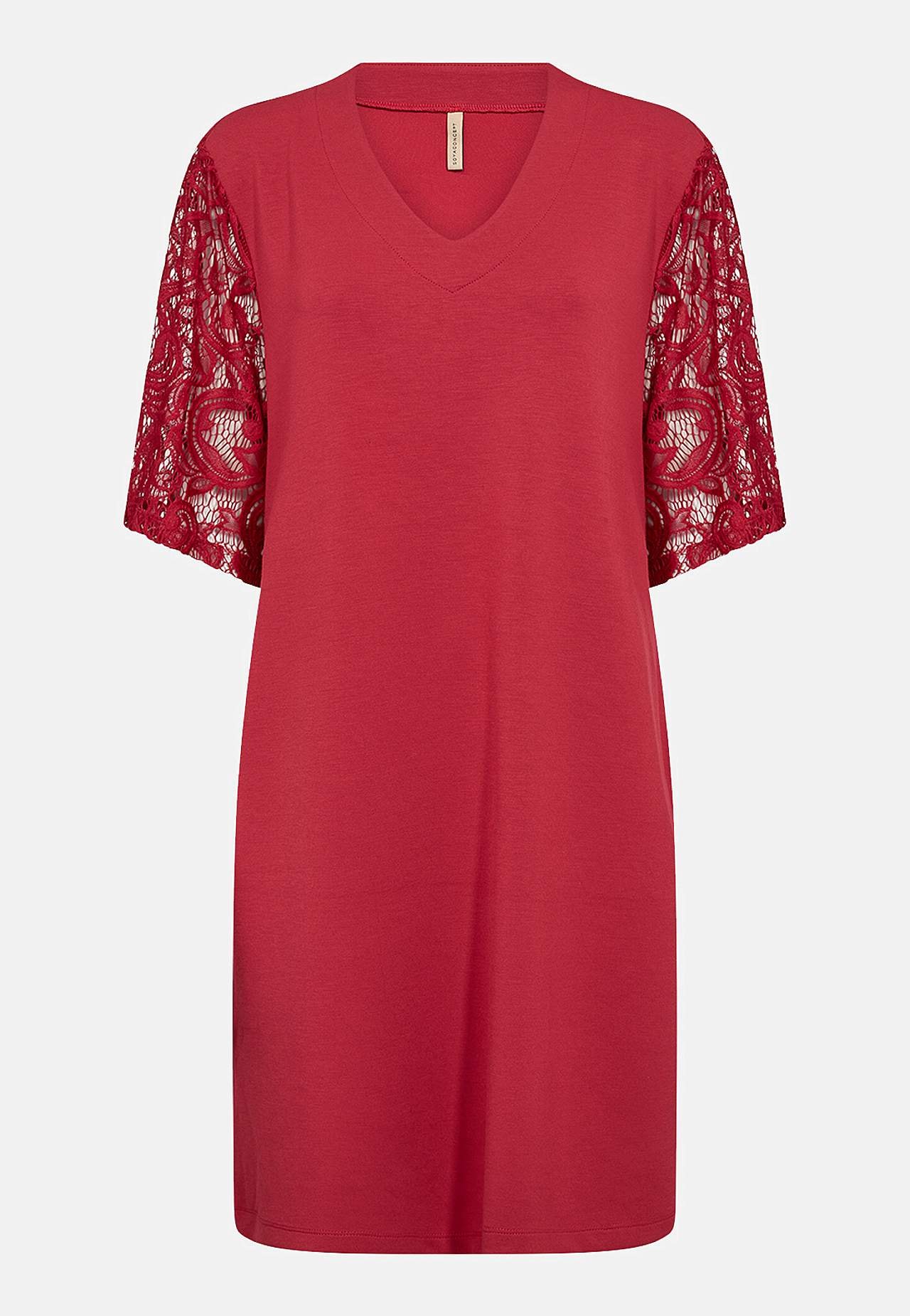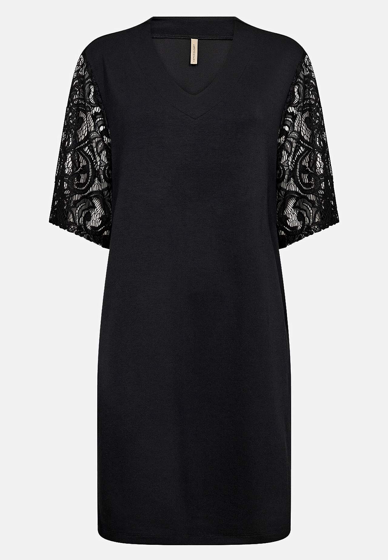 Mekko ihanan pehmeästä modaalisekoitteesta ja hieman paksummasta trikoosta. Suora istuvuus. Lyhyt malli. V-kaula-aukko. Sivutaskut. Elegantit pitsihihat. 3/4-pituiset hihat. Suora helma. Pituus olkapäästä n. 98 cm koossa S (38).