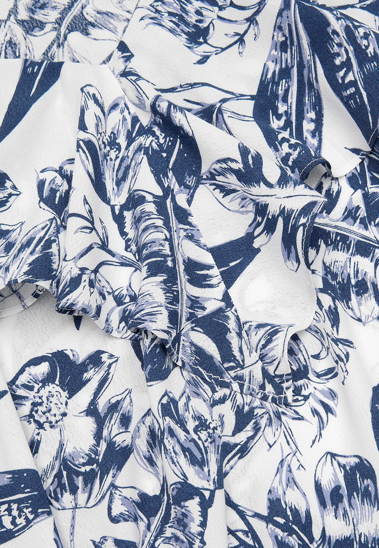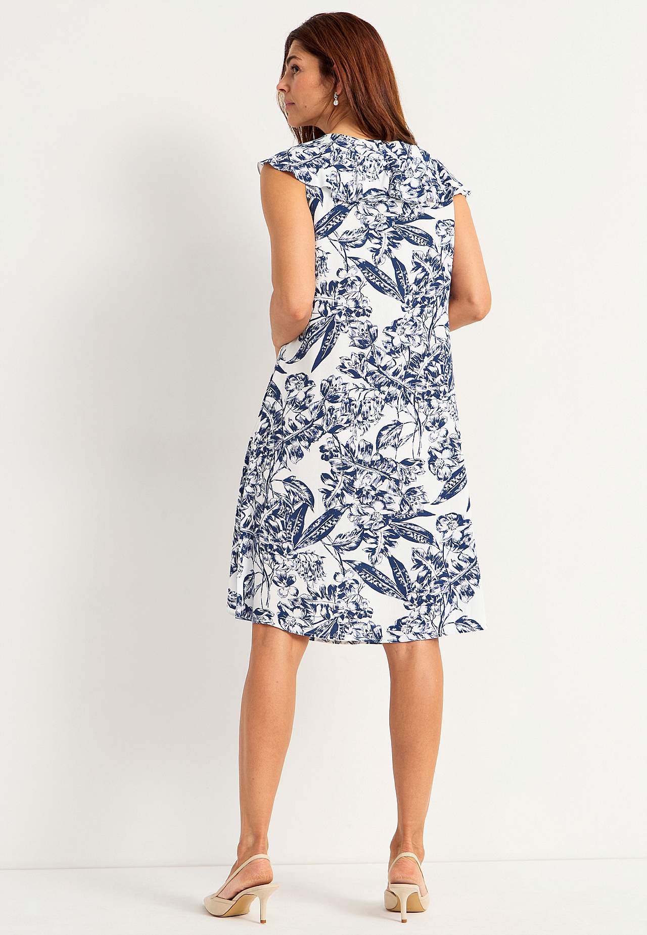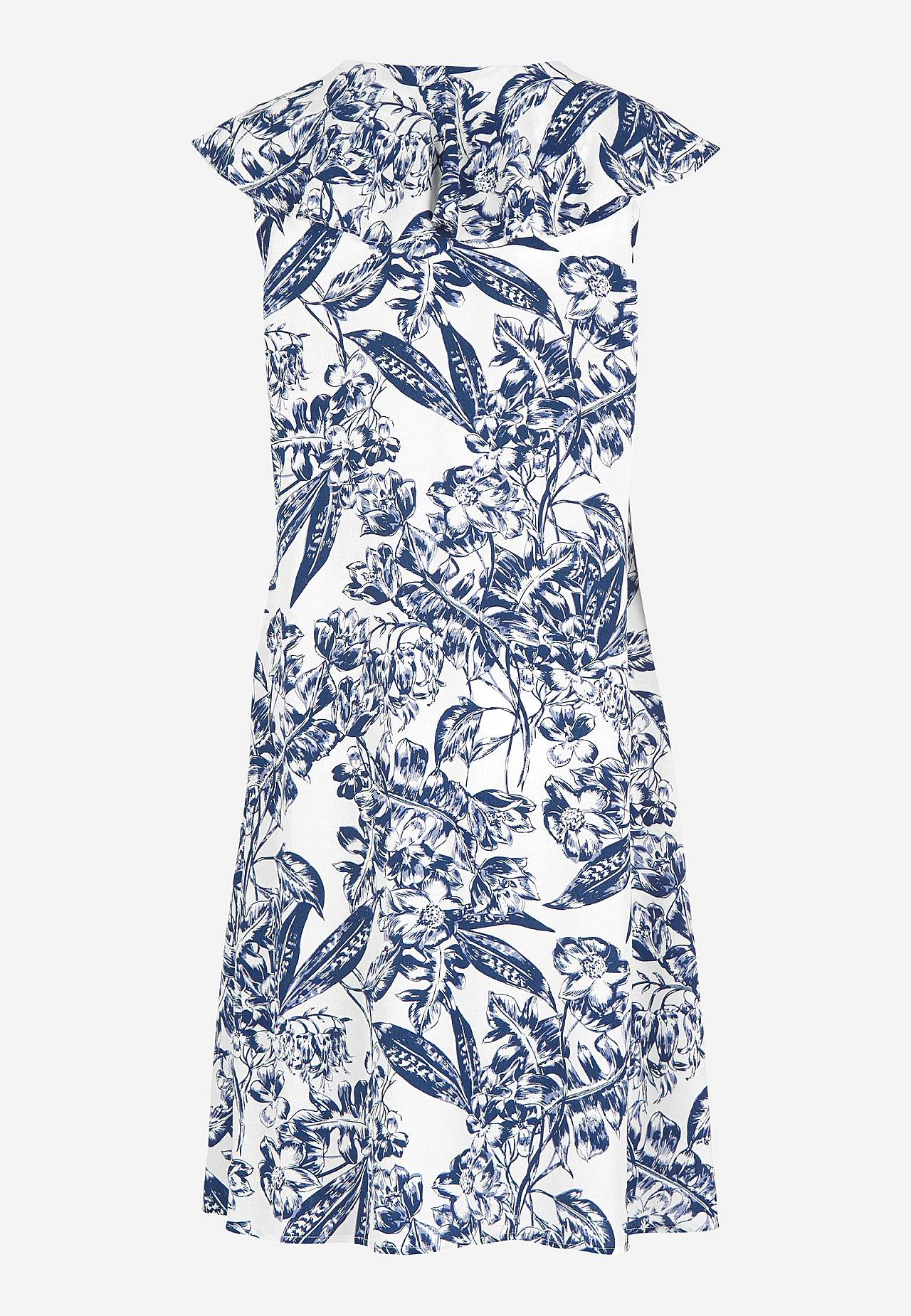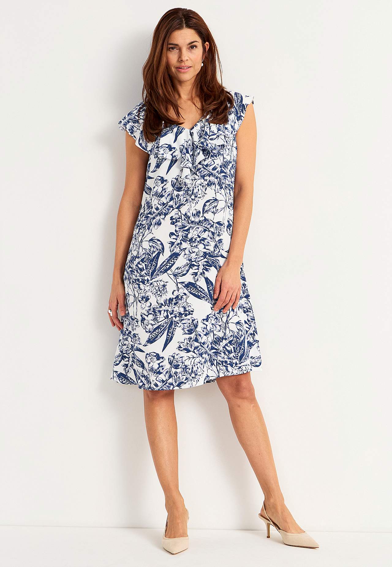 Viskoosimekko sileällä leveydellä muotojen imartelemista varten. V-pääntie leveällä, koristeellisella röyhelöllä kaikkialla. Vetoketju sivusaumassa helppoa pukemista ja riisumista varten. Rintamuotolaskos. Vuoraamaton. Pituus olkapäältä koon mukaan noin 103-114 cm.