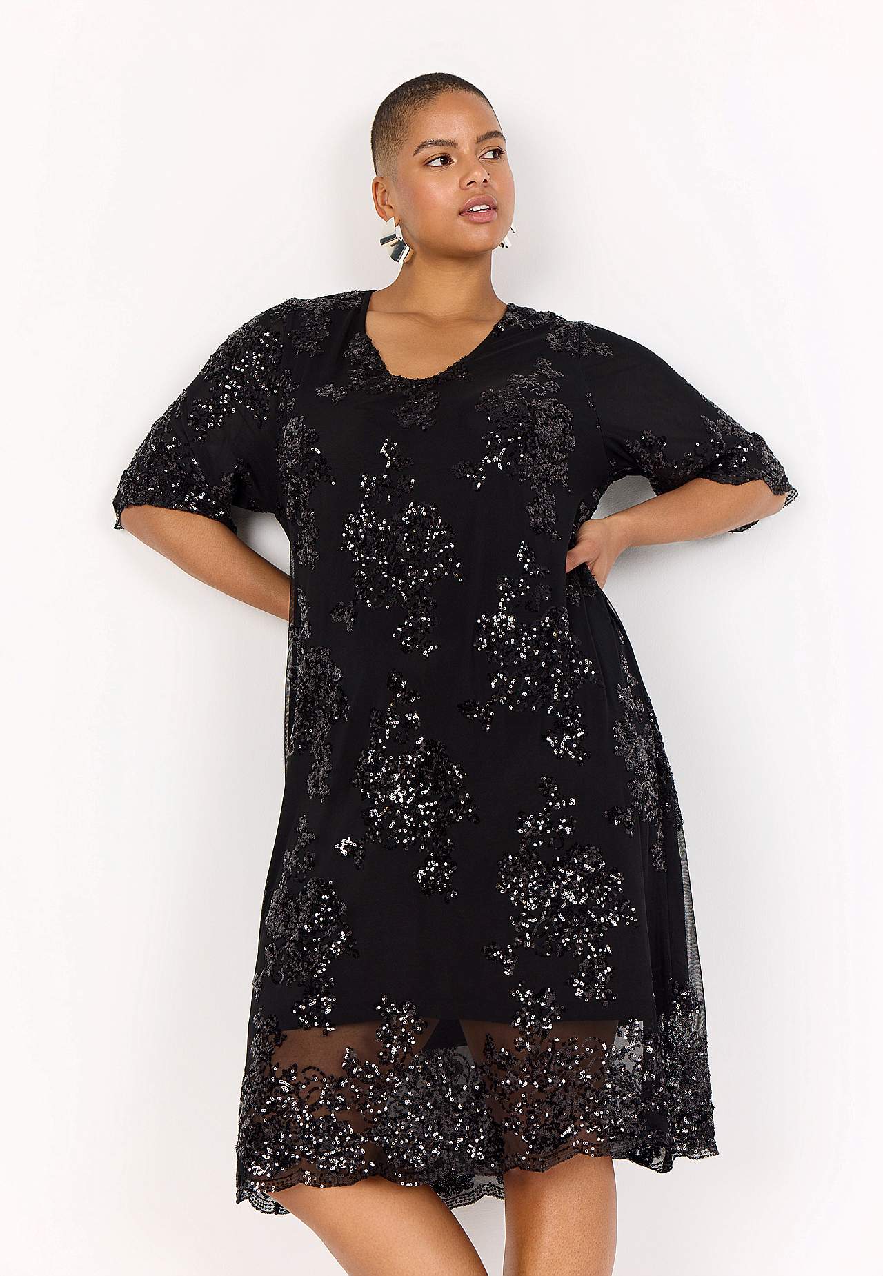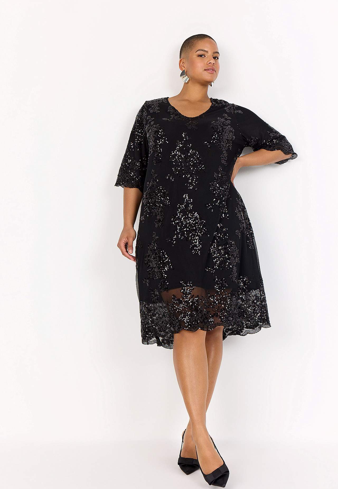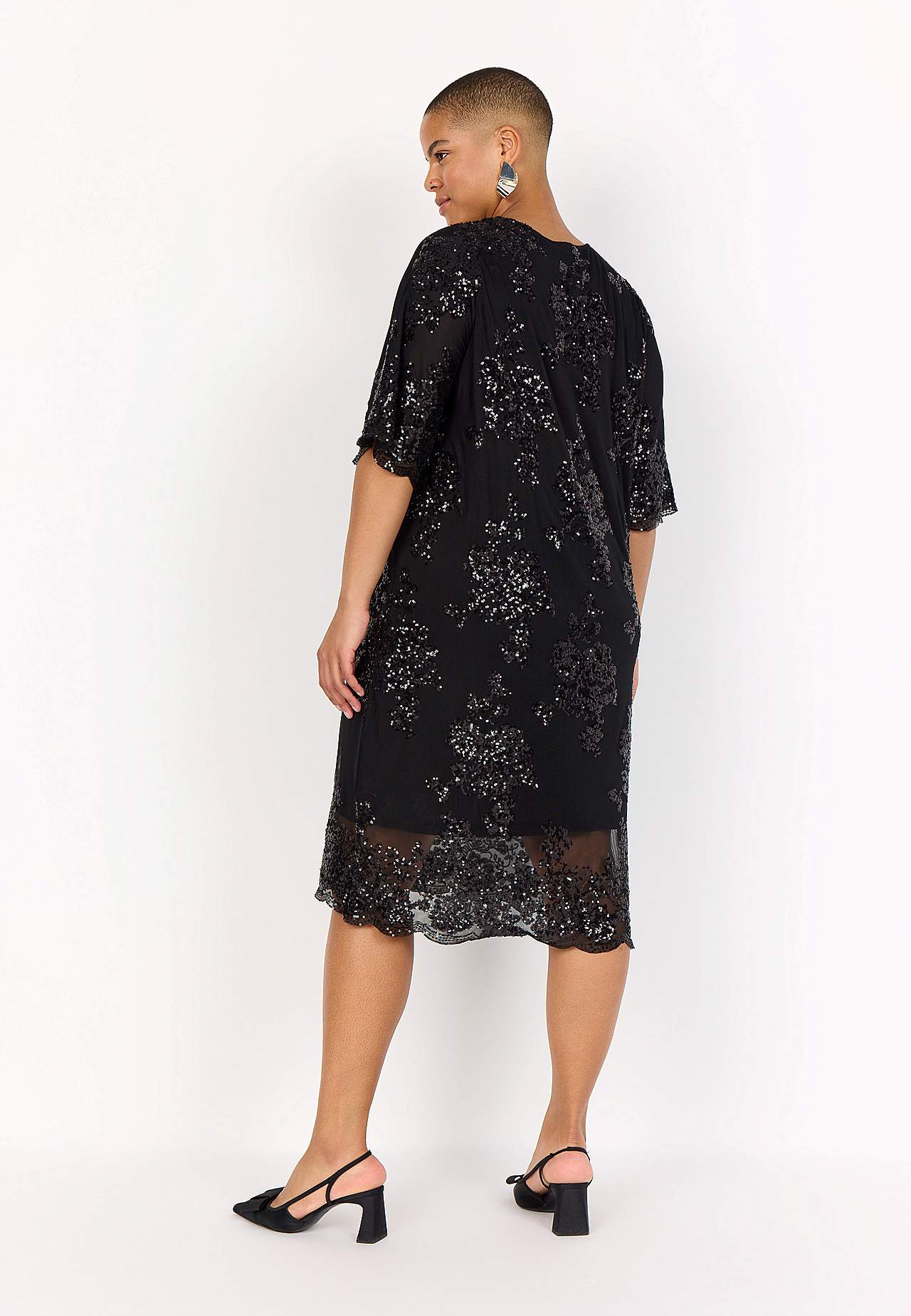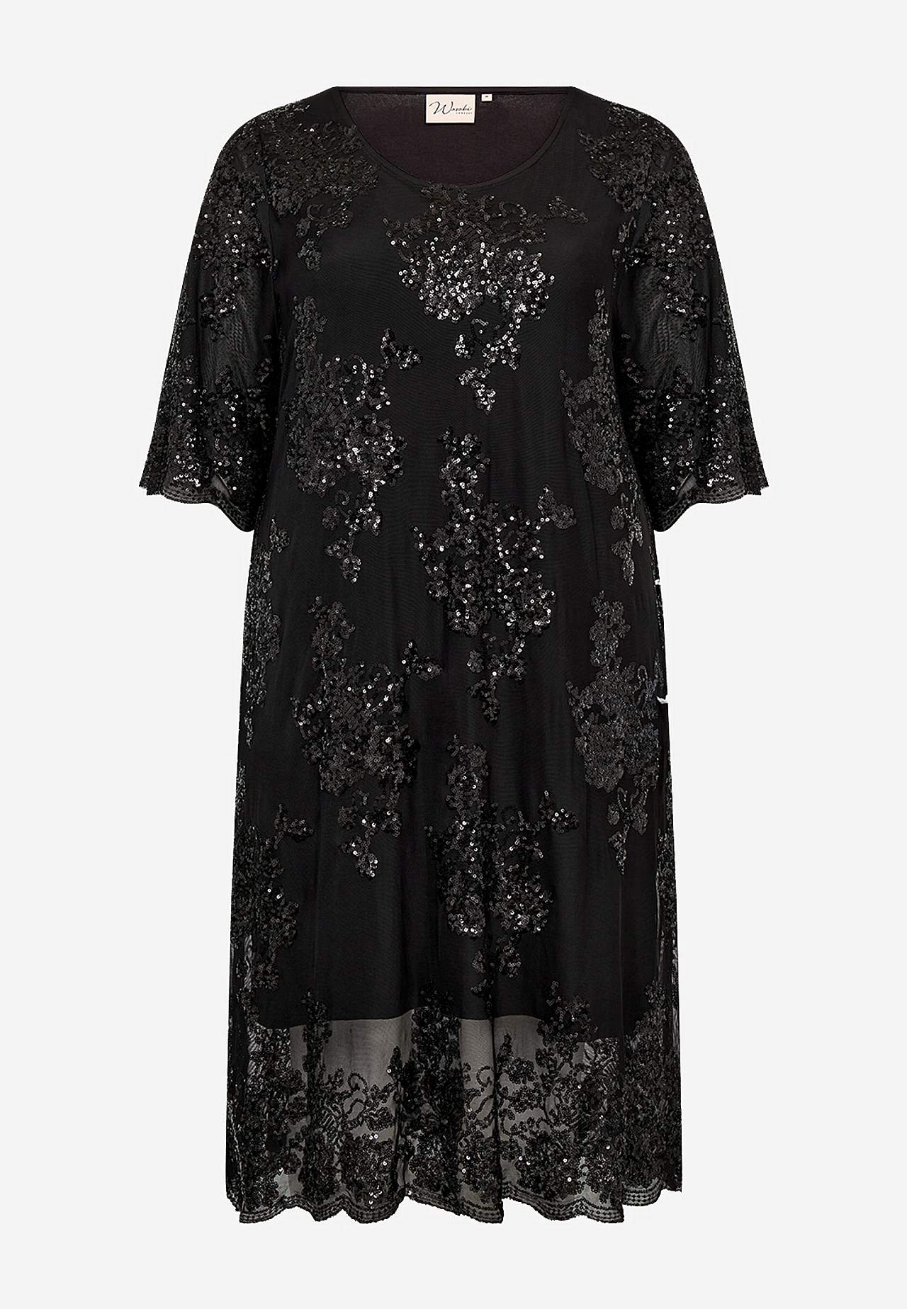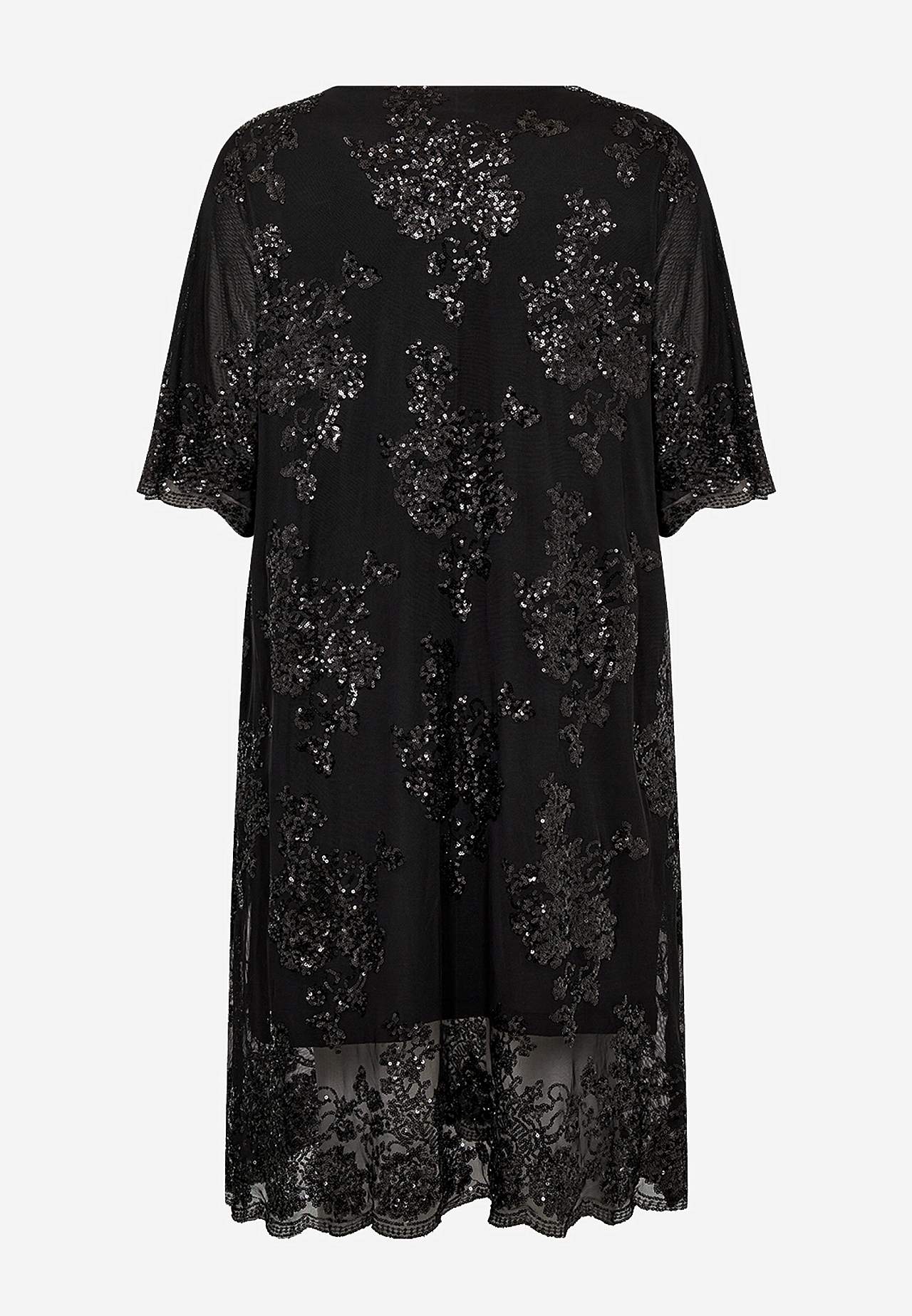 Elegantti mekko paljeteilla ja kirjonnalla. Suora istuvuus. Joustava, pehmeä vuori. Kätketty vetoketju takana. Elegantti helma. Pituus olkapäästä n. 117 cm koossa M (46/48).