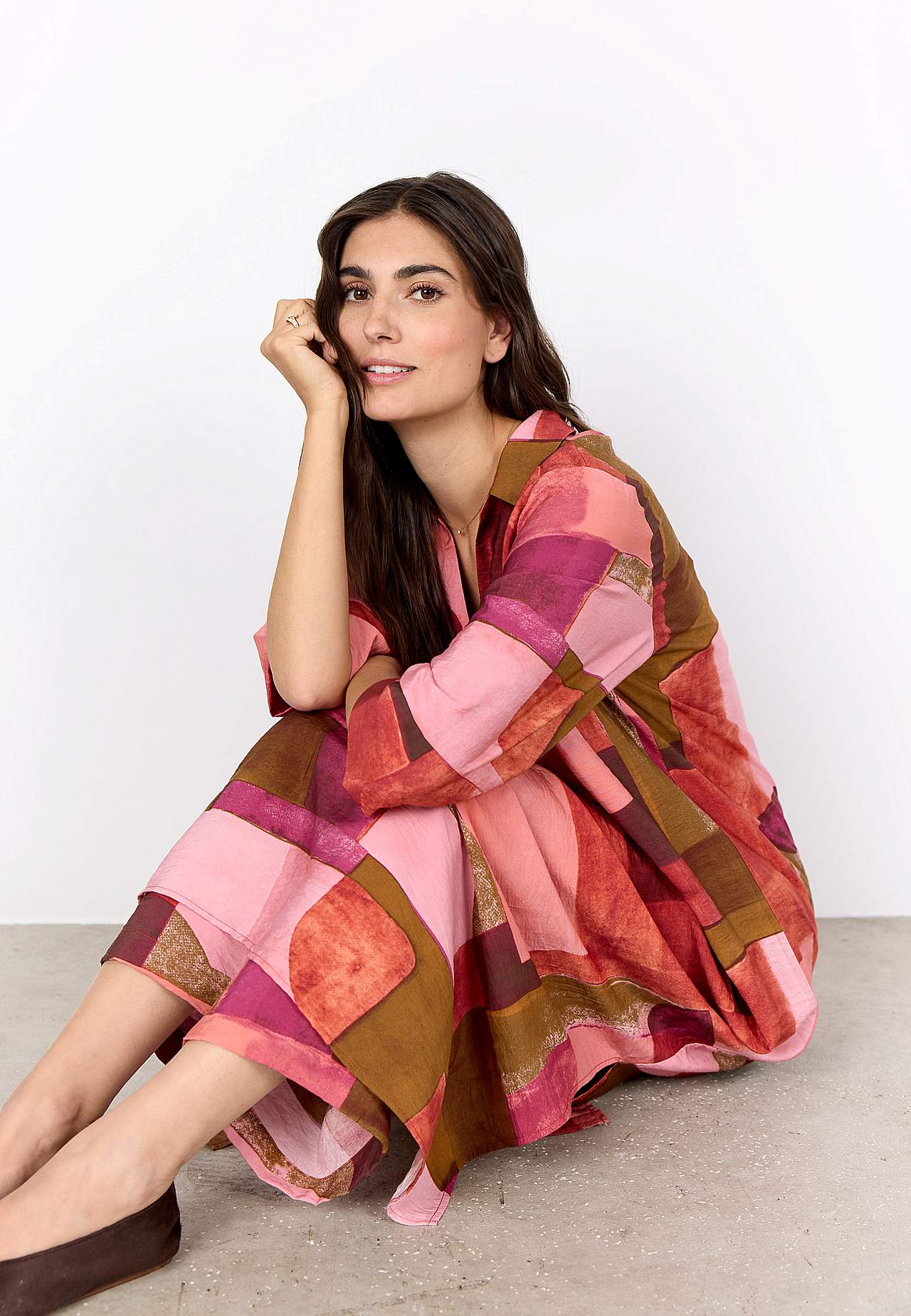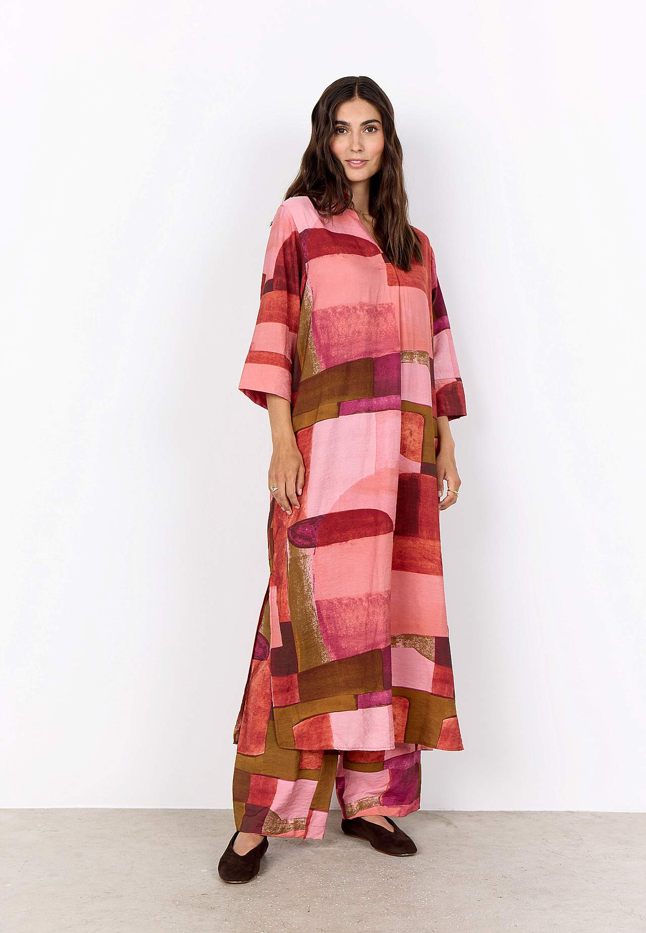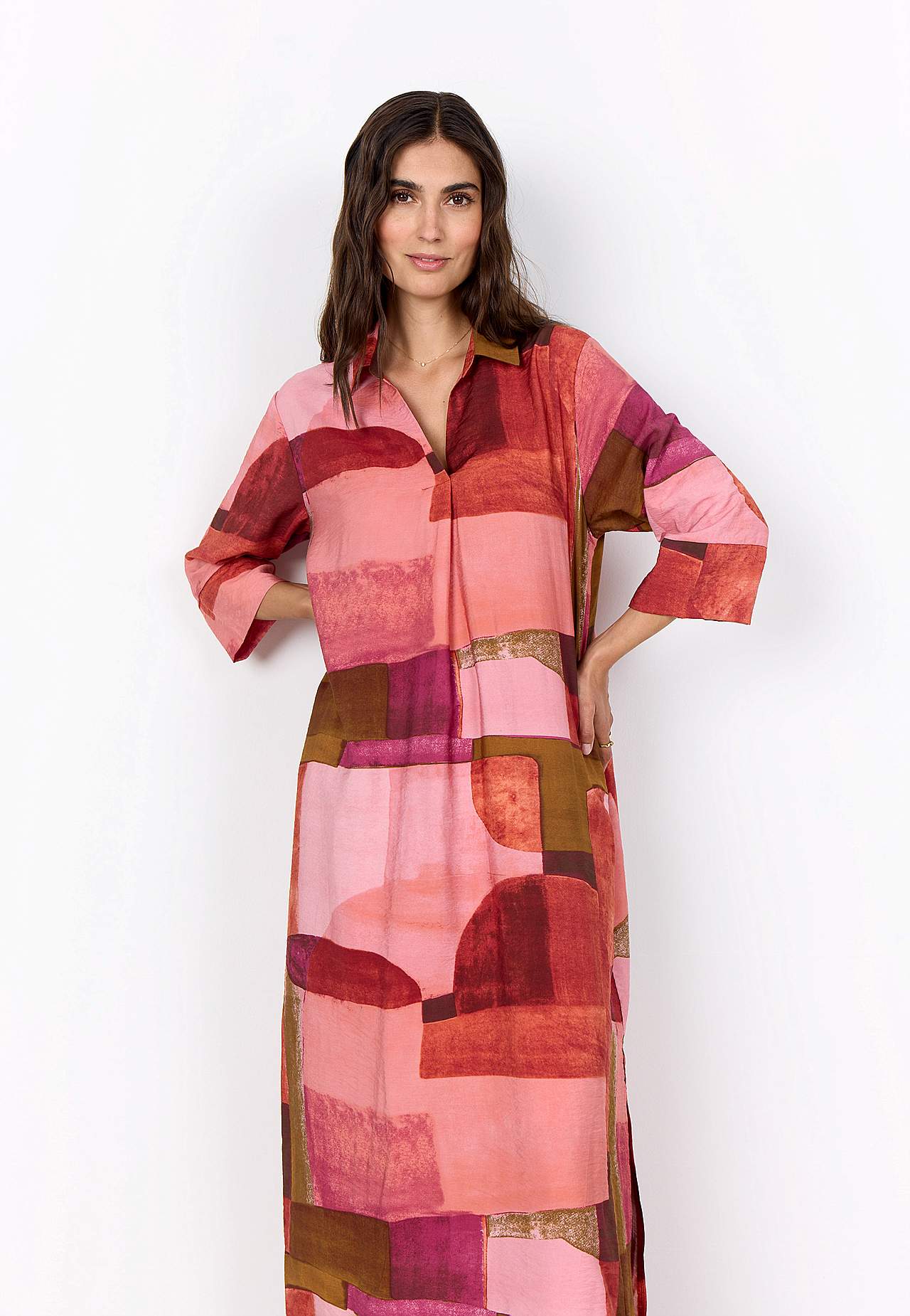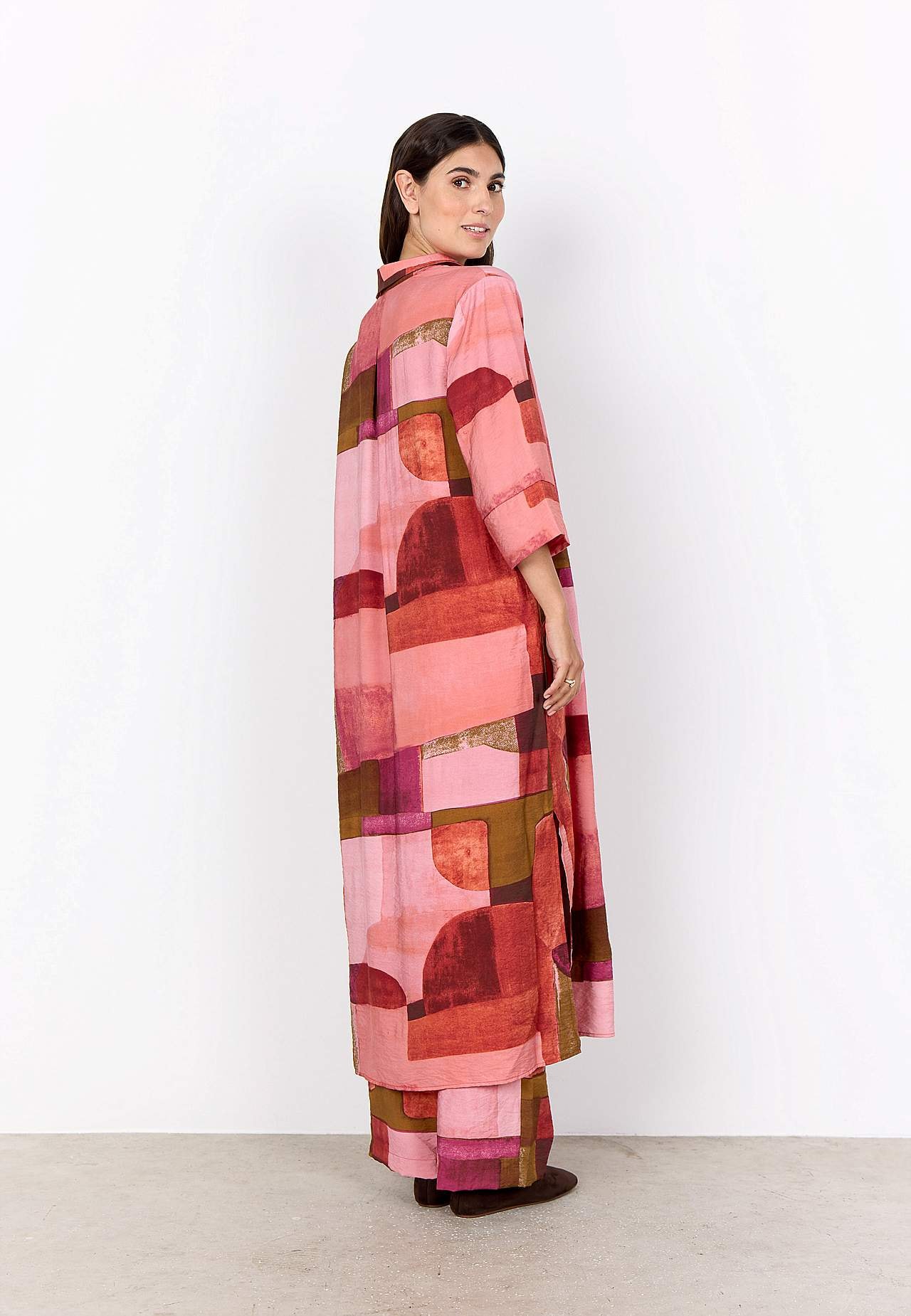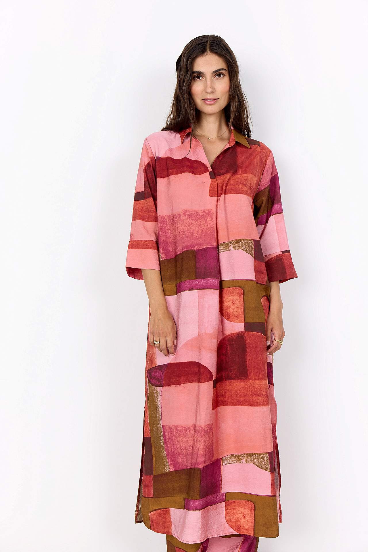 Kaftaanimekko geometrisellä kuvioinnilla. Kudottu, kevyesti rypistetty, viileä viskoosi. Rento istuvuus. Klassinen kaulus. Päällekkäinen V-aukko. Tyylikkäät laskosdetaljit sekä edessä ja takana. 3/4-pituiset, leveät hihat kalvosimella hihansuissa. Suora helma korkealla halkiolla sivuilla. Pituus olkapäältä koon mukaan noin ... Lue lisää