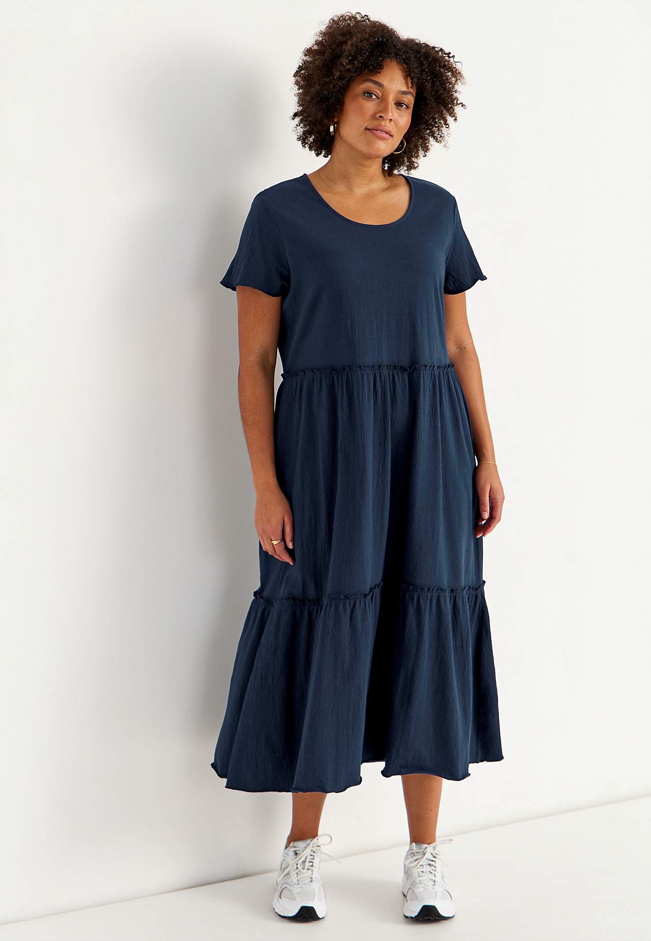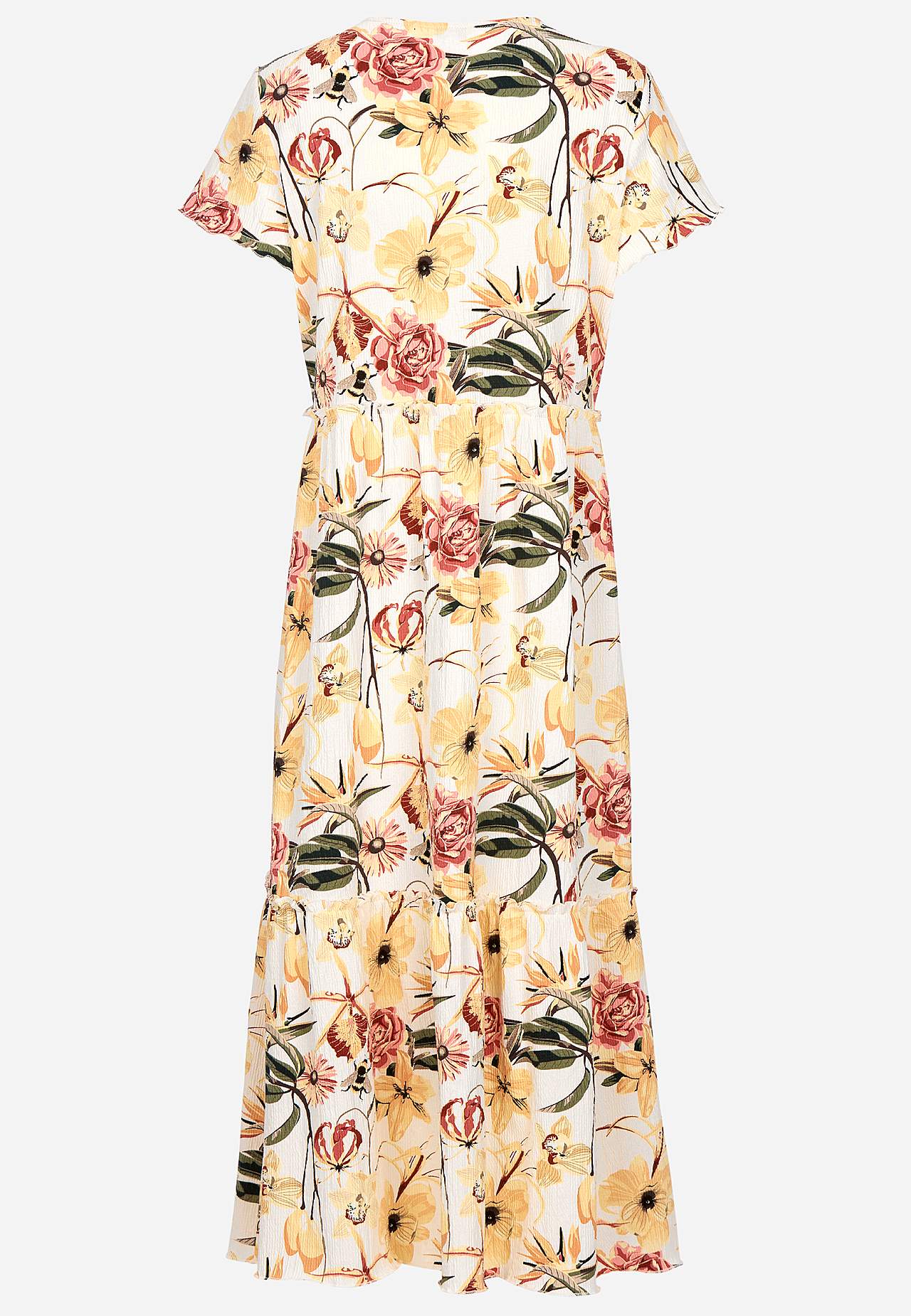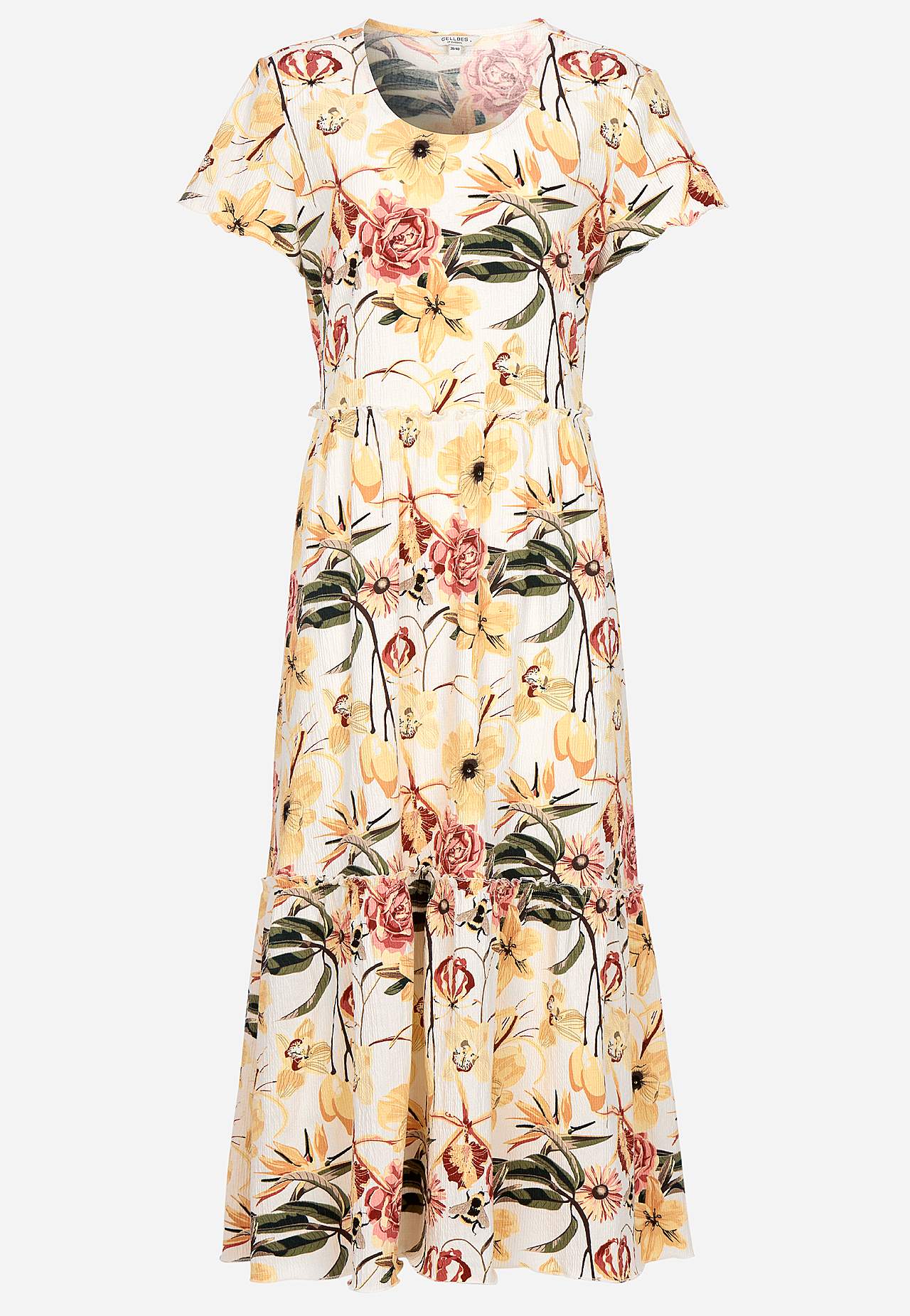 Joustava, pehmeä röyhelömekko aaltoilevalla sommitelmalla. Rento, A-linjainen istuvuus. Hameosa ihanalla leveydellä. Saumurilla huoliteltu, aaltoileva, ohut sauma alhaalla, röyhelön reunalla ja hihansuissa. Pyöristetty pääntie. Lyhyet holkkihihat. Lievästi pyöristetty helma. Takapituus on kaikissa koissa n. 128 cm.