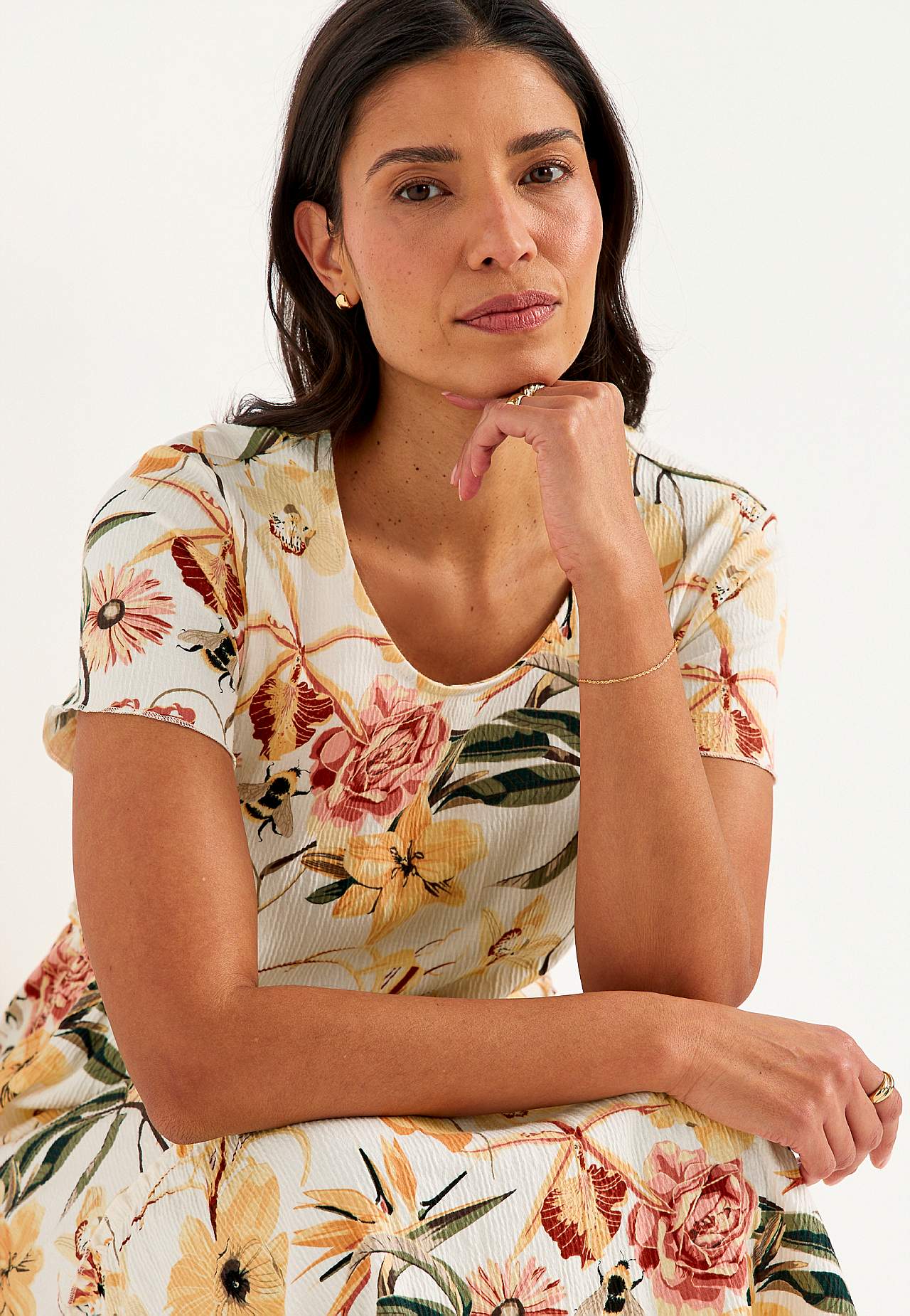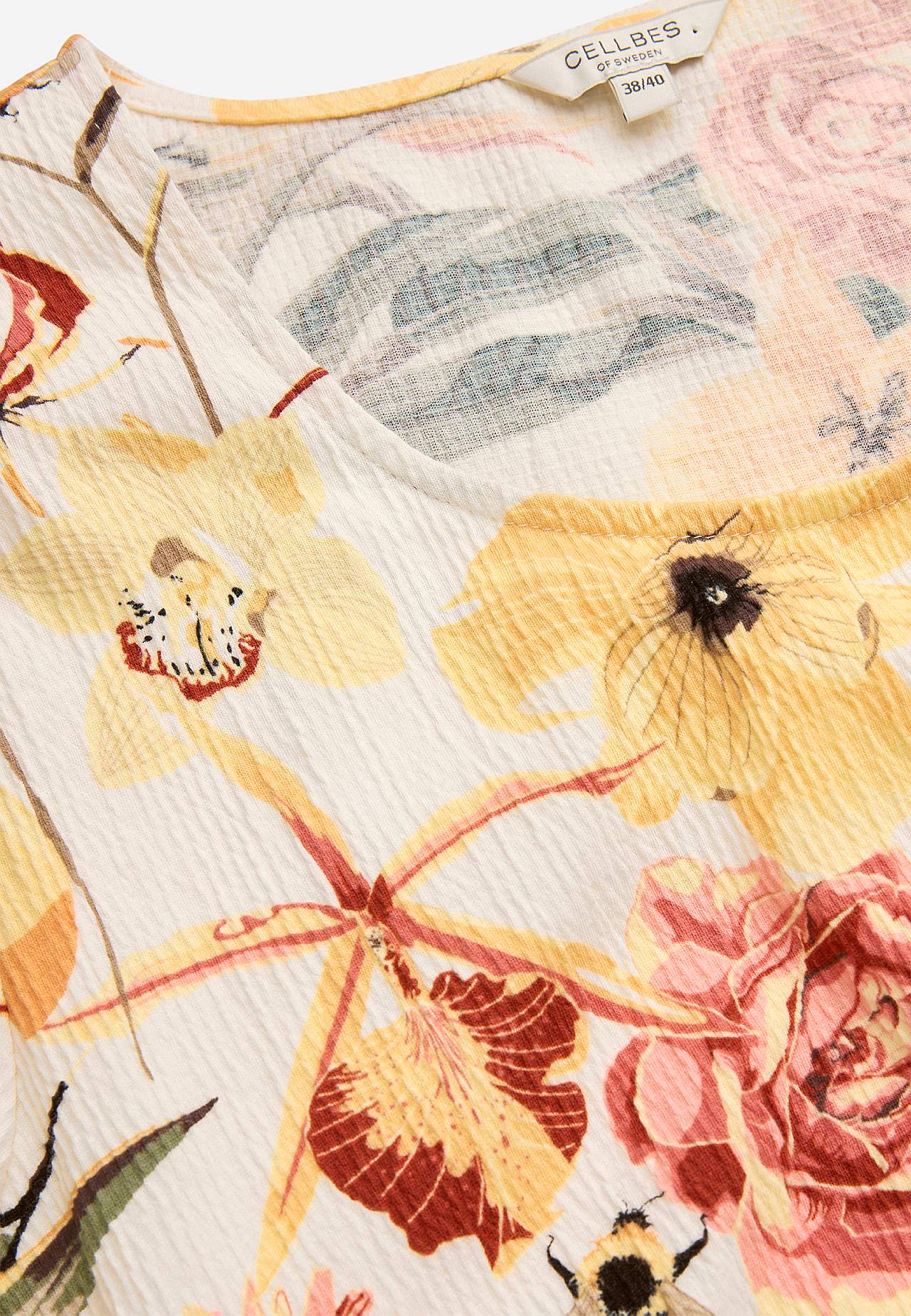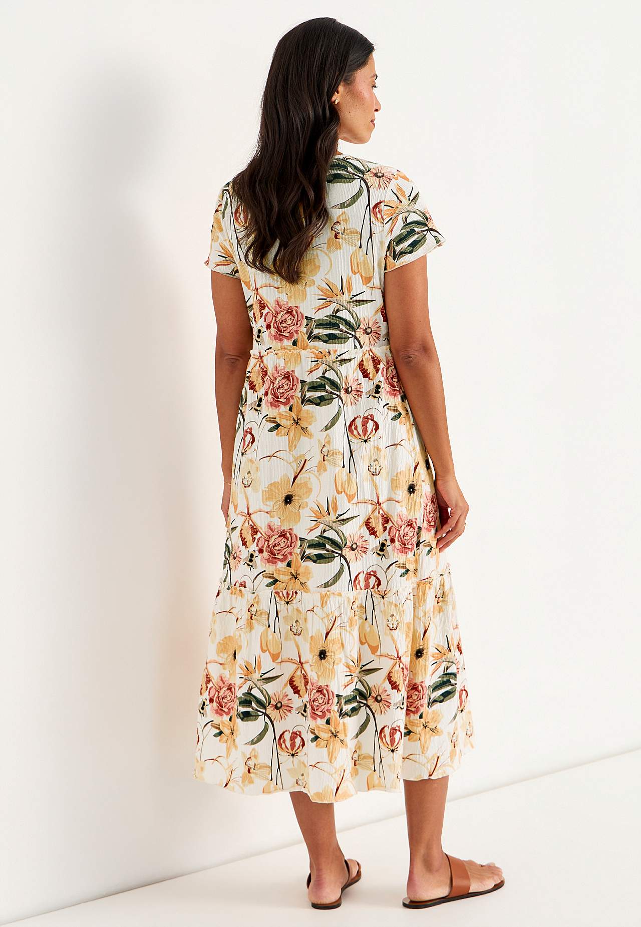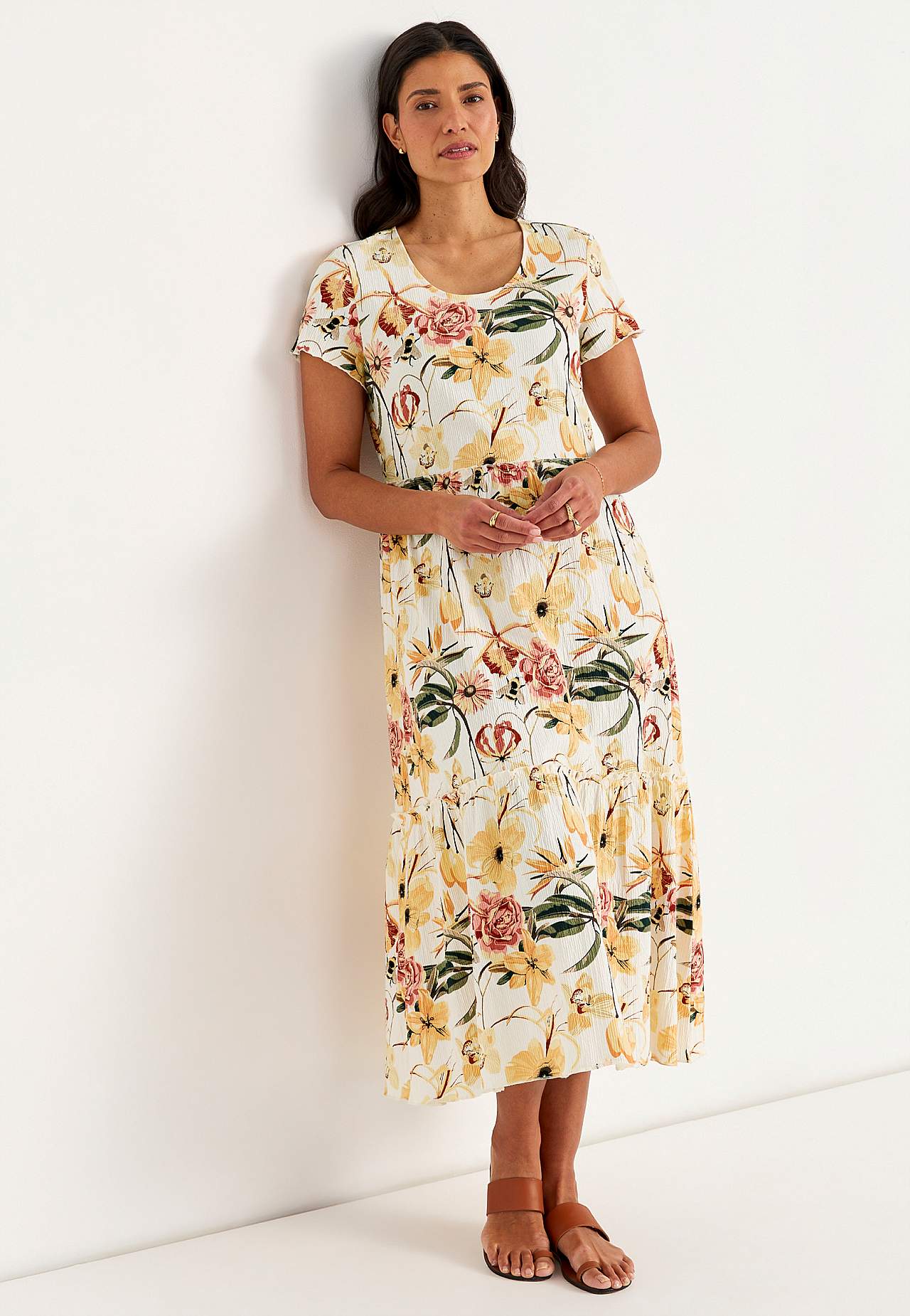 Joustava, pehmeä röyhelömekko aaltoilevalla sommitelmalla. Rento, A-linjainen istuvuus. Hameosa ihanalla leveydellä. Saumurilla huoliteltu, aaltoileva, ohut sauma alhaalla, röyhelön reunalla ja hihansuissa. Pyöristetty pääntie. Lyhyet holkkihihat. Lievästi pyöristetty helma. Takapituus on kaikissa koissa n. 128 cm.