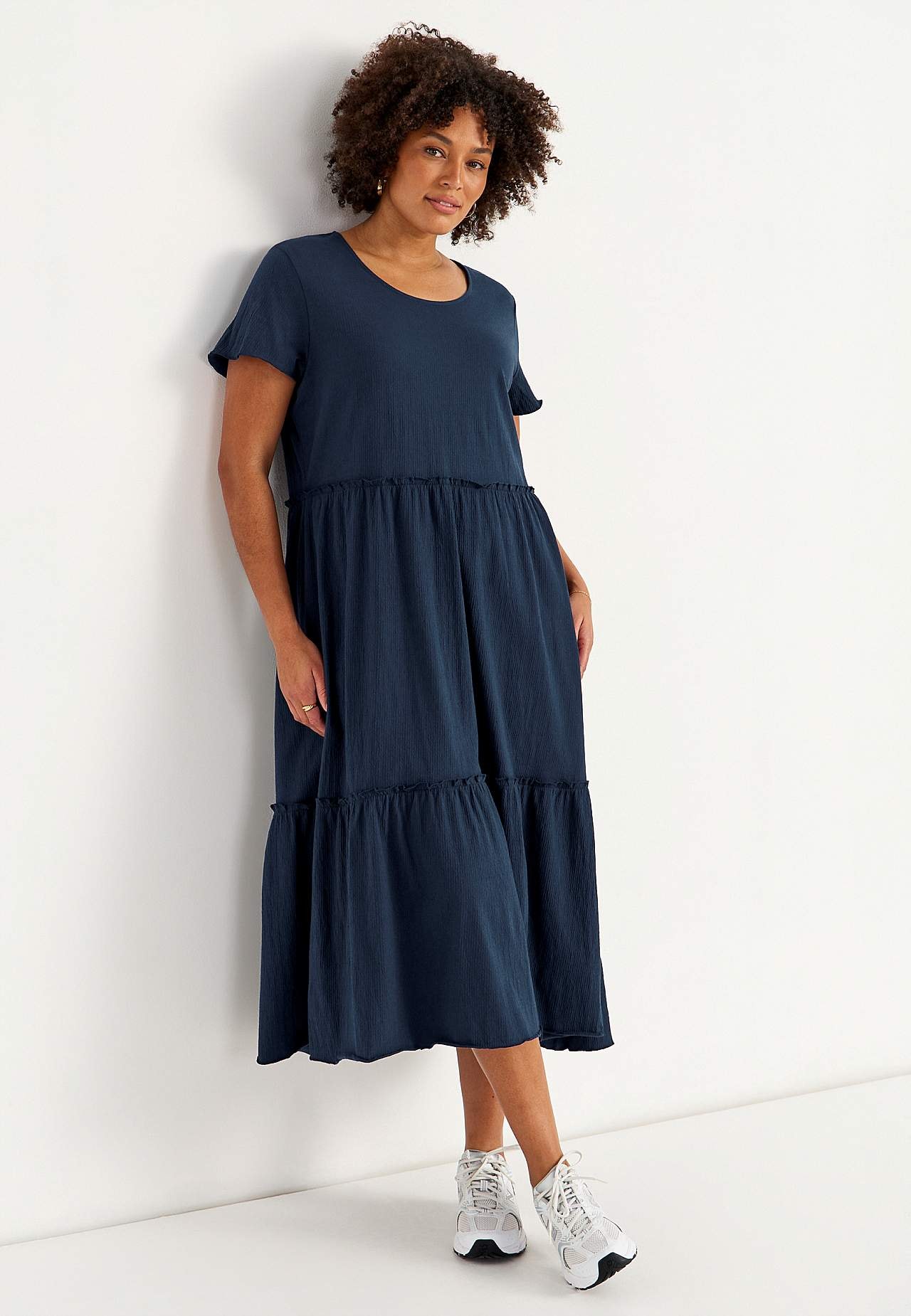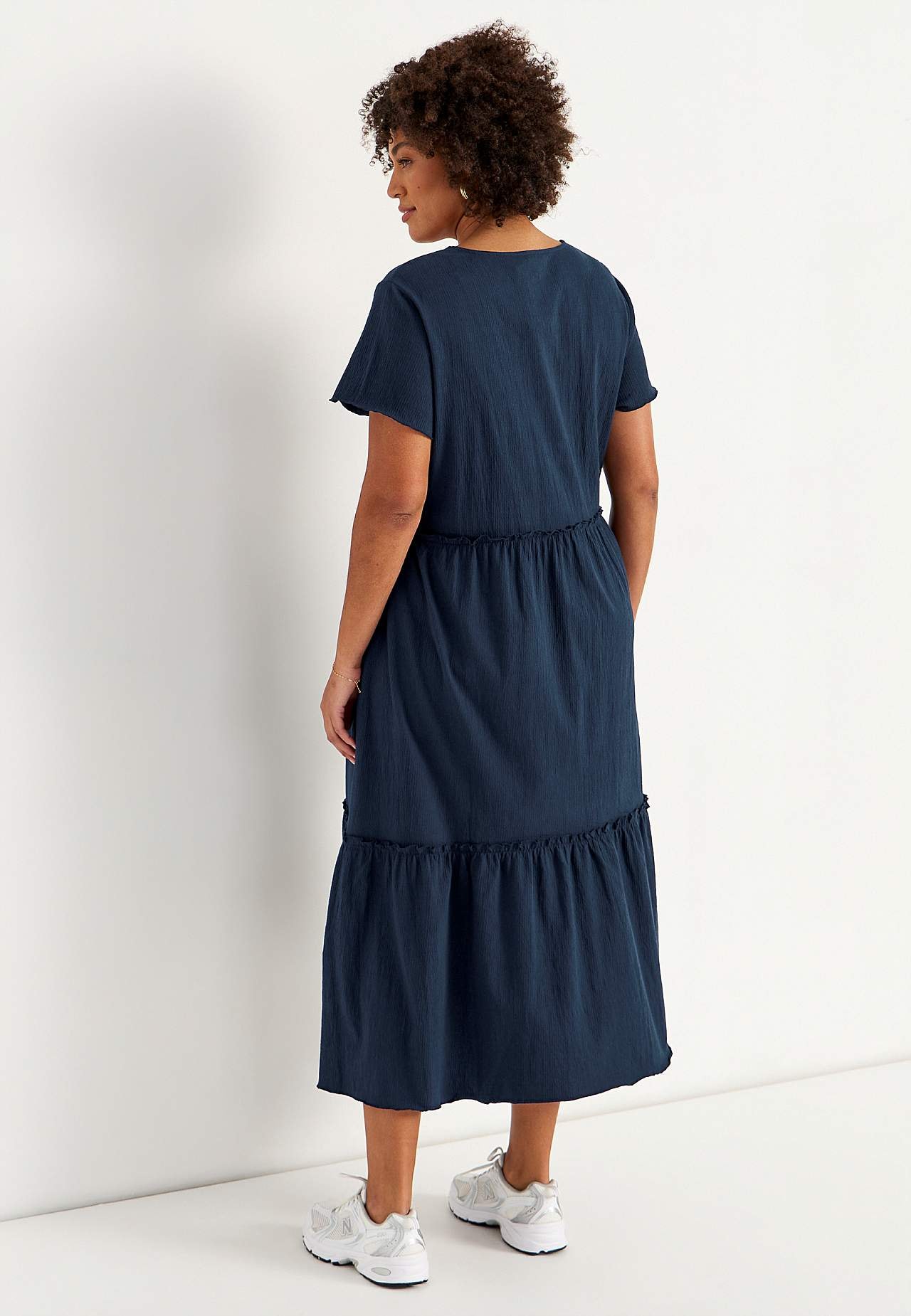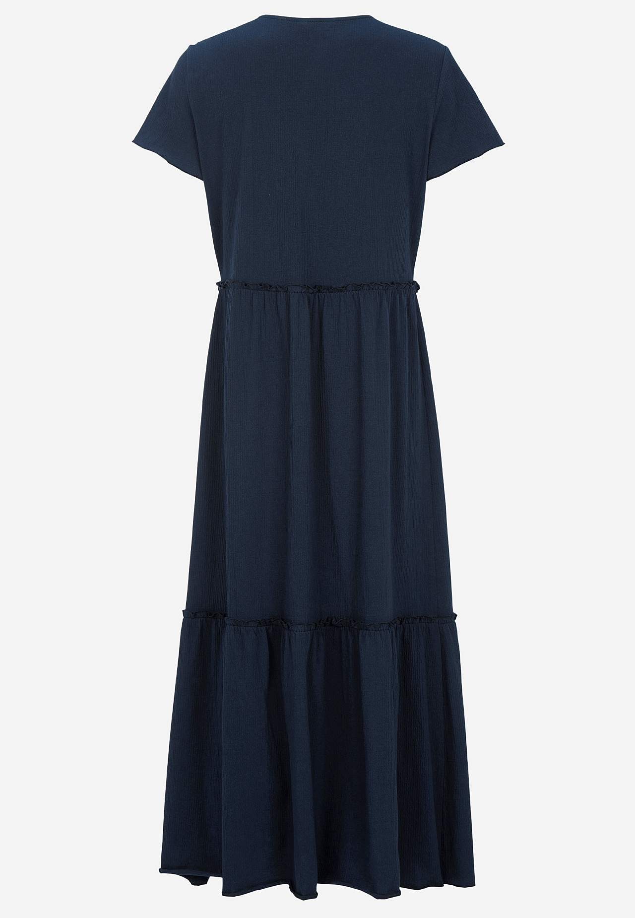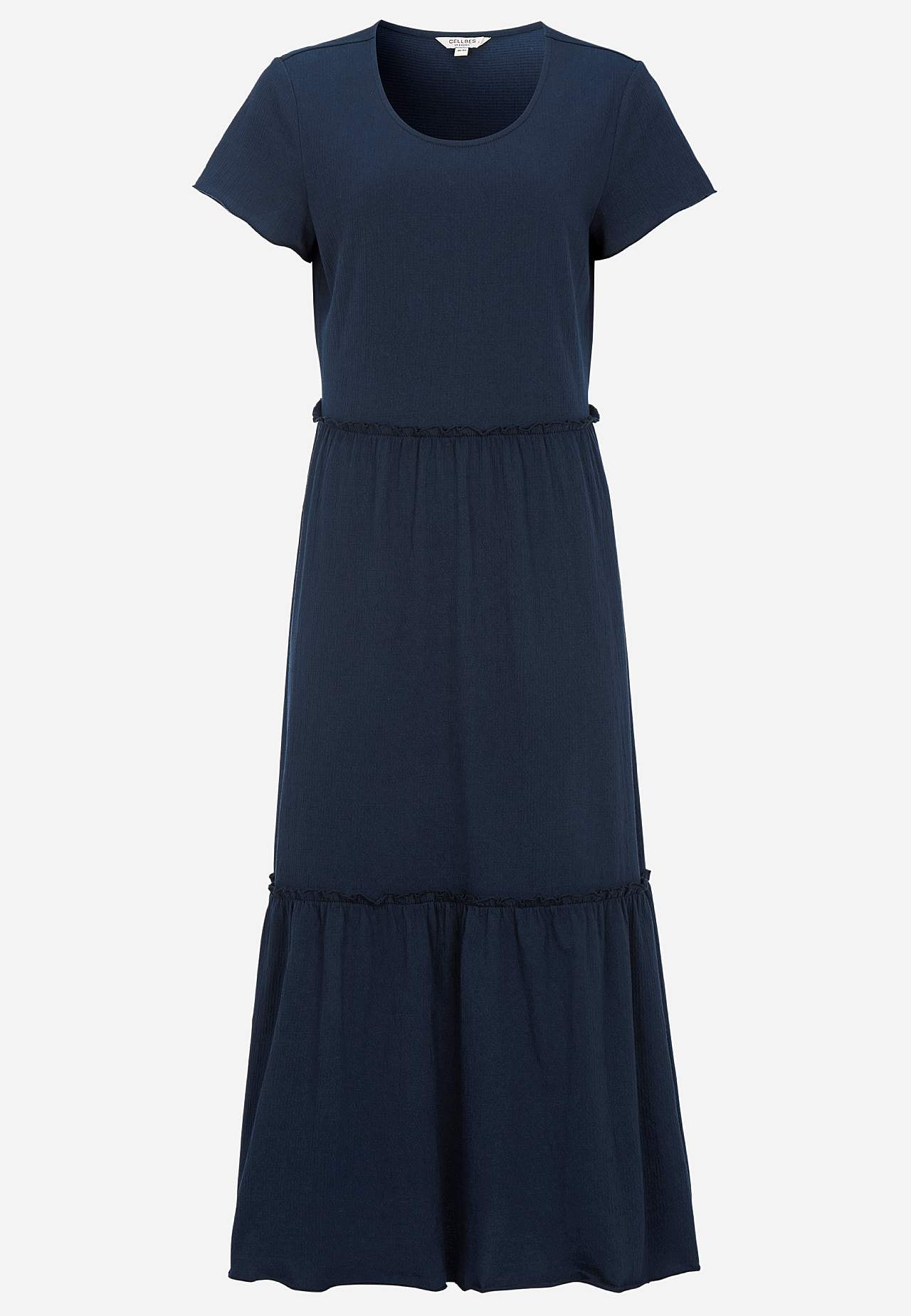 Joustava, pehmeä röyhelömekko aaltoilevalla sommitelmalla. Rento, A-linjainen istuvuus. Hameosa ihanalla leveydellä. Saumurilla huoliteltu, aaltoileva, ohut sauma alhaalla, röyhelön reunalla ja hihansuissa. Pyöristetty pääntie. Lyhyet holkkihihat. Lievästi pyöristetty helma. Takapituus on kaikissa koissa n. 128 cm.