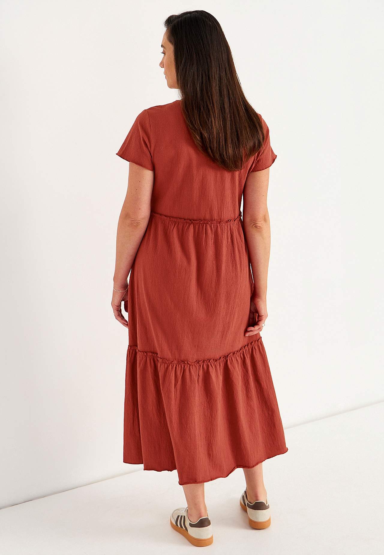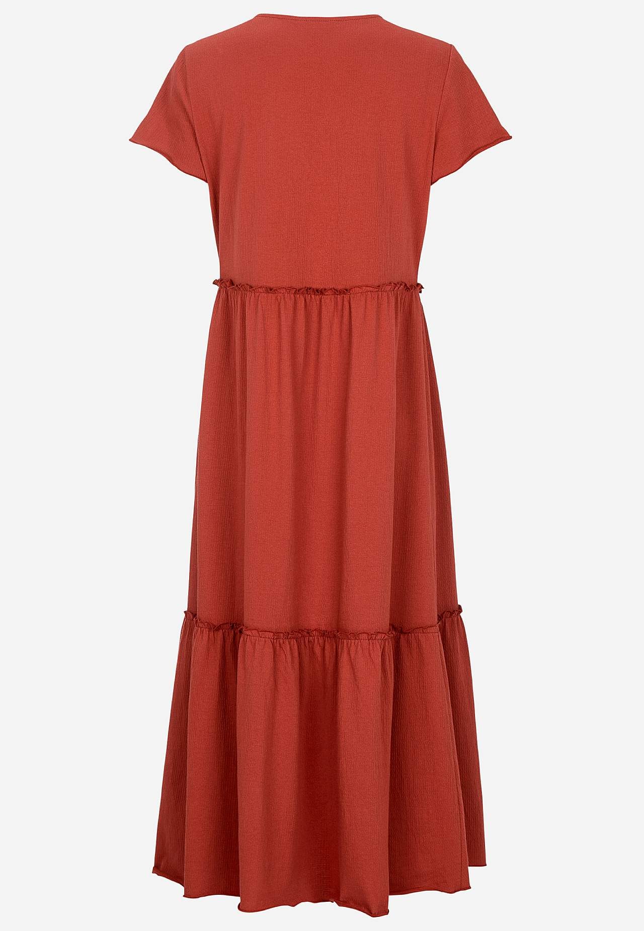 Joustava, pehmeä röyhelömekko aaltoilevalla sommitelmalla. Rento, A-linjainen istuvuus. Hameosa ihanalla leveydellä. Saumurilla huoliteltu, aaltoileva, ohut sauma alhaalla, röyhelön reunalla ja hihansuissa. Pyöristetty pääntie. Lyhyet holkkihihat. Lievästi pyöristetty helma. Takapituus on kaikissa koissa n. 128 cm.