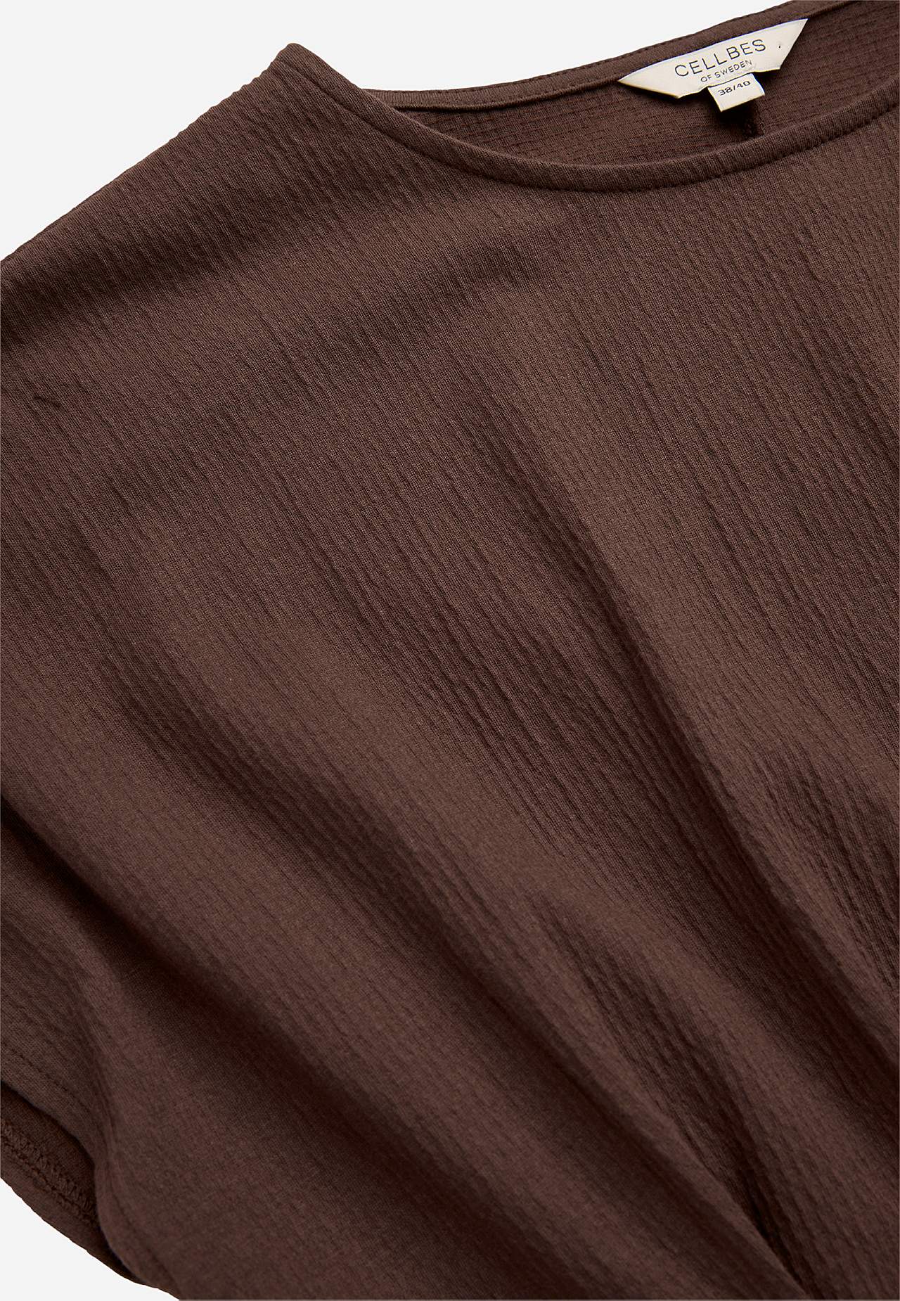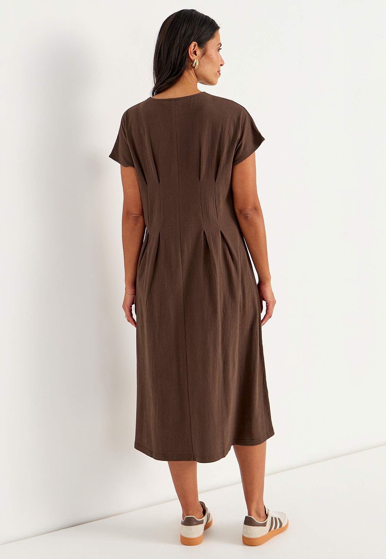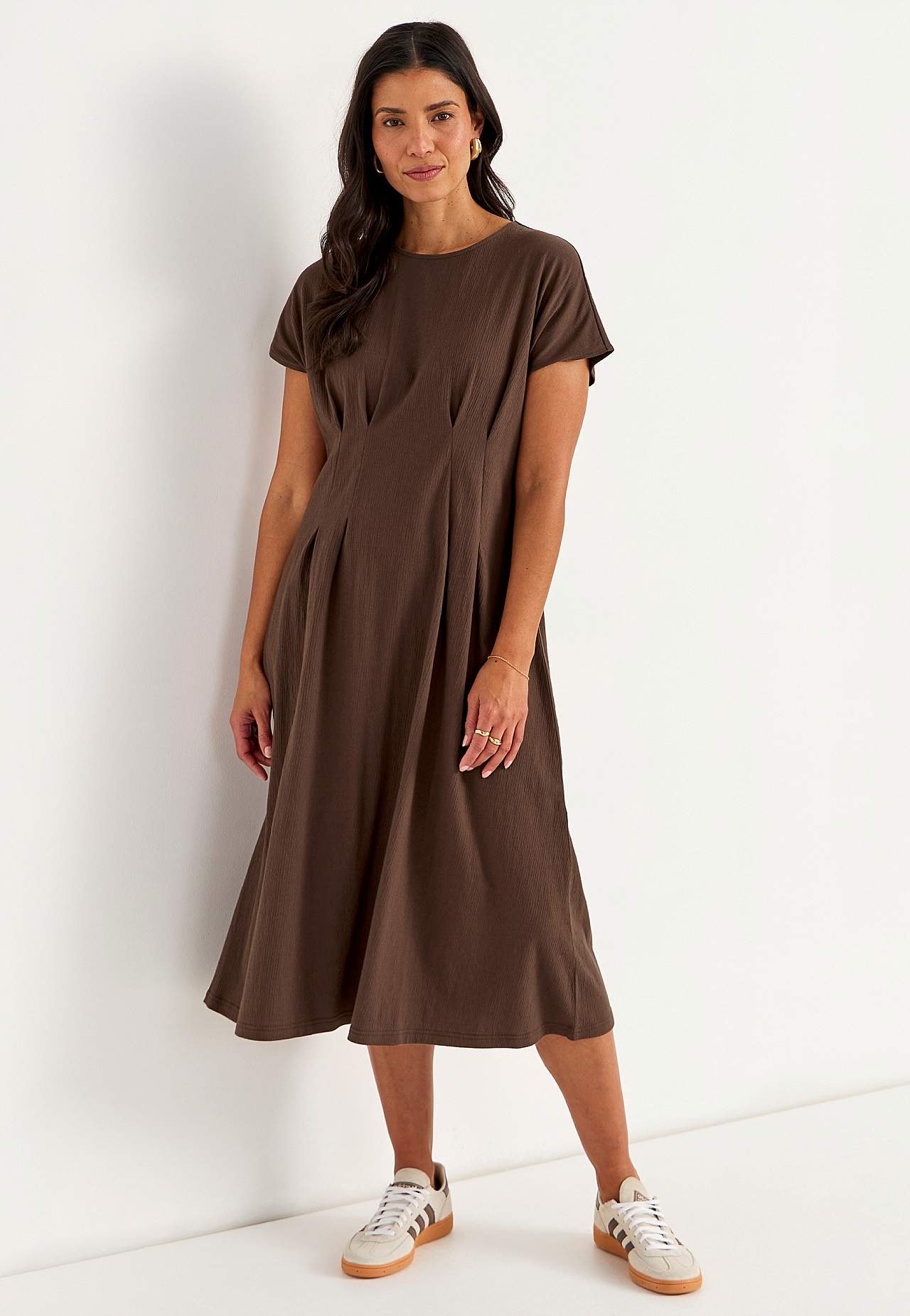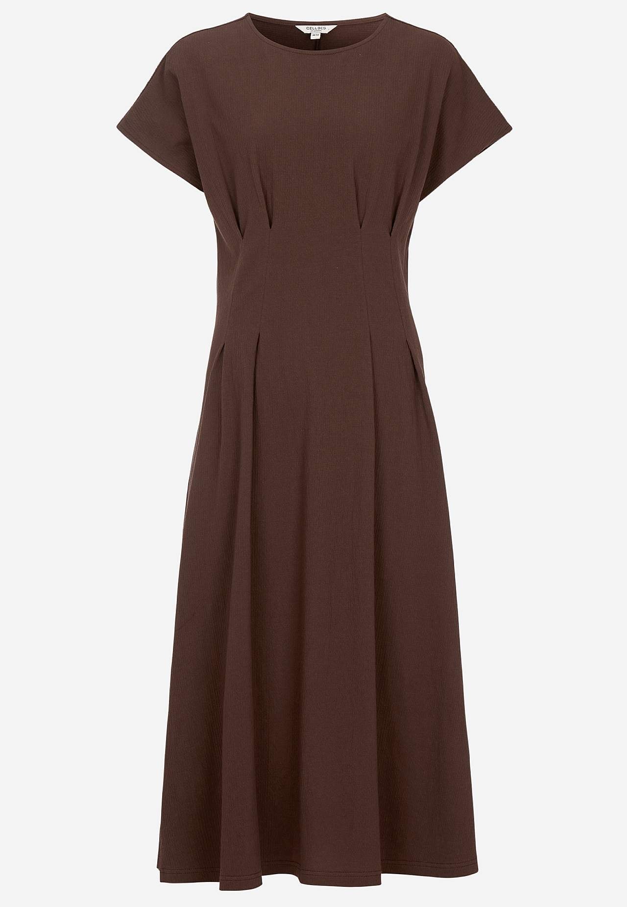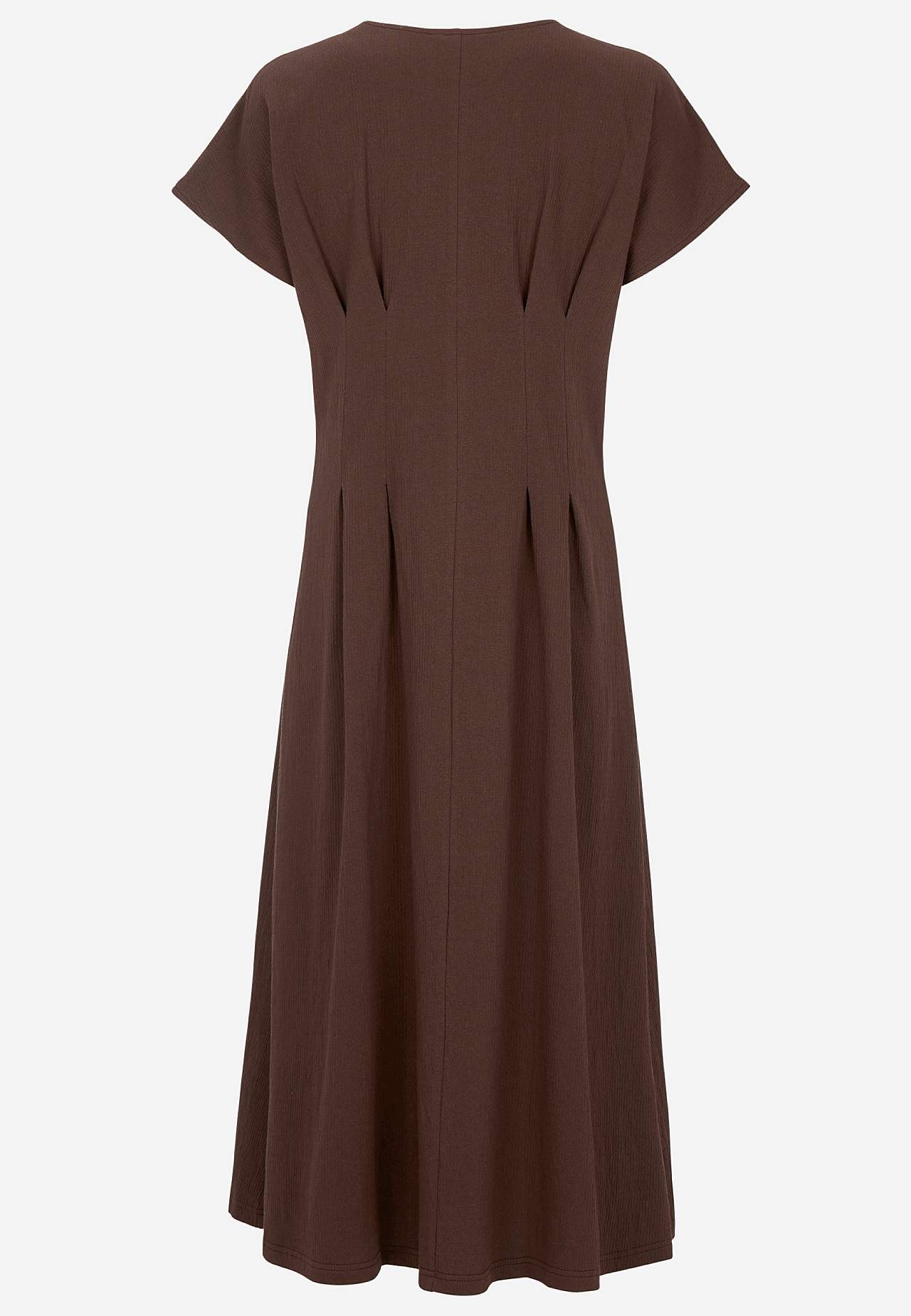 Naisellinen trikoomekko aaltoilevalla sommitelmalla. Pehmeä, joustava materiaali. Normaali istuvuus levenevällä hameosalla. Korostettu vyötärö vartaloa imartelevalla laskoksella sekä edessä ja takana. Pyöristetty pääntie. Lyhyet holkkihihat. Lievästi pyöristetty helma. Takapituus koon mukaan n. 122 cm.