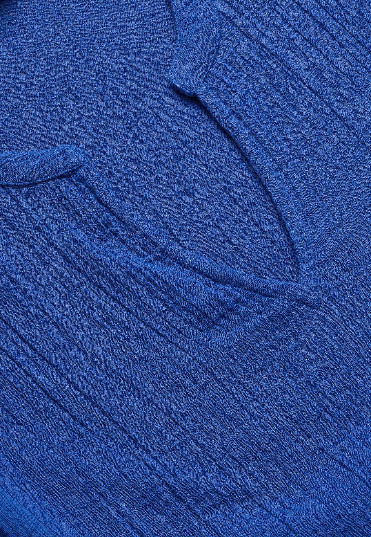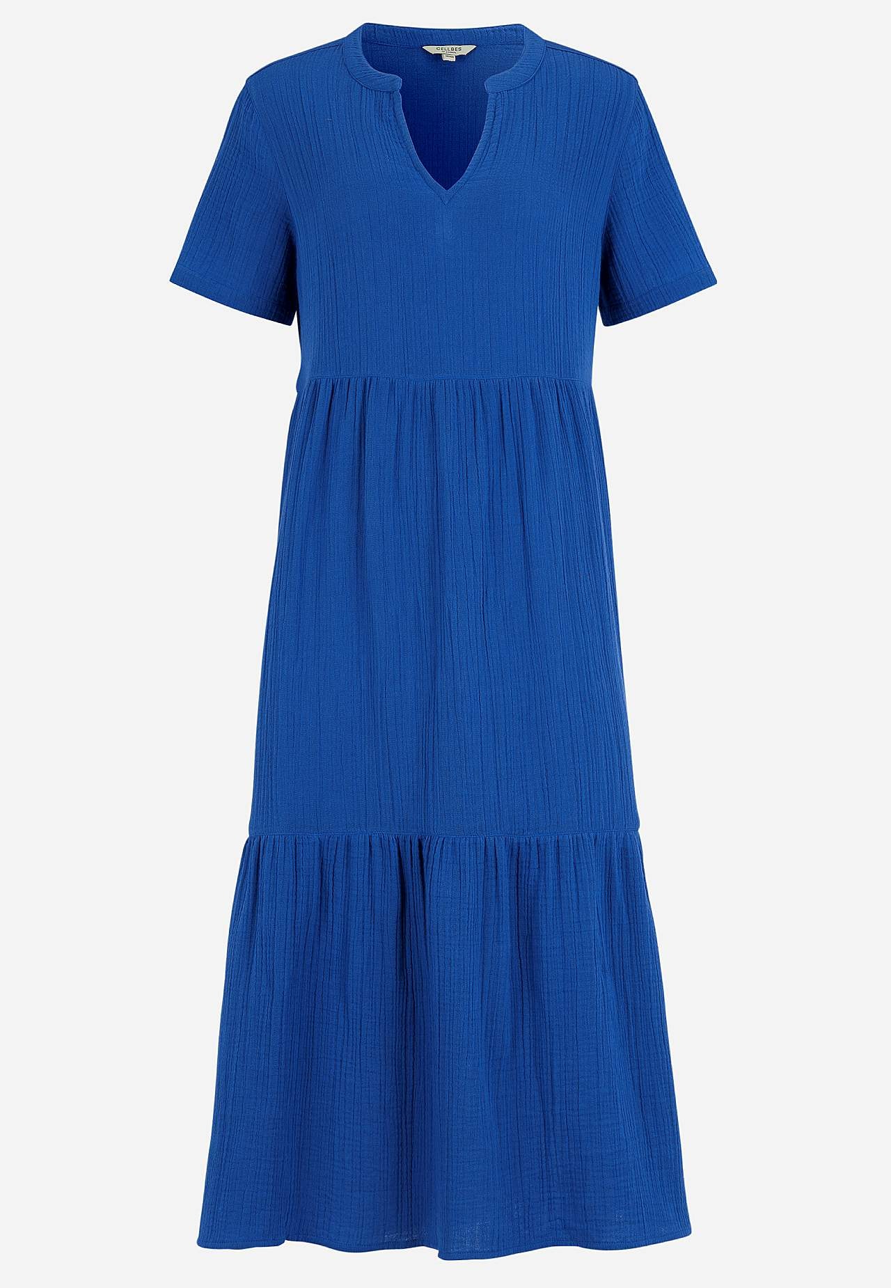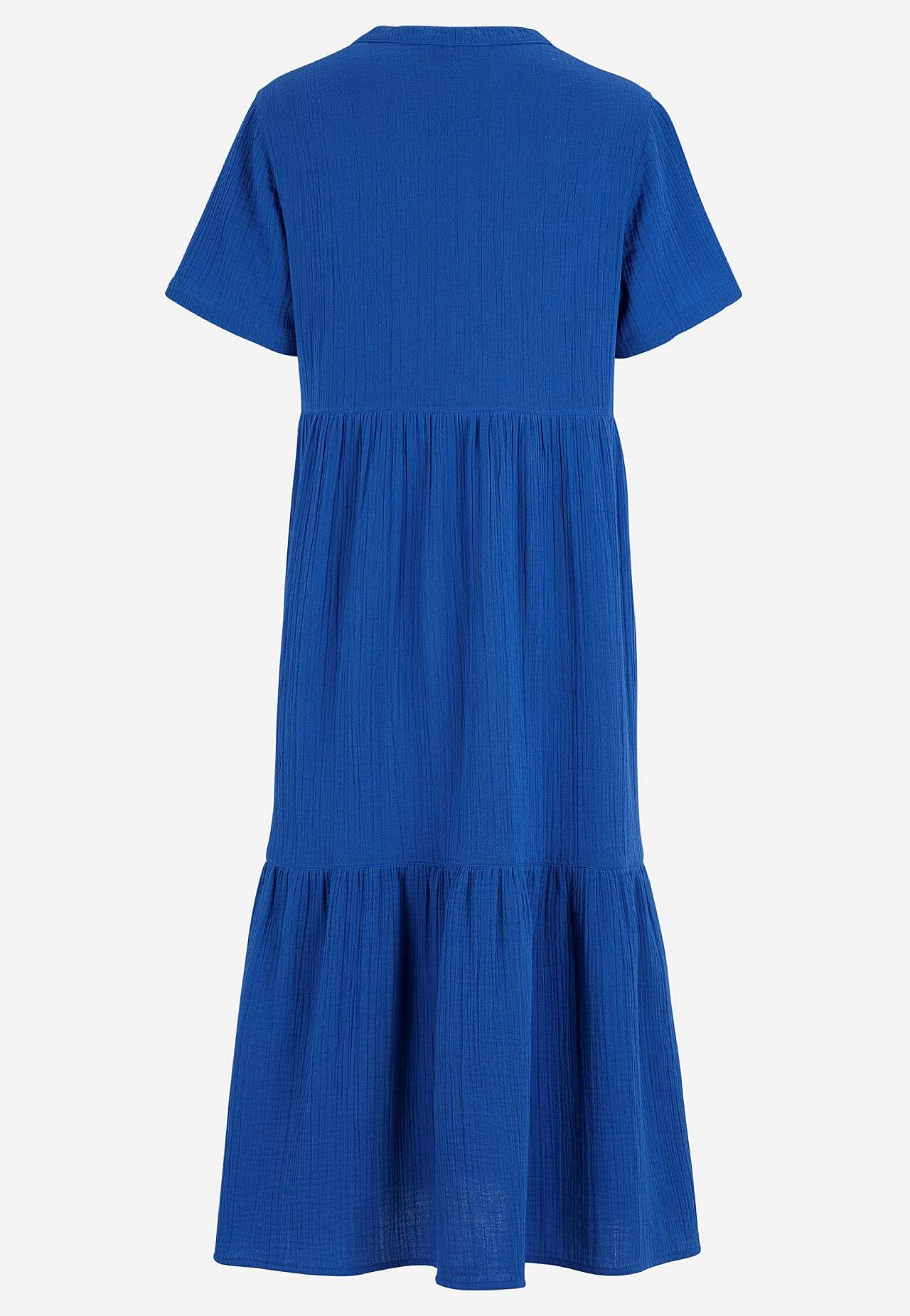 Röyhelömekko ihanasta puuvillamusliinista luonnollisella sommitelmalla. Kudottu, pehmeä materiaali ilmavalla, viileällä tuntumalla. Tilava istuvuus leveydellä alhaalla. Pyöreä pääntie pienellä v-kaula-aukolla. Lyhyet hihat. Sauma vyötäröllä. Röyhelö alhaalla. Suora helma. Takapituus koon mukaan n. 125 cm.