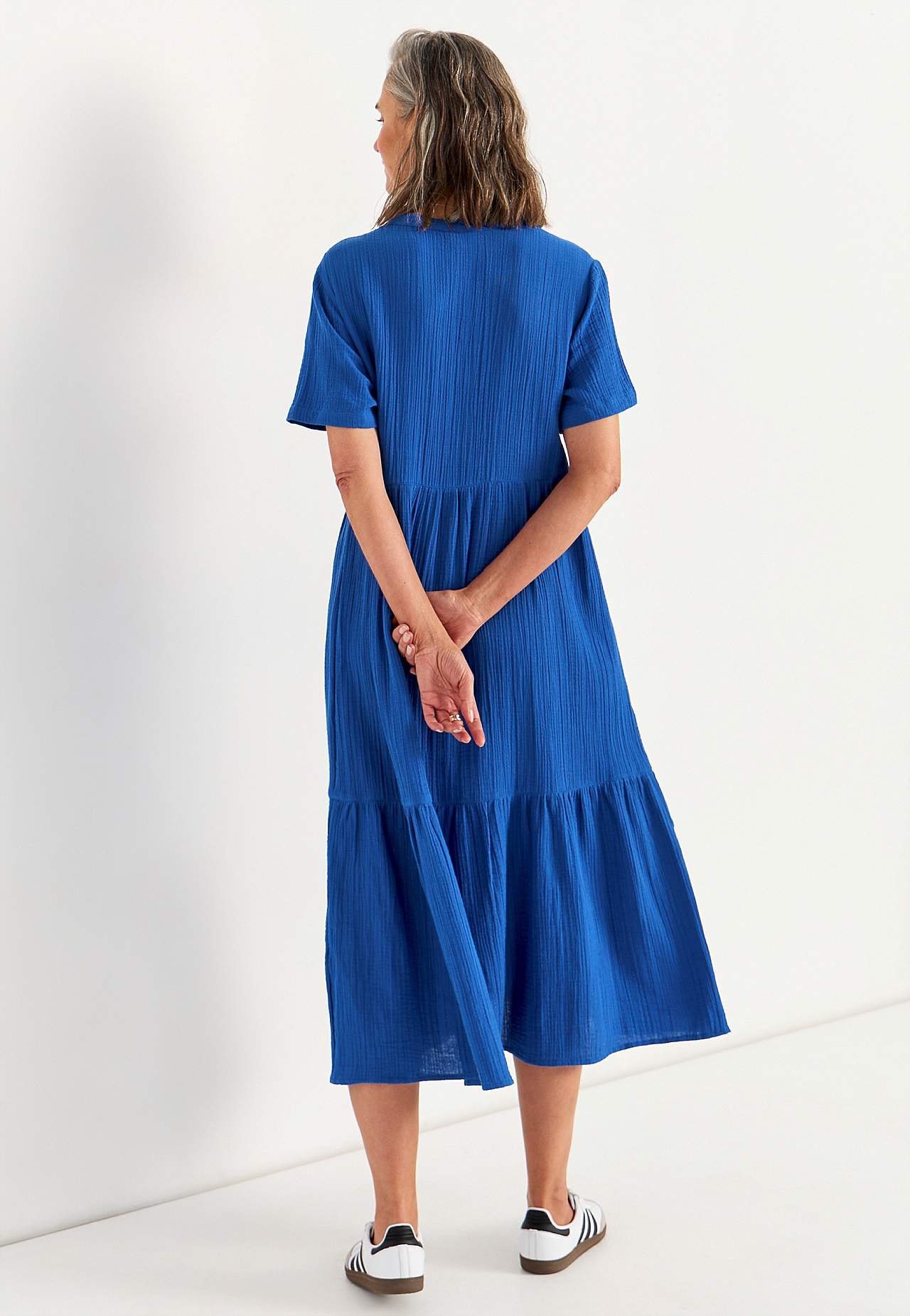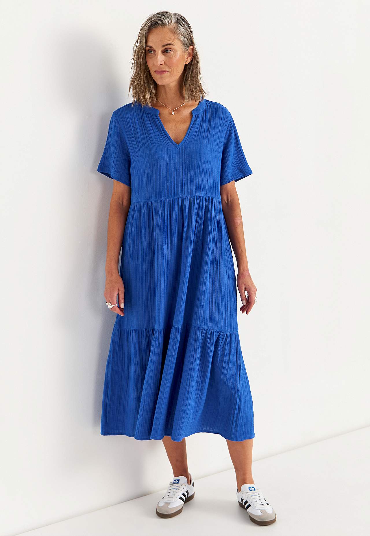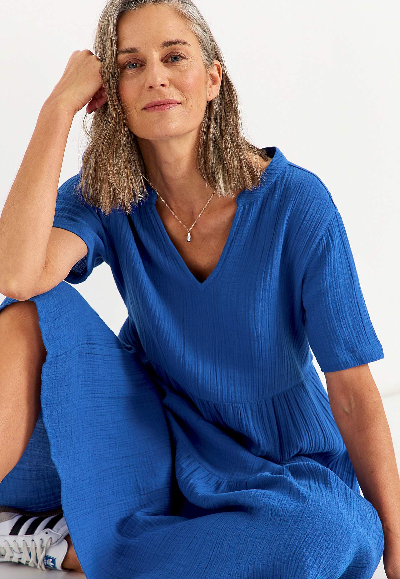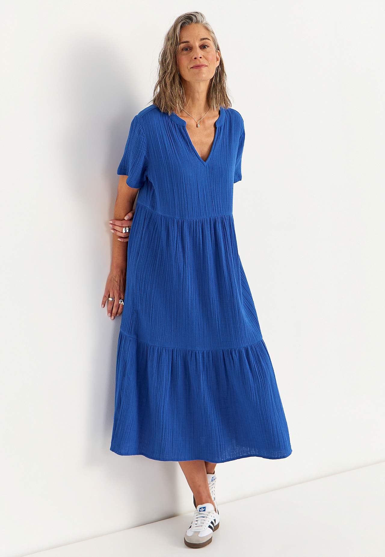 Röyhelömekko ihanasta puuvillamusliinista luonnollisella sommitelmalla. Kudottu, pehmeä materiaali ilmavalla, viileällä tuntumalla. Tilava istuvuus leveydellä alhaalla. Pyöreä pääntie pienellä v-kaula-aukolla. Lyhyet hihat. Sauma vyötäröllä. Röyhelö alhaalla. Suora helma. Takapituus koon mukaan n. 125 cm.