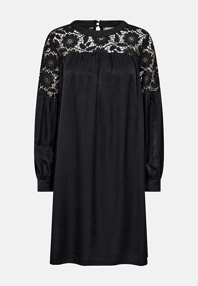 Kudottu mekko sekä kiiltävä että mattapintaisella pinnalla. Pyöreä pääntie kahdella napilla niskan takana. Kaunis pitsi olkapäissä ja ylhäällä. Tilava istuvuus. Pitkät hihat ohuella kalvosimella ja napilla hihansuissa. Suora helma. Pituus olkapäästä n. 92 cm koossa S (38).