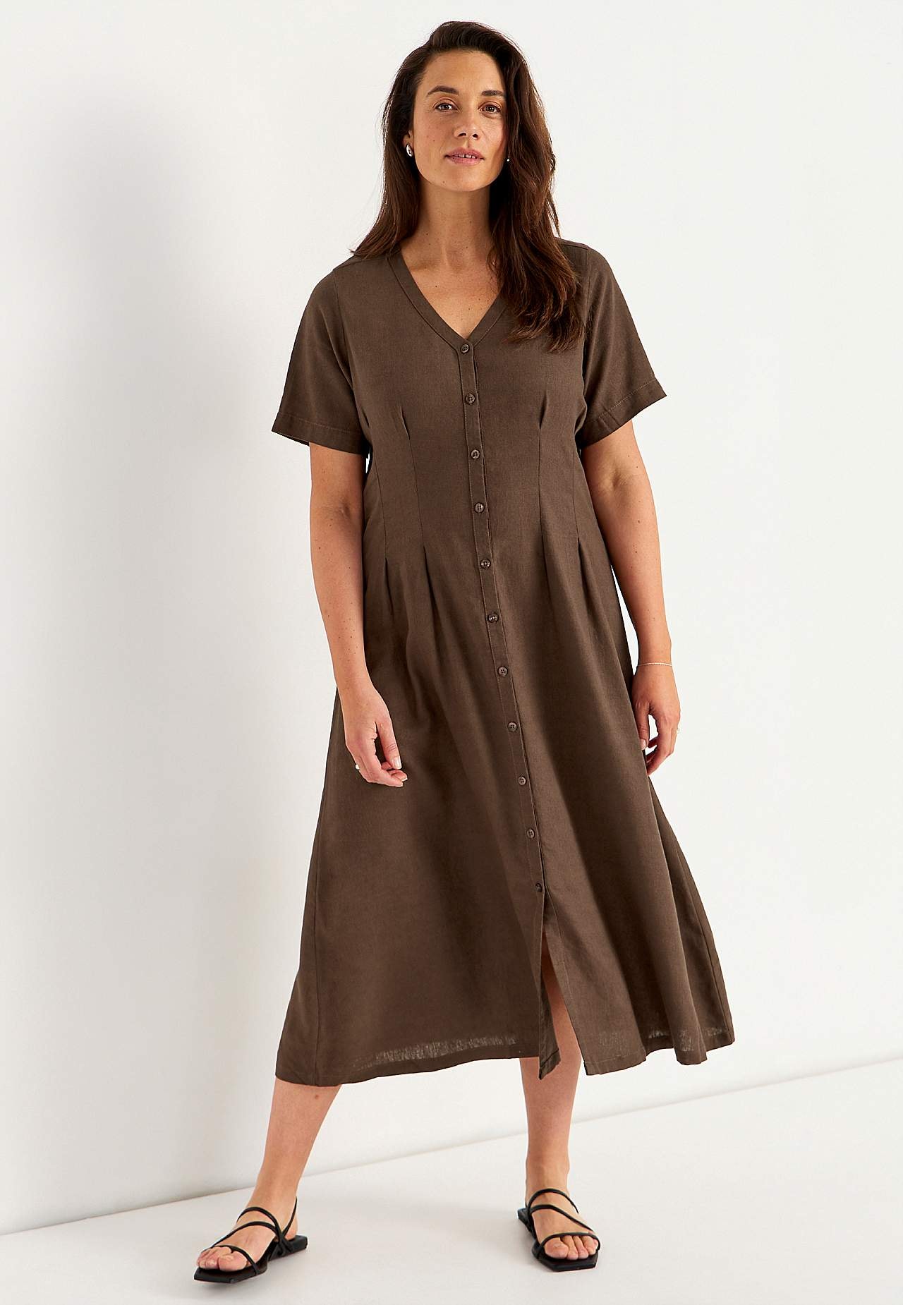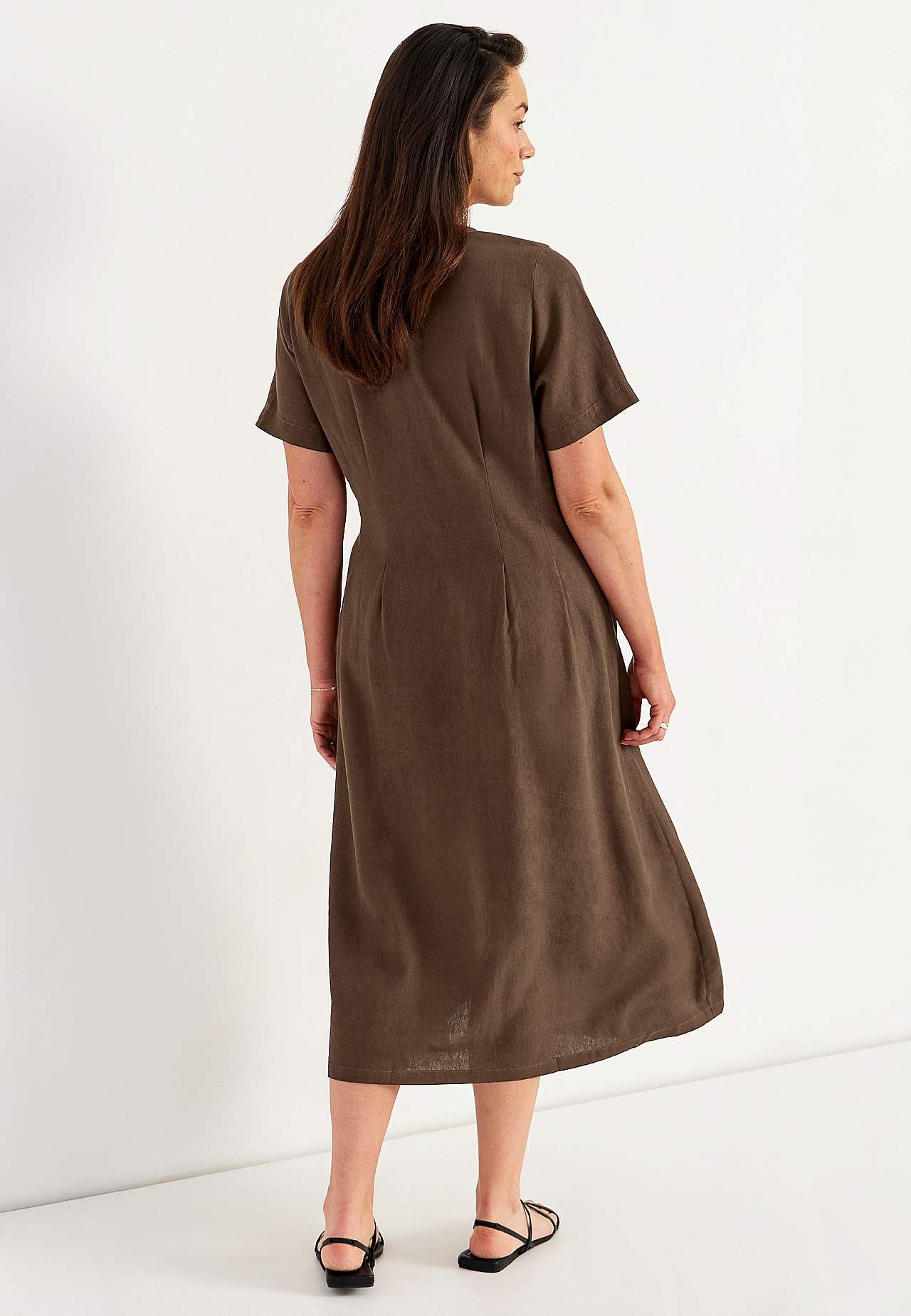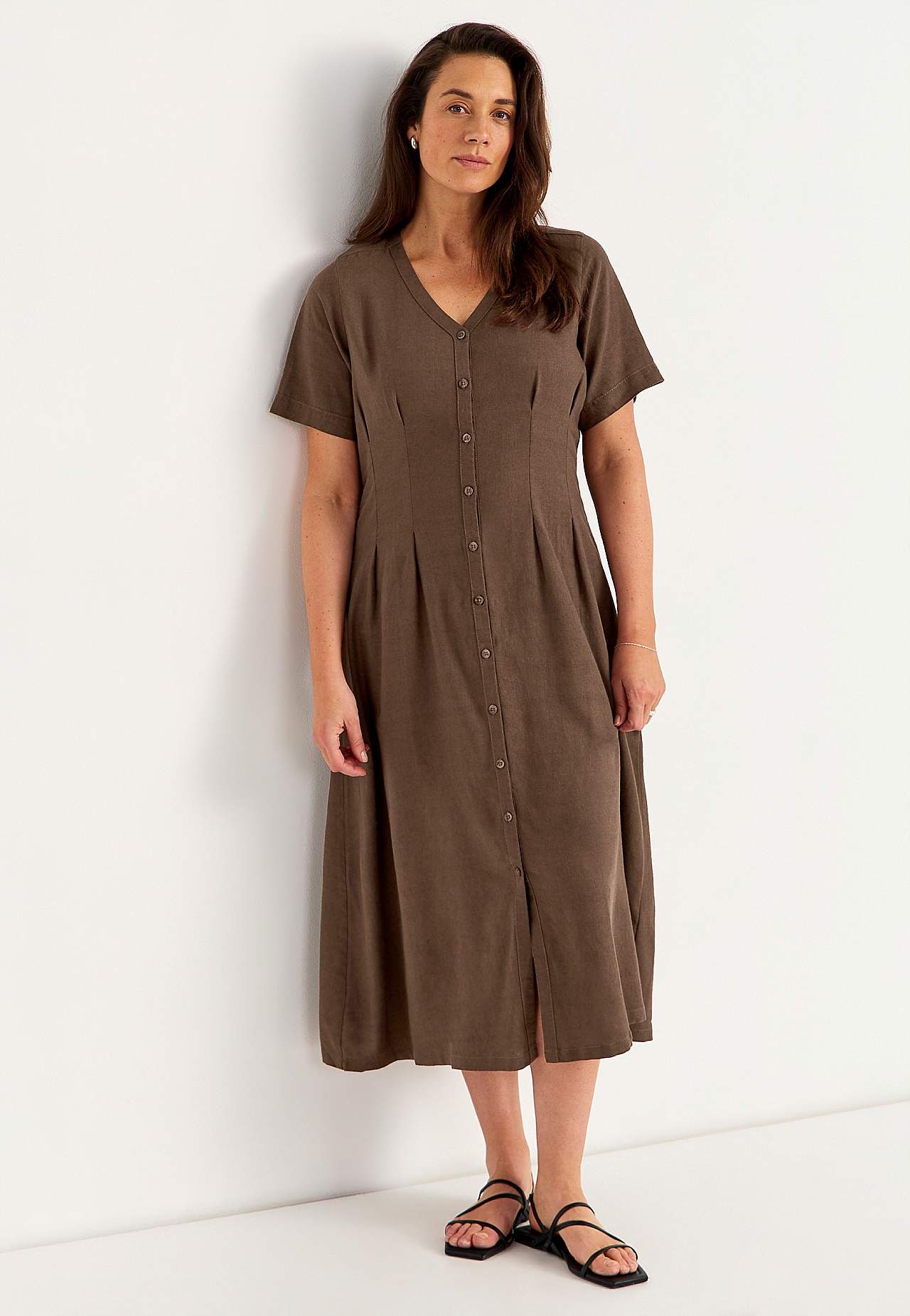 Kudottu mekko ilmavasta pellava-viskoosiseoksesta. Pehmeä, hieman raskaampi materiaali luonnollisella rakenteella. Normaali istuvuus. V-kaula-aukkoinen, napitettu malli. Lyhyet, leveät hihat. Hieman tyköistuva vyötärön kohdalla ja leveämpi hameosa. Koristeommelet edessä ja takana imartelevalla vekillä. Lievästi pyöristetty ... Lue lisää