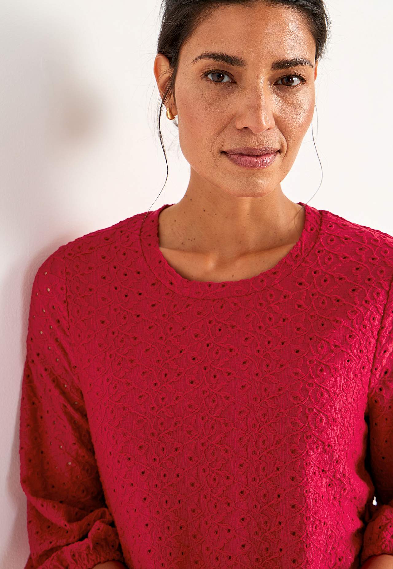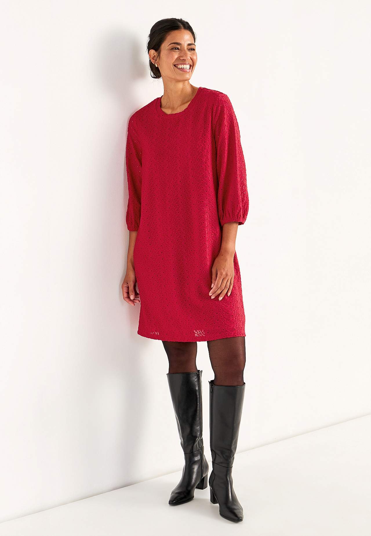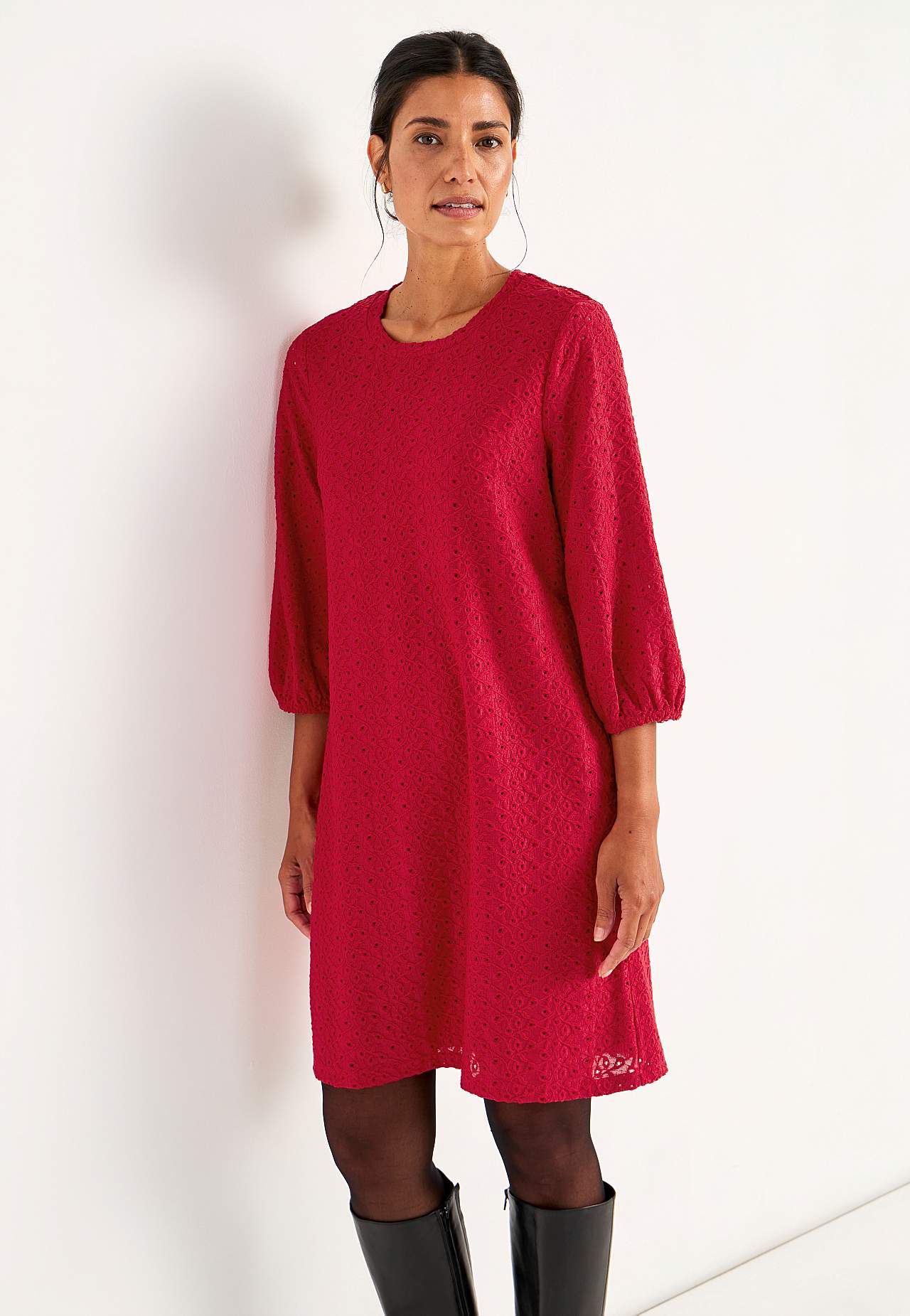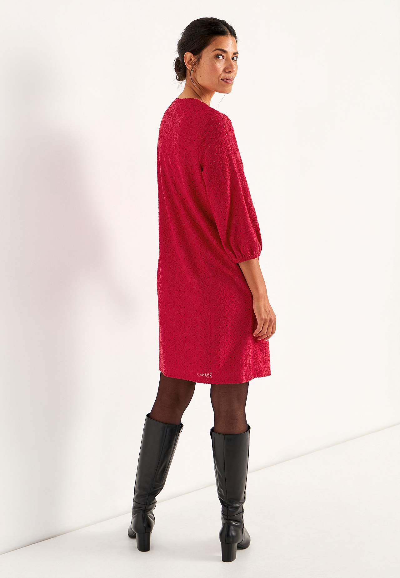 Kaunis mekko rei’ityksellä. Hieman a-linjainen istuvuus. Pyöristetty kaula-aukko. 3/4-pituiset puhvihihat joustavalla hihansuulla. Kiinniommeltu alusmekko joustavasta laadusta. Suora helma. Pituus olkapäältä koon mukaan noin 95-107 cm.