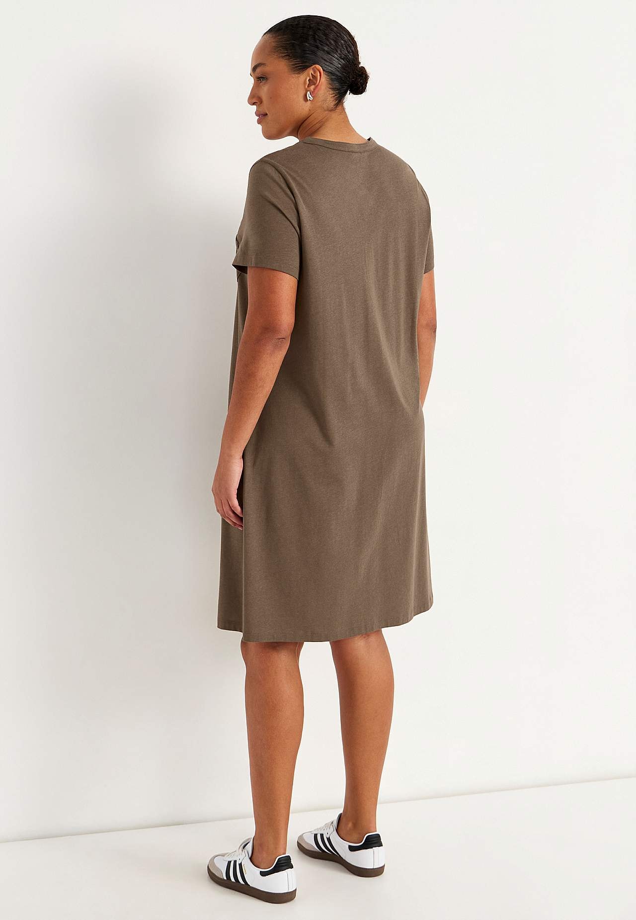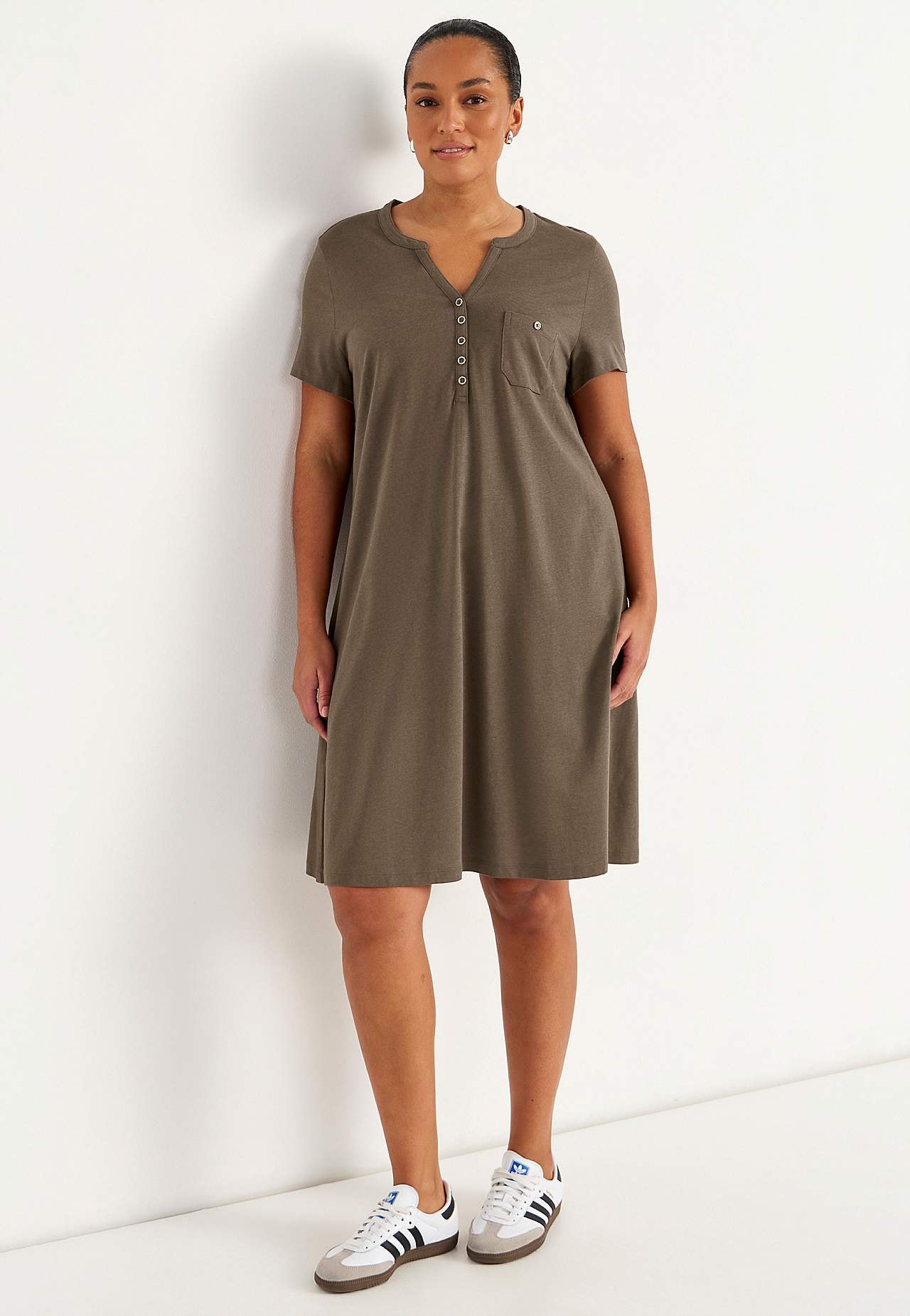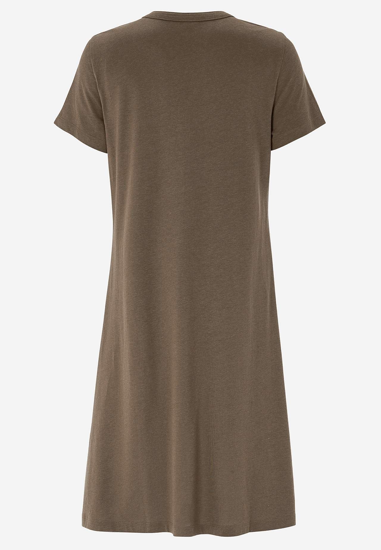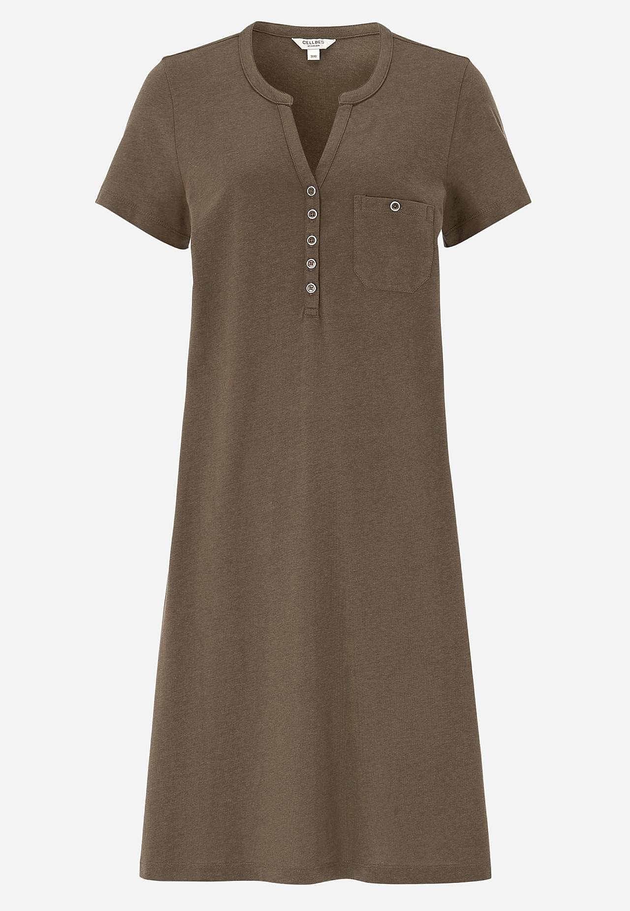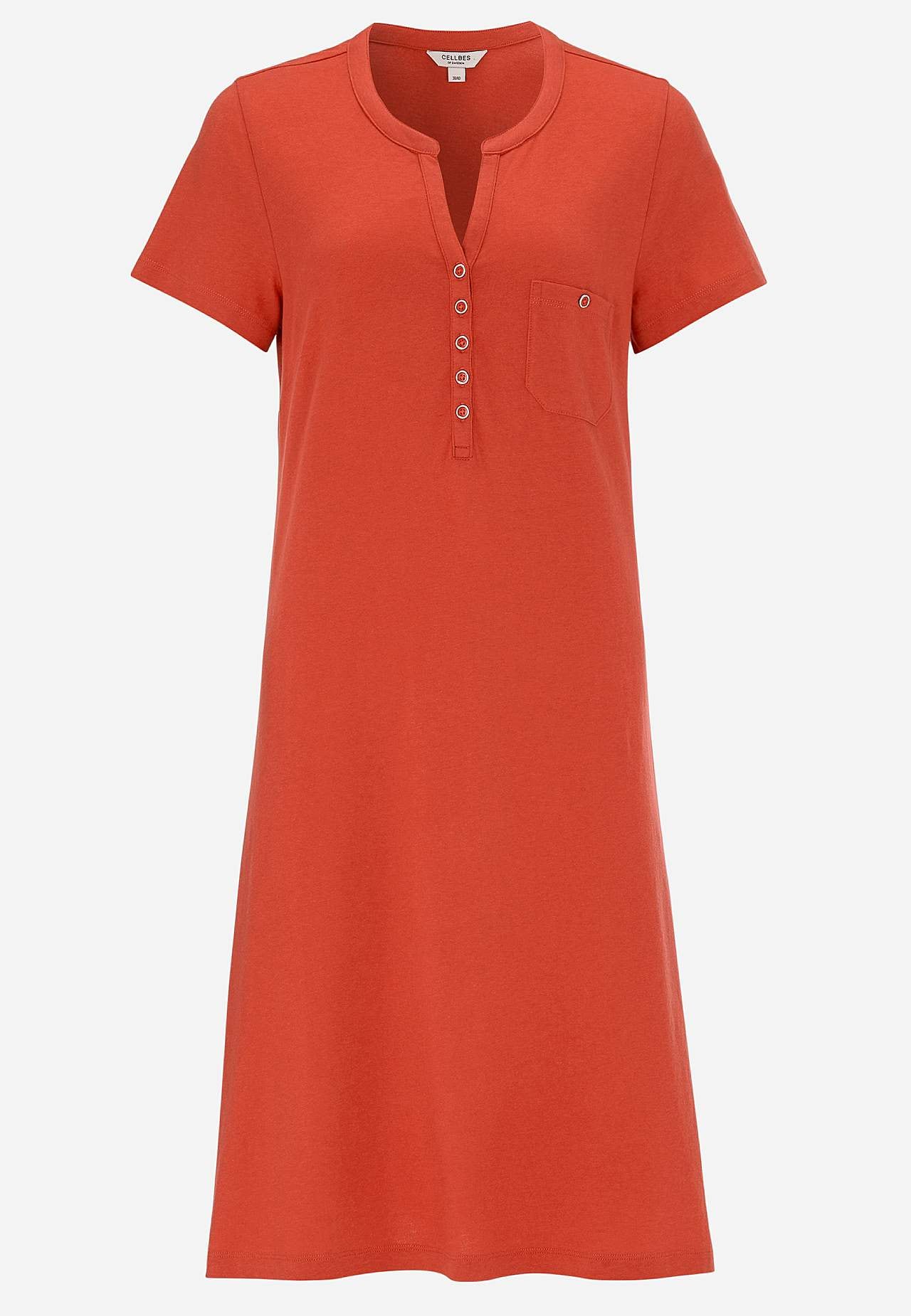 A-linjainen mekko lyhyillä hihoilla. Trikoo ihanan pehmeästä luomupuuvillasta ja modaalista. Pyöreä pääntie v-leikkauksella ja nappilistalla. Pieni rintatasku napilla. Laskos rintamuksessa. Lievästi pyöristetty helma. Pituus olkapäältä koon mukaan noin 97-114 cm.