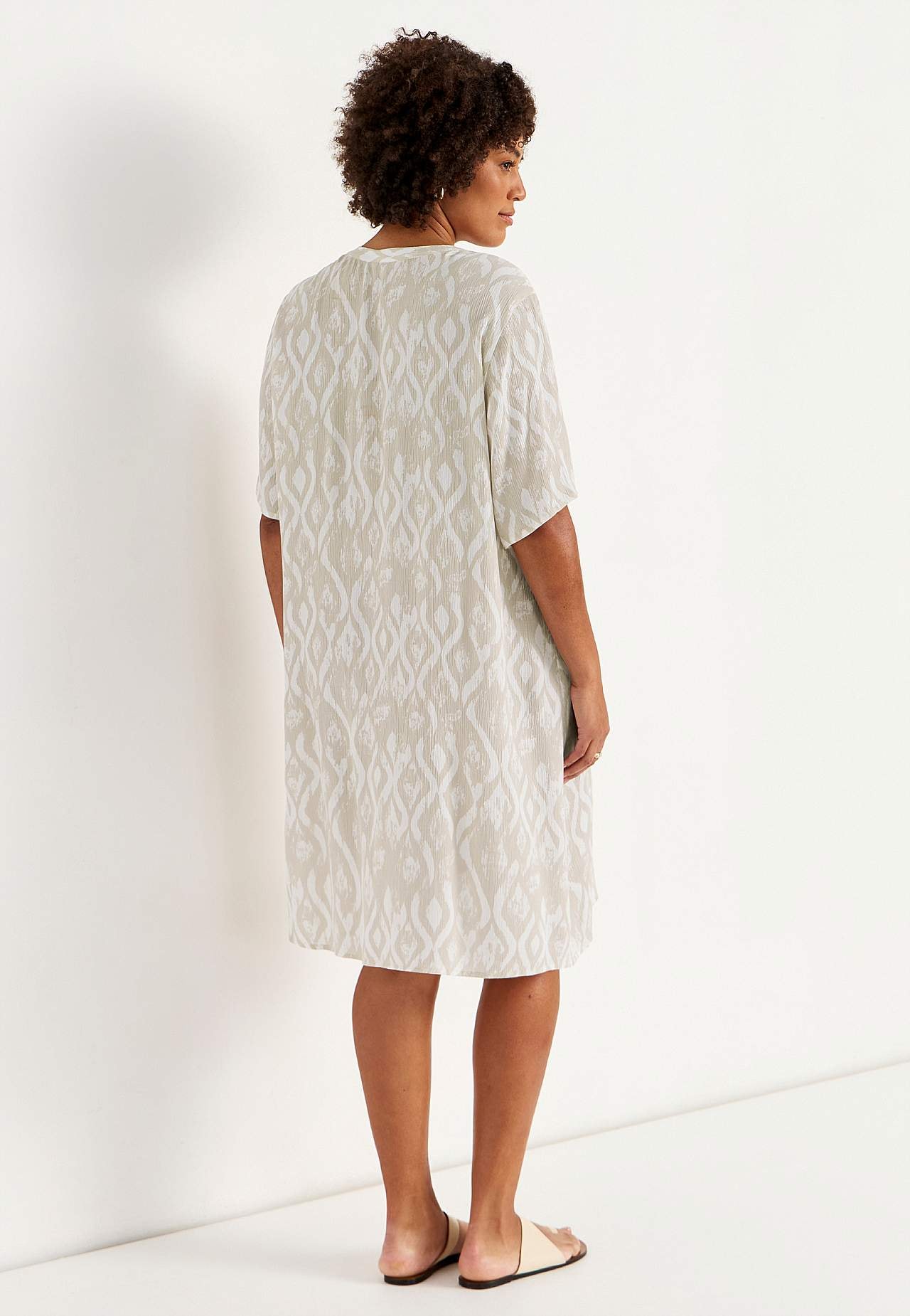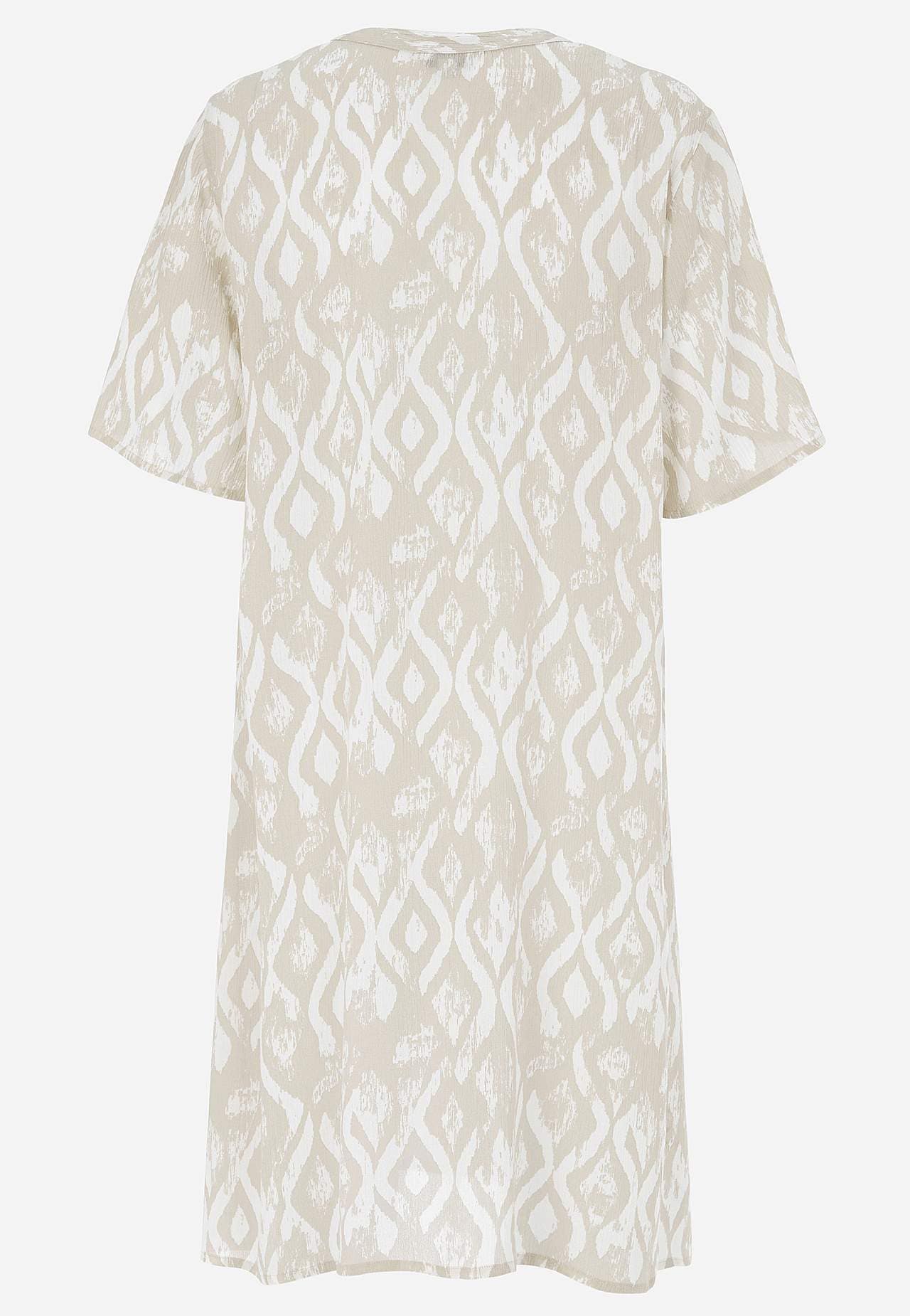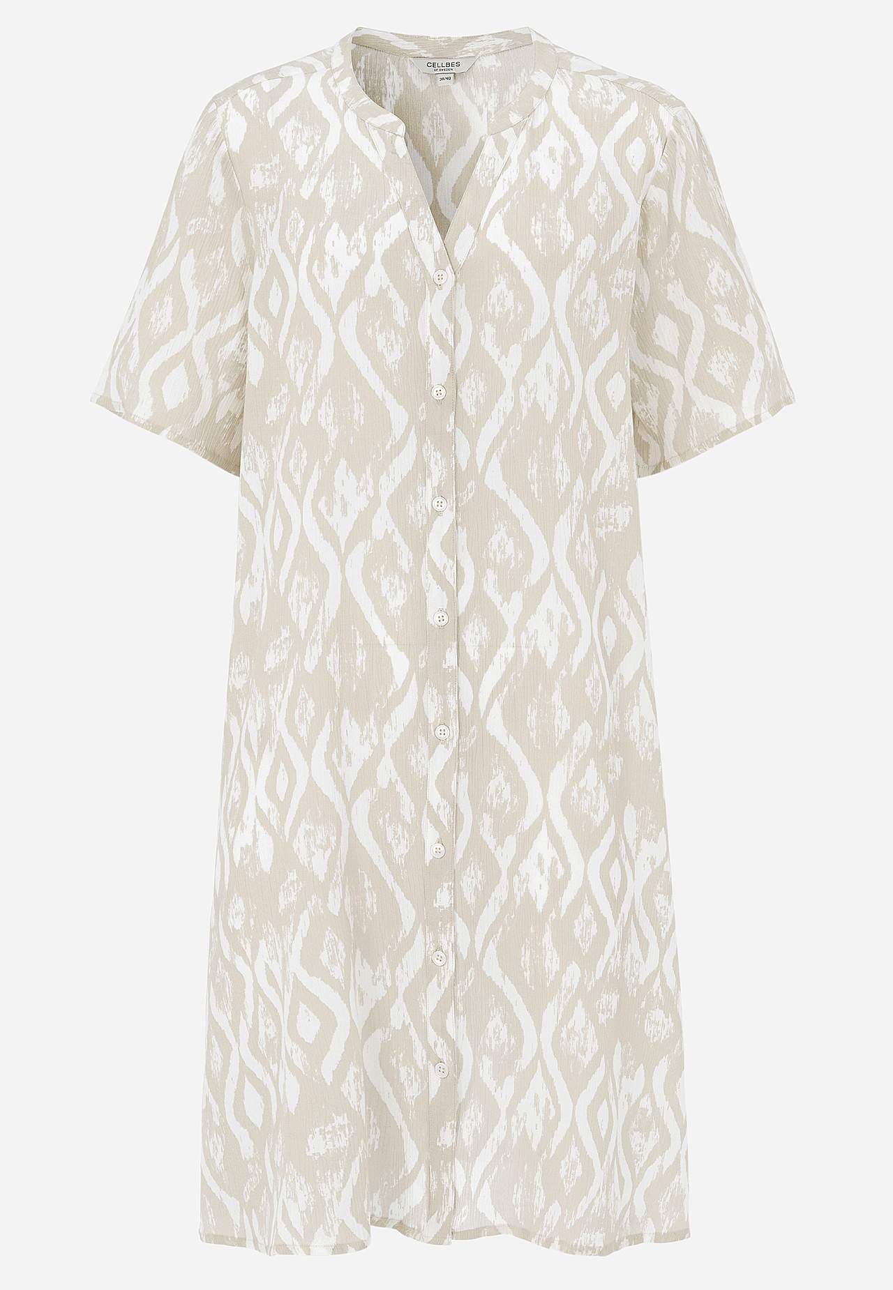 Ilmava, viileä materiaali matalla pinnalla ja kivalla sommitelmalla. A-linjainen, hieman väljempi istuvuus. Nappikiinnitys edessä. Lyhyet hihat. Takapituus koon mukaan n. 97-105 cm.