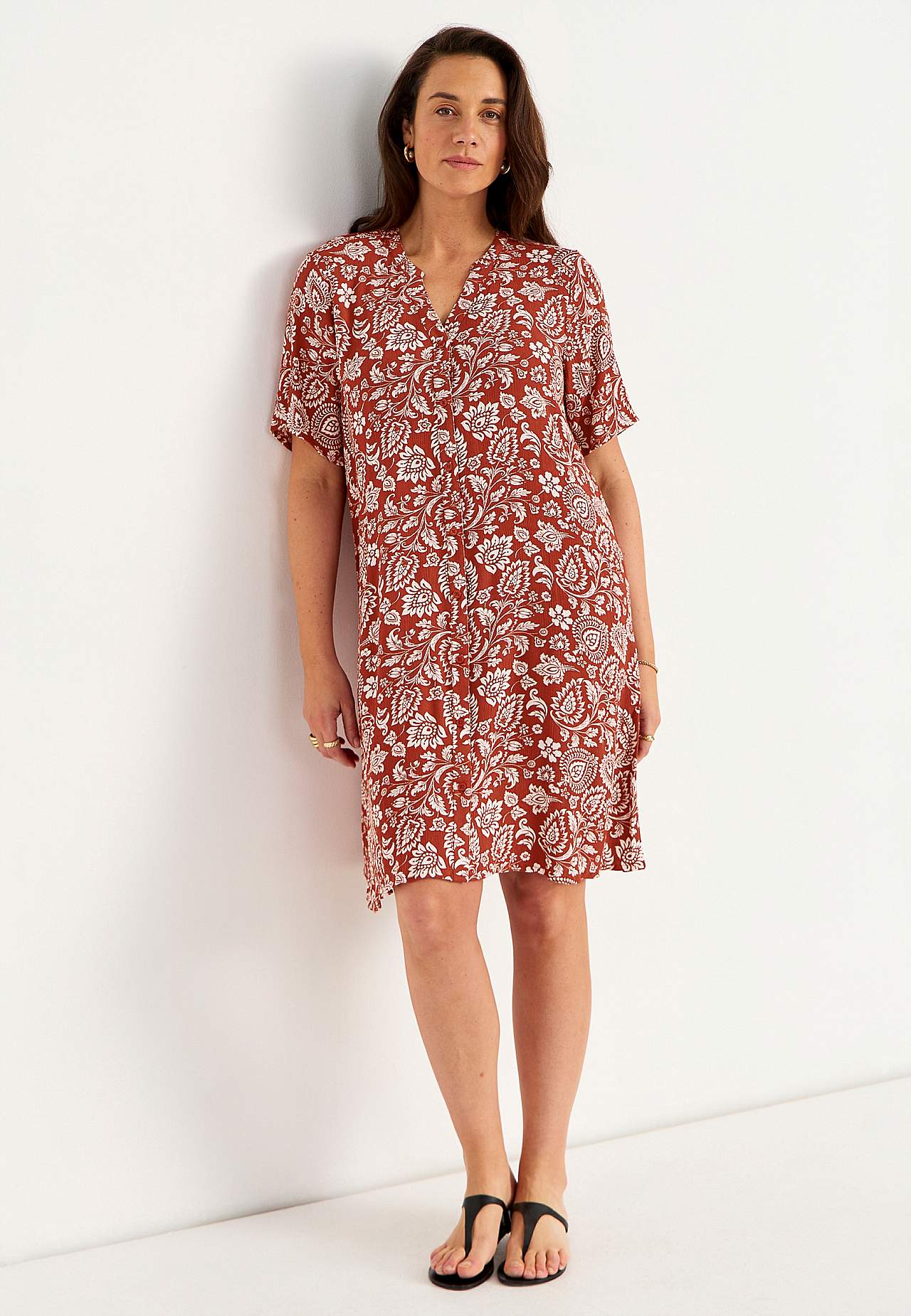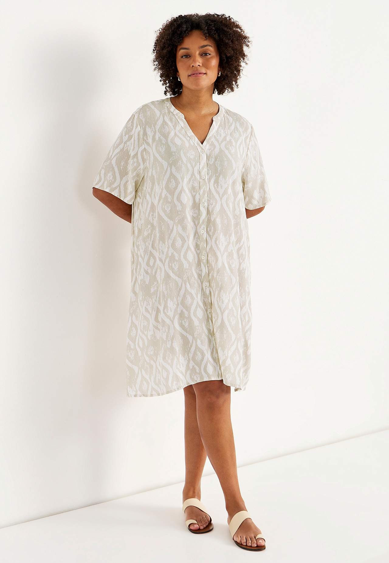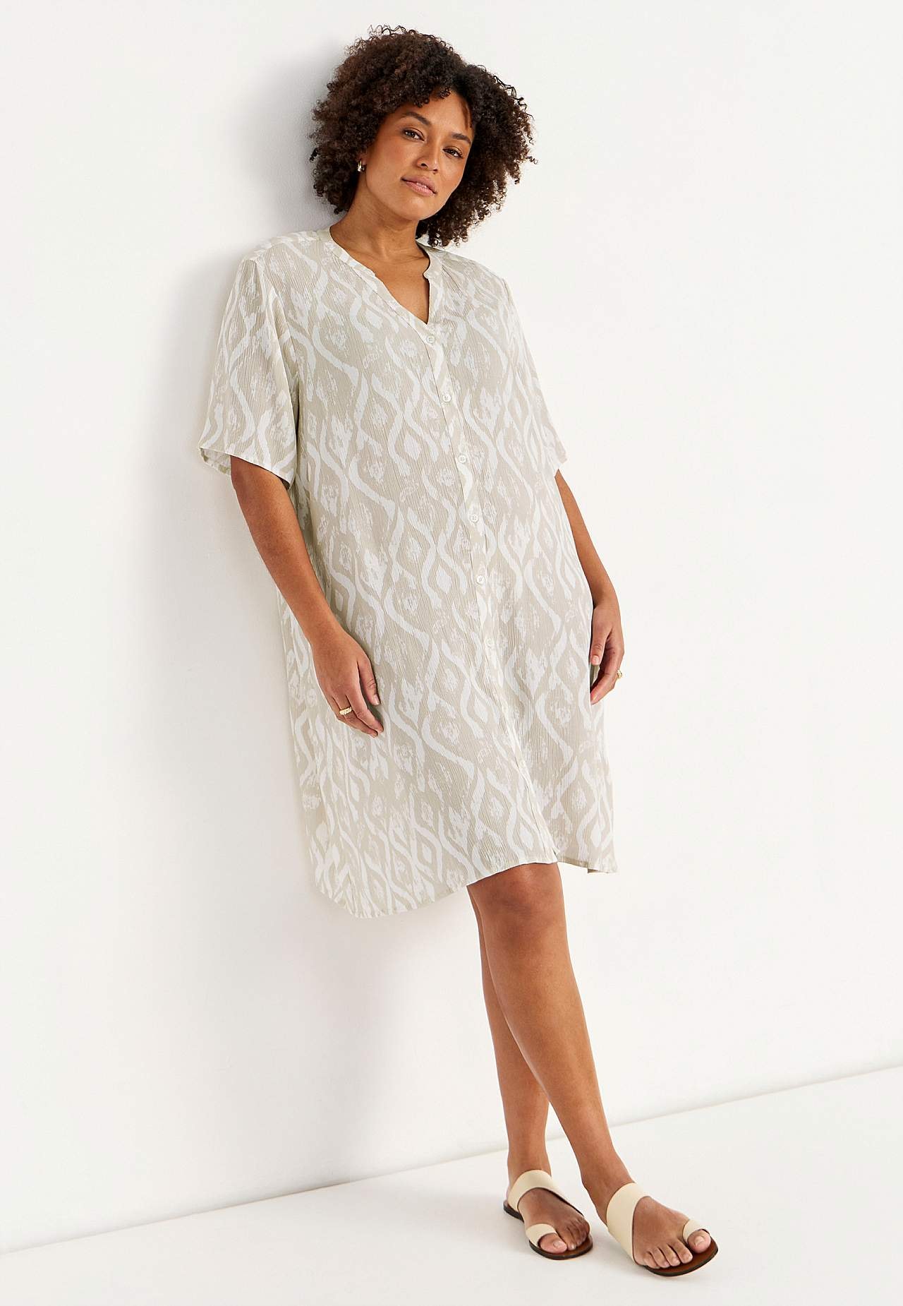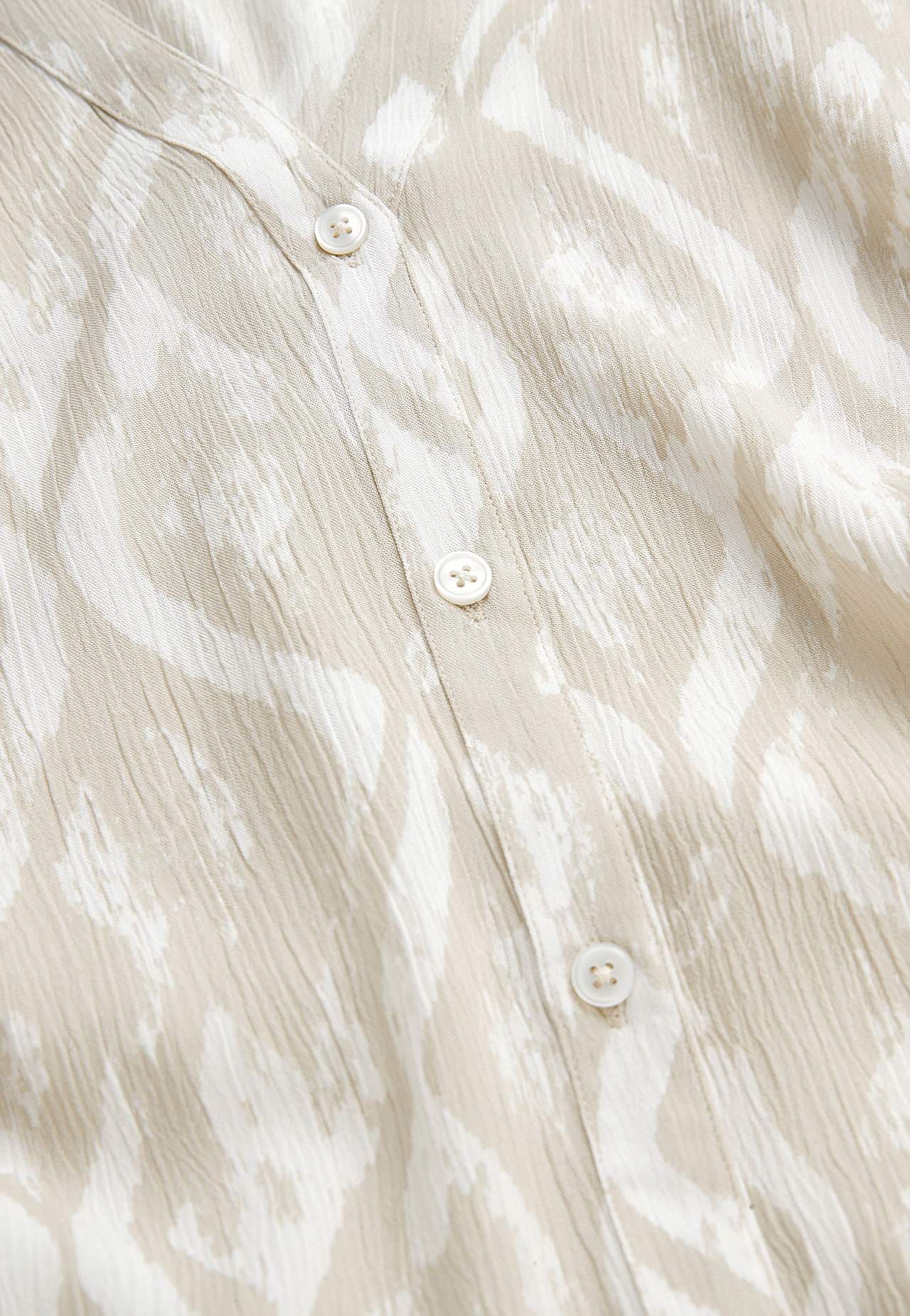Ilmava, viileä materiaali matalla pinnalla ja kivalla sommitelmalla. A-linjainen, hieman väljempi istuvuus. Nappikiinnitys edessä. Lyhyet hihat. Takapituus koon mukaan n. 97-105 cm.